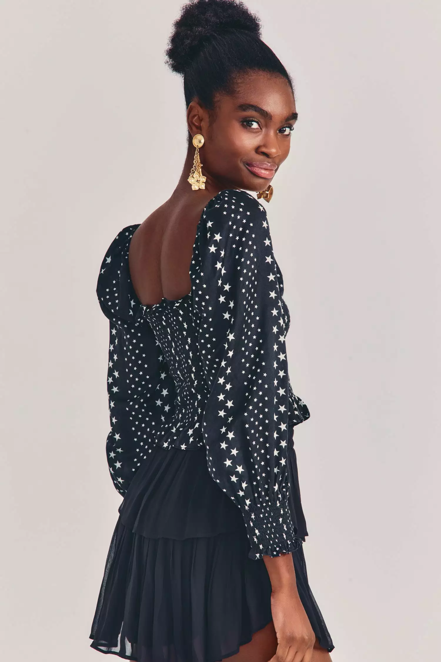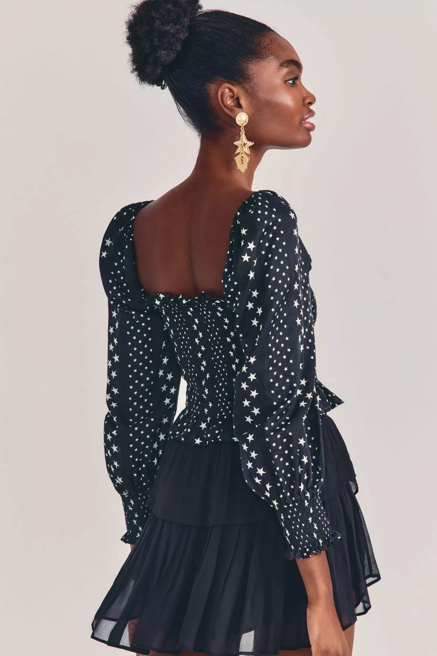 Meet our Russell Top, brand new in a cotton-silk blend with a scaled stars and stripes print. Skies the limit in this semi-cropped top with a wide open, elastic-encased neckline (worn on- or off-the-shoulder). The puffed sleeves finish with smocked cuffs at opening, mirrored by the smocked bodice. Pair it with our Ruffle Mini Skirt. Shown here in Black Satin.