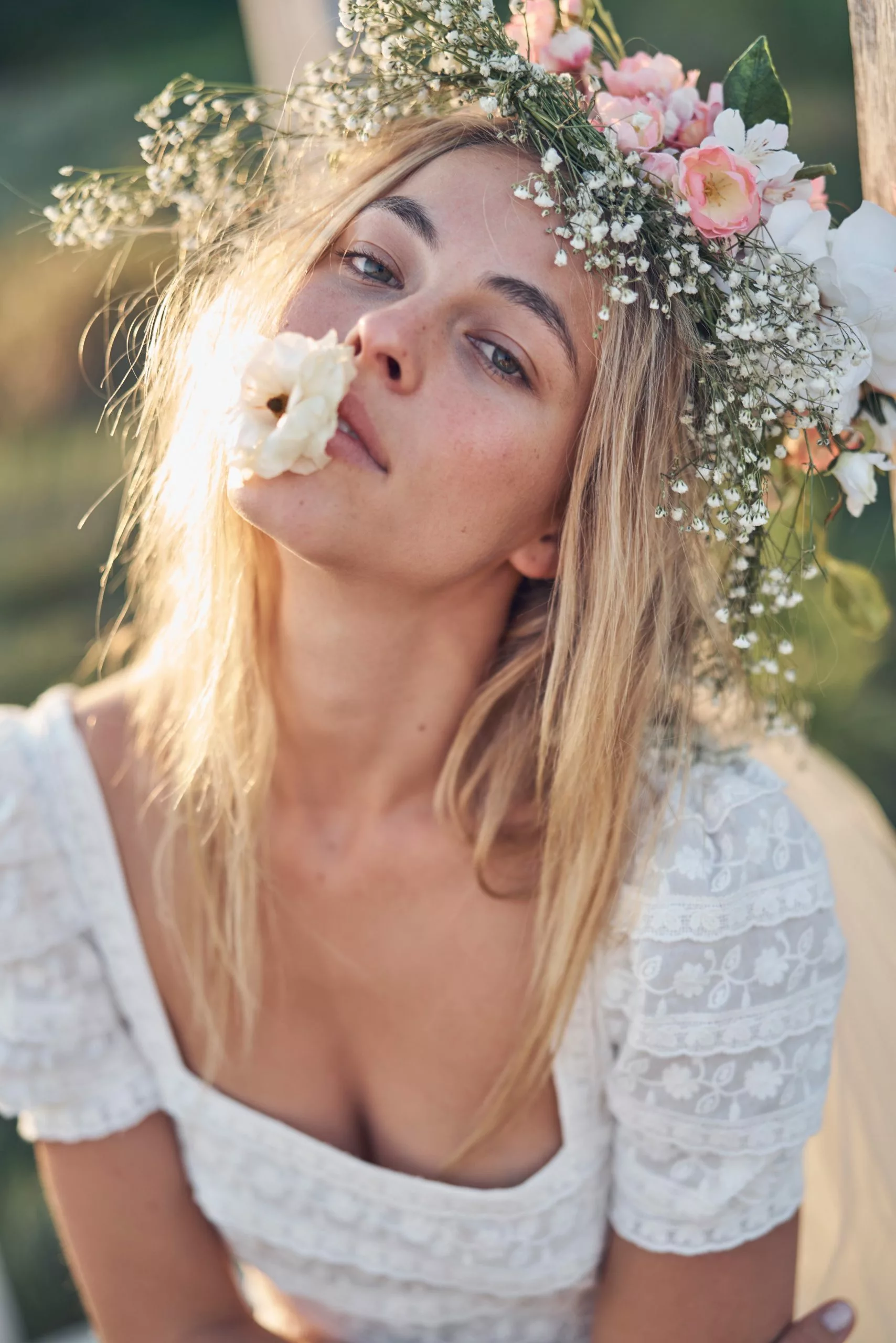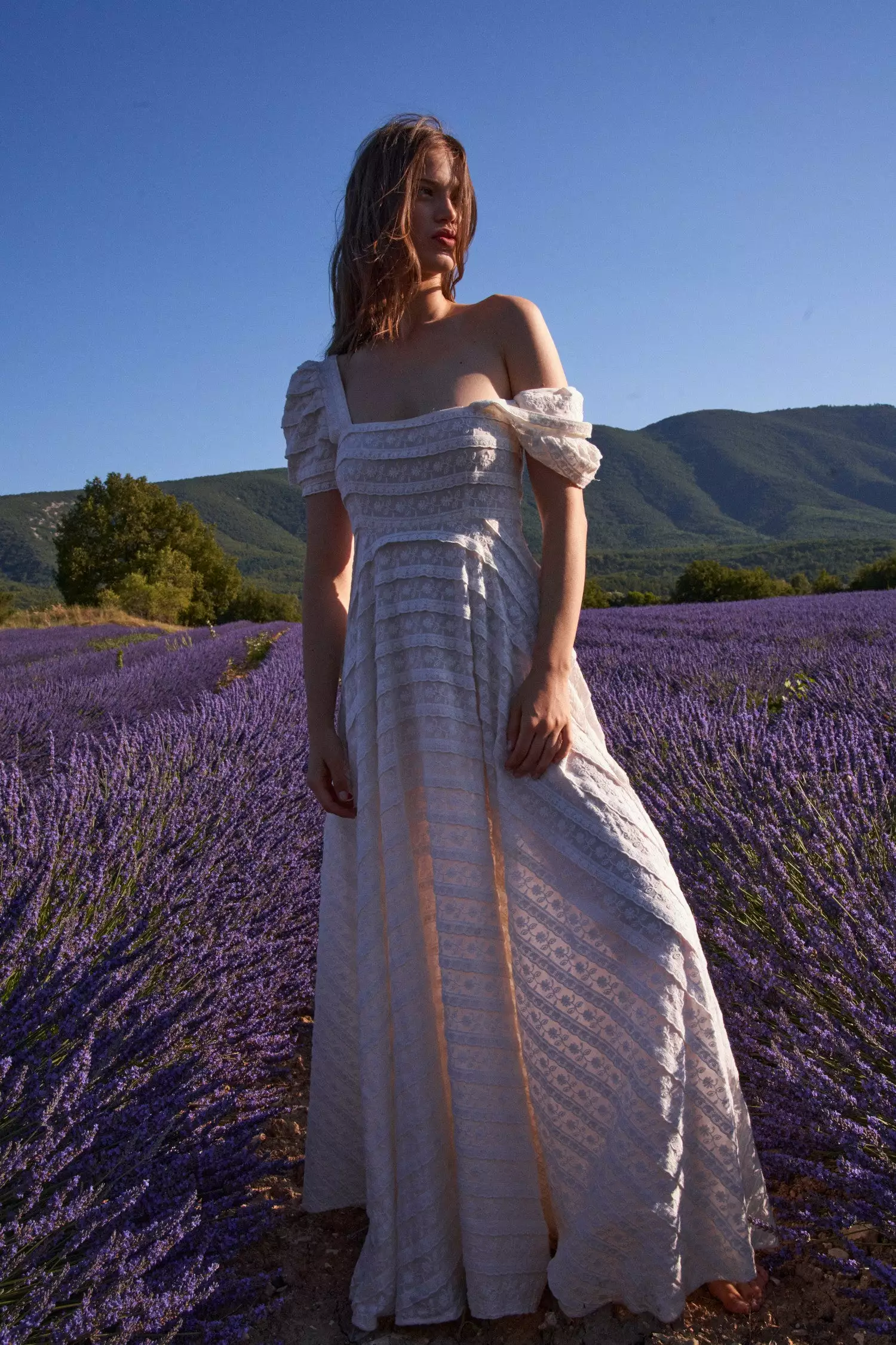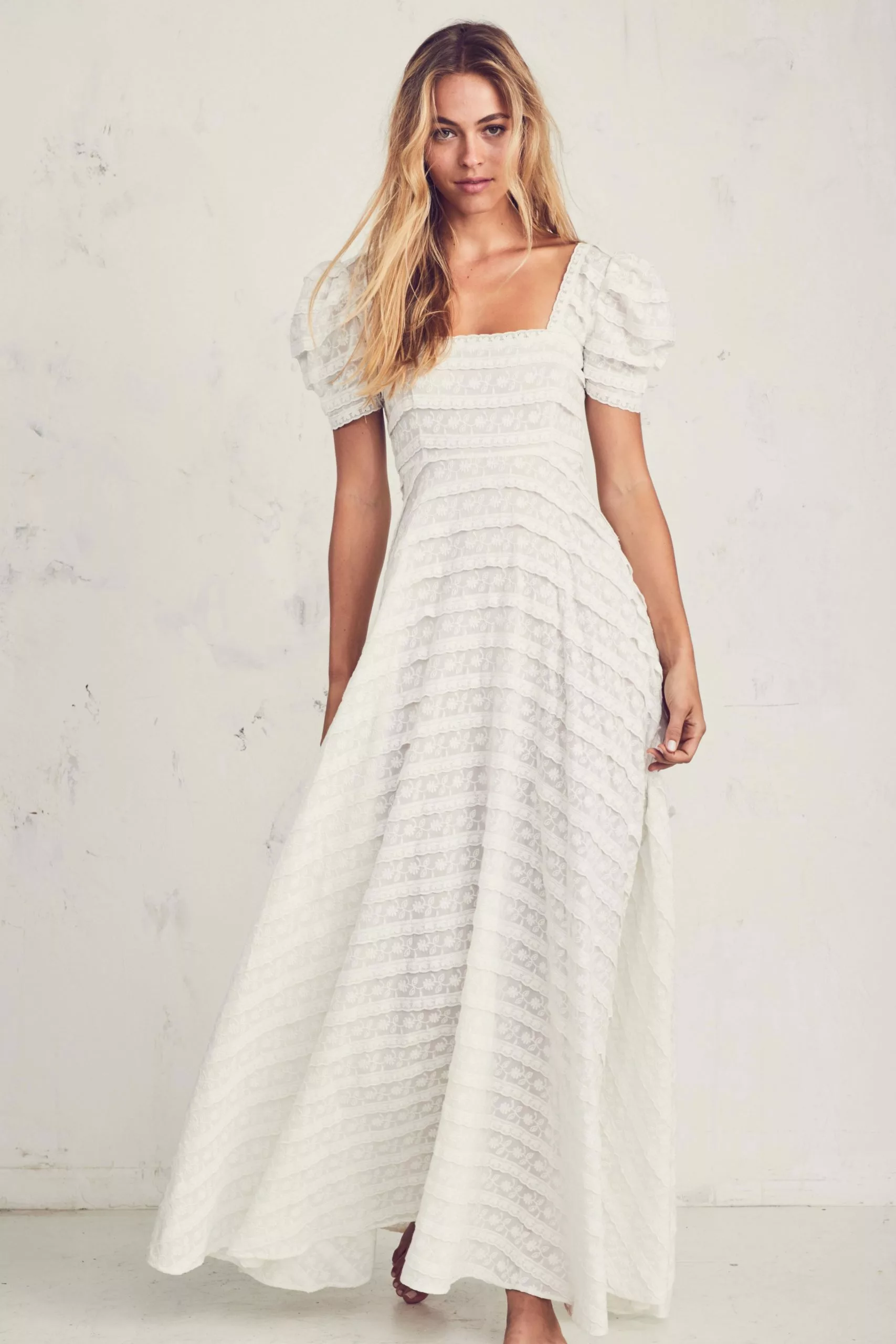 Our Ryan Dress in Catalina Lace is romantic and playful, designed with alternating rows of embroidered floral motifs and scalloped lace trim. This forever favorite features a square lace neckline with a fitted bodice and short puff sleeves. Elegant at all angles, the high waisted skirt opens up with full sweeping drama. Removable slip included. Shown here in Ivory.
