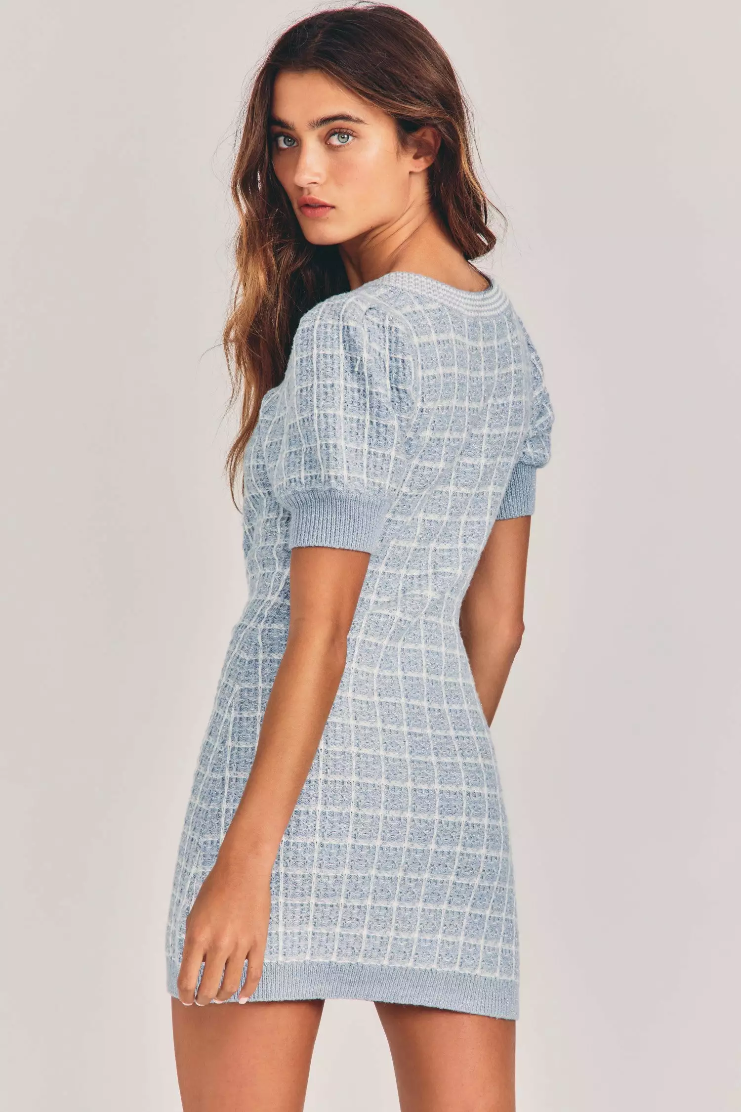 Get on board with our Sailor Dress in our new gold lurex tweed. This festive frock features a scoop neck with a striped border, functional gold lurex-wrapped buttons partway down center front, decorative breast pockets and pleated puffed sleeves with ribbed cuffs, mirrored at bottom hem. Pair it with our Rollins Jacket.