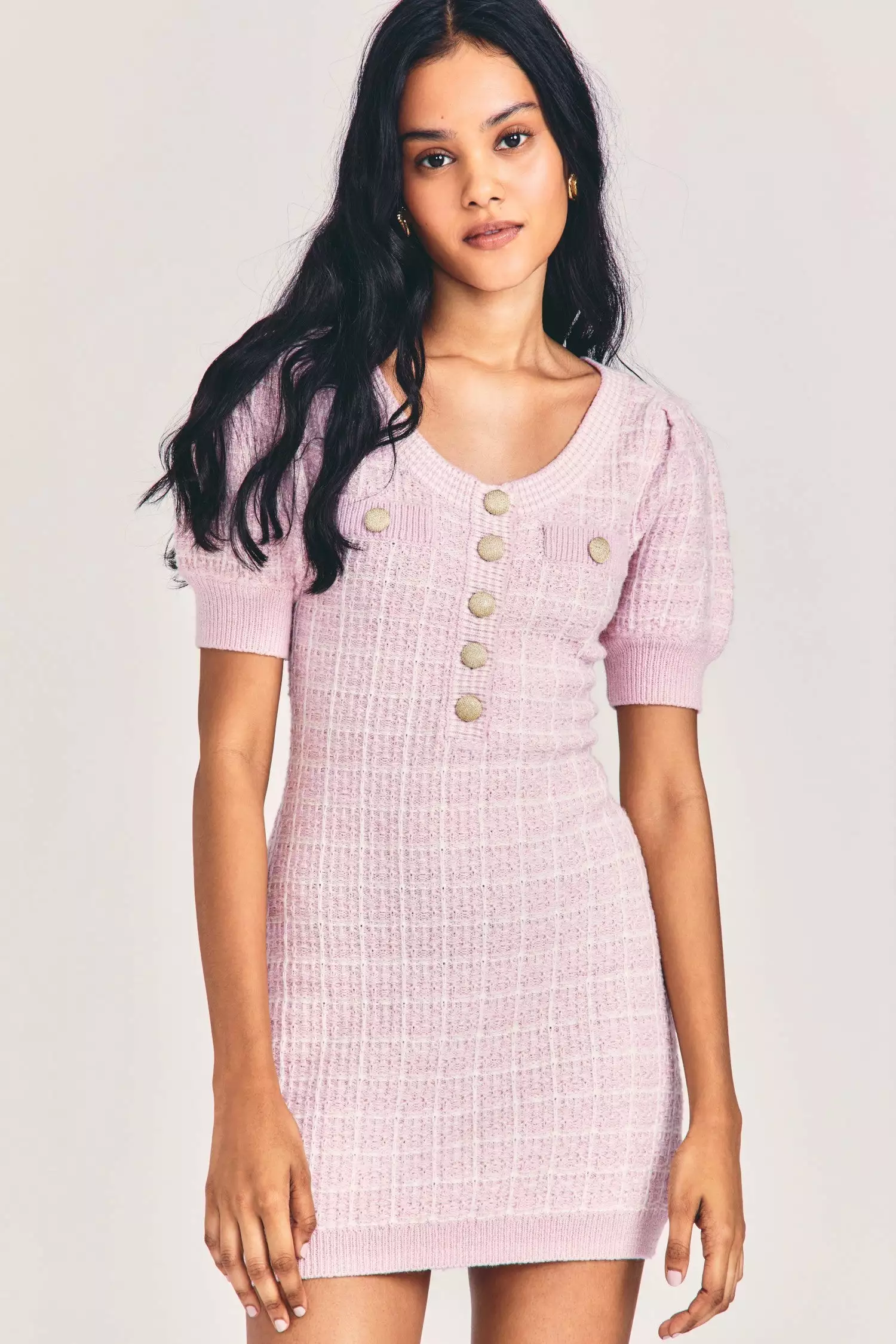 Get on board with our Sailor Dress in our new gold lurex tweed. This festive frock features a scoop neck with a striped border, functional gold lurex-wrapped buttons partway down center front, decorative breast pockets and pleated puffed sleeves with ribbed cuffs, mirrored at bottom hem. Pair it with our Rollins Jacket.