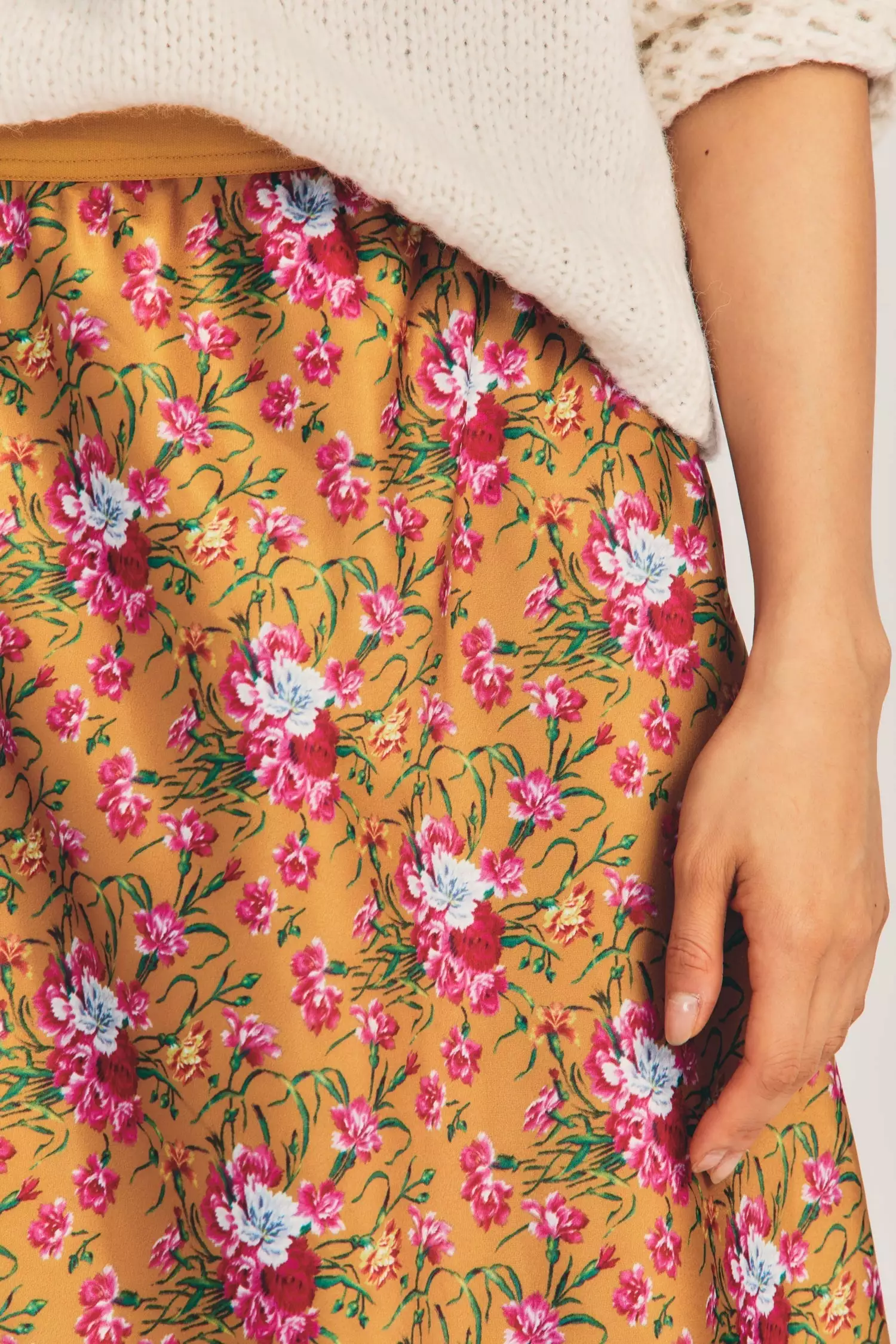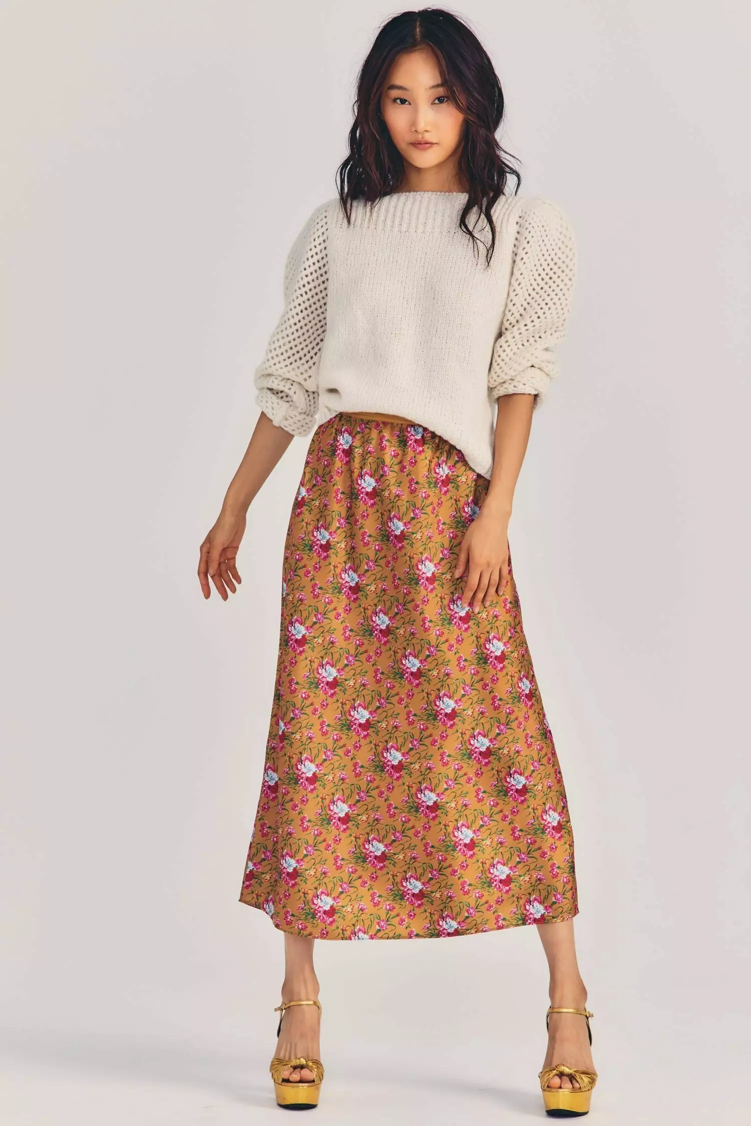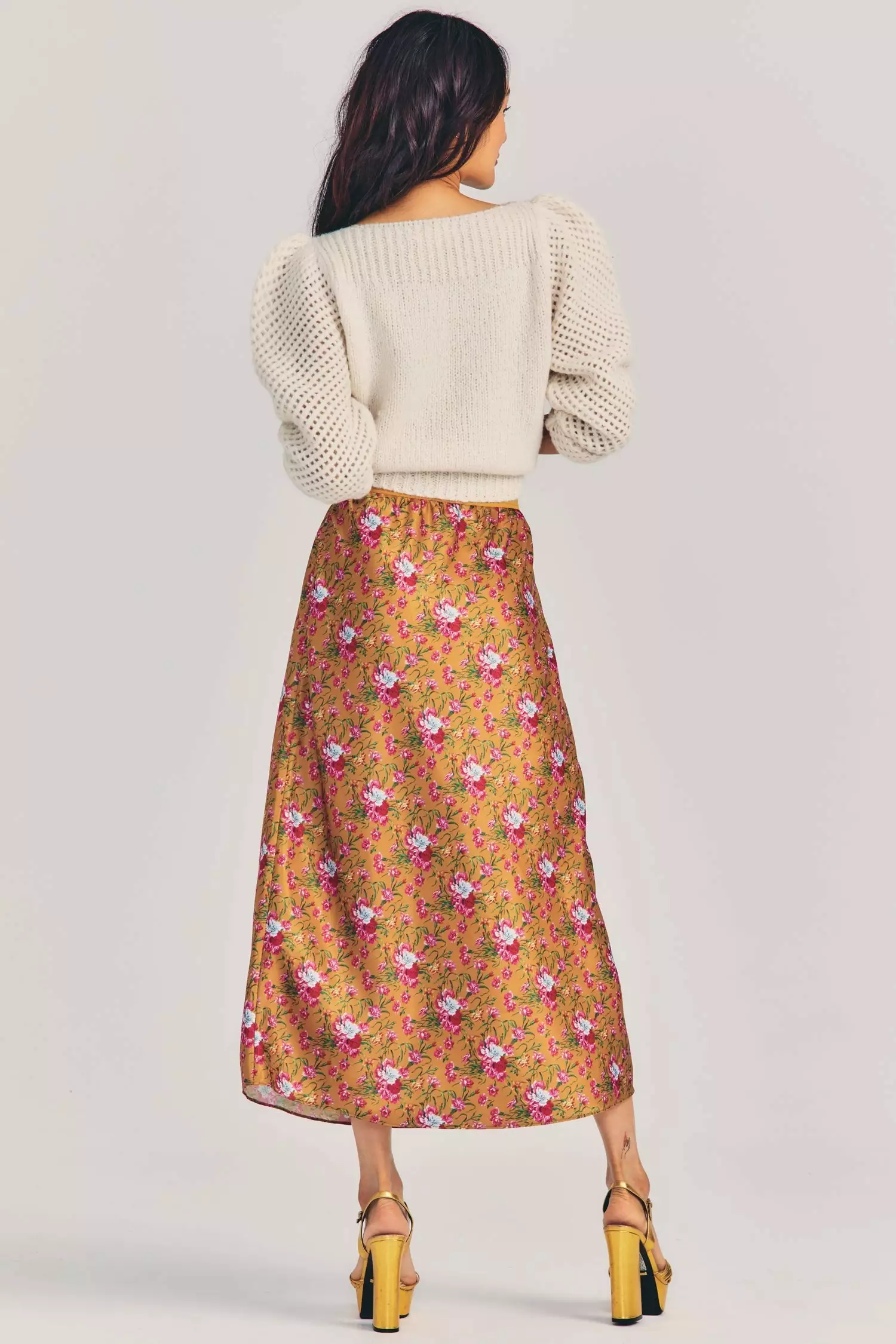 Our Aimee Skirt is reimagined with a French textile-inspired ribbon-tied bouquet print. This silky skirt has an elastic waistband, a slim silhouette and a midi-length. Wear it with our Avignon Cropped Cardigan.