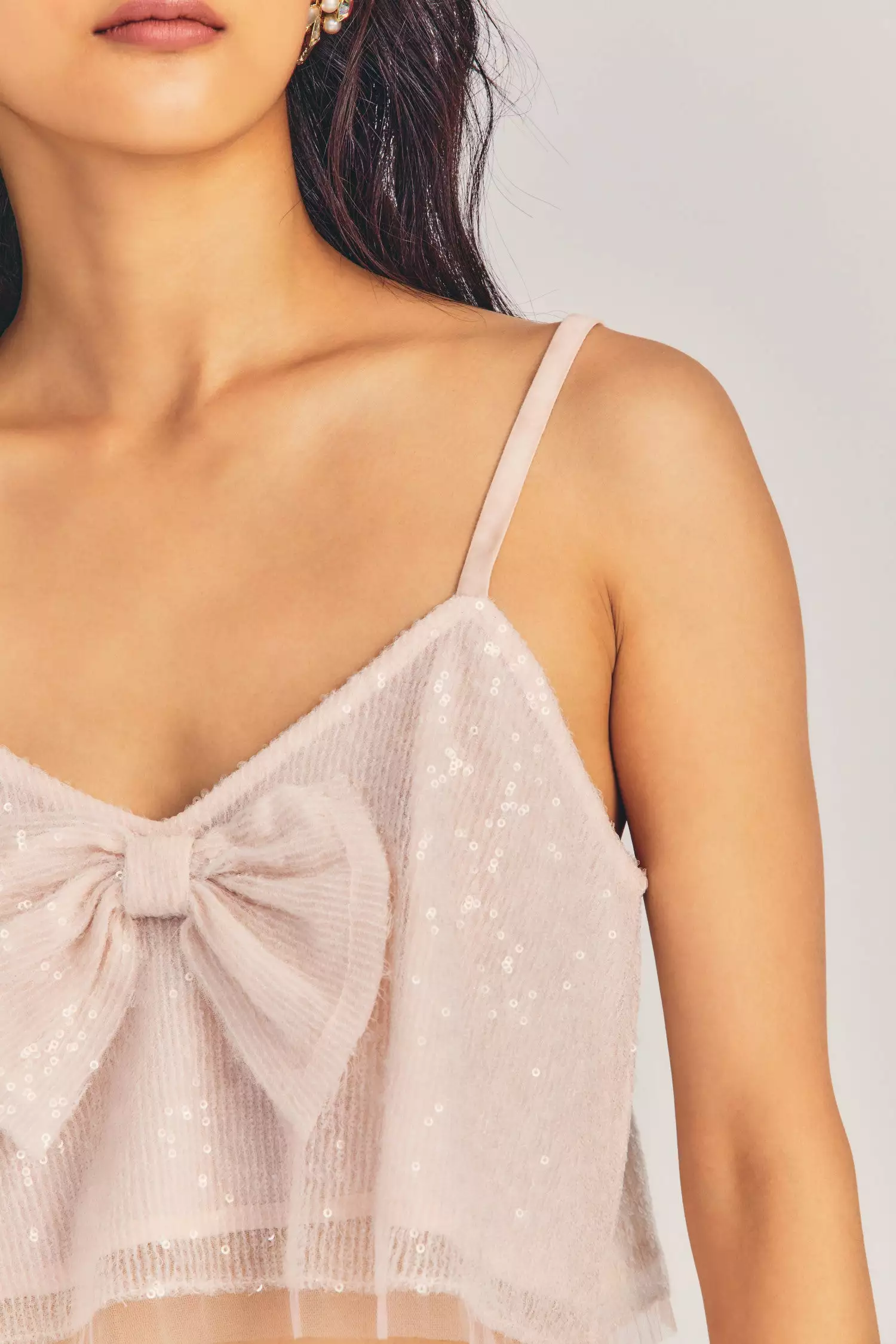 Our Annalisa Cropped Top shimmers with iridescent sequins on ribbed gauze. This cotton candy cropped top has adjustable straps, a statement bow detail center front and raw edges. Wear it as a pair with our Mirella Maxi Skirt. Shown here in Seashell Pink.