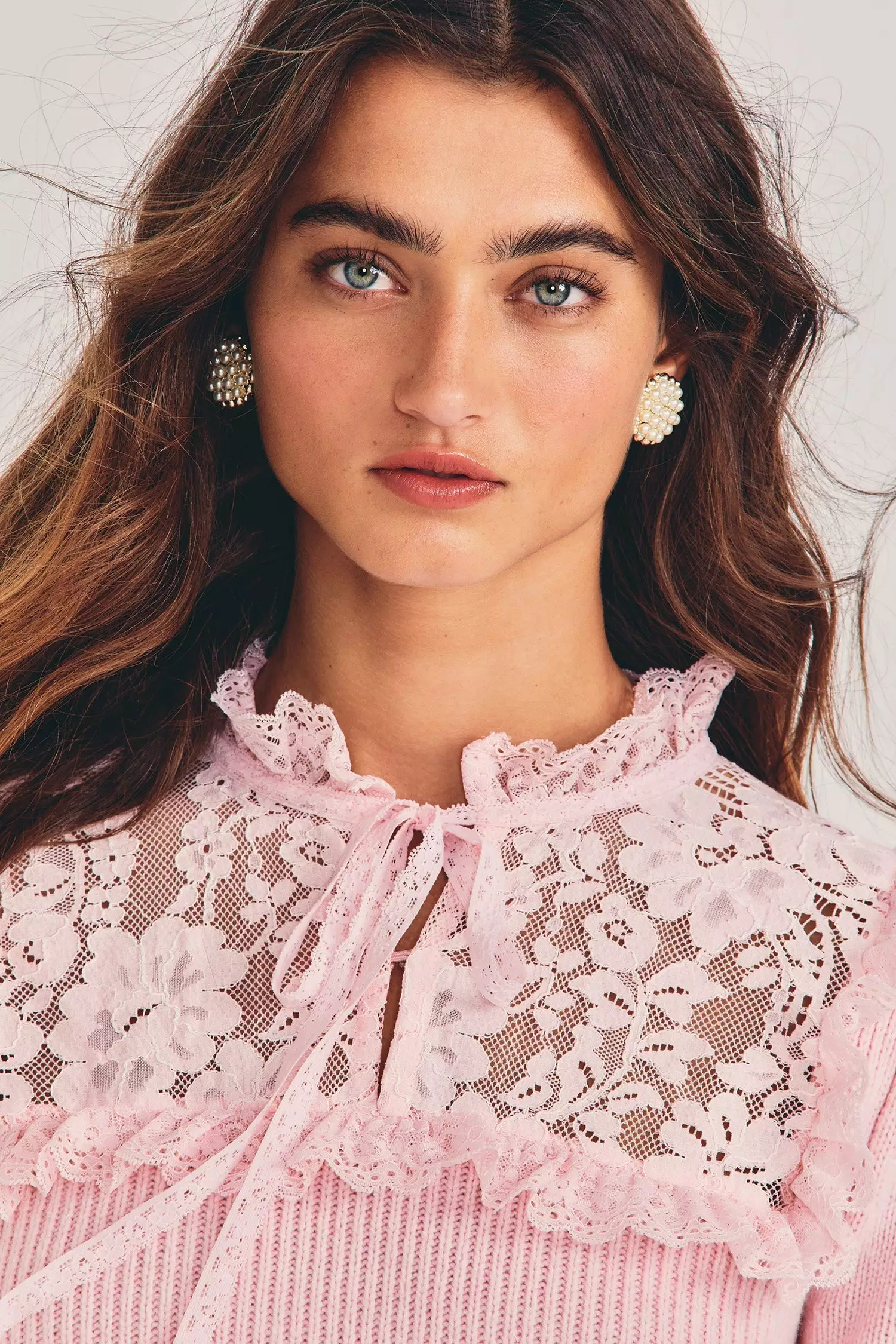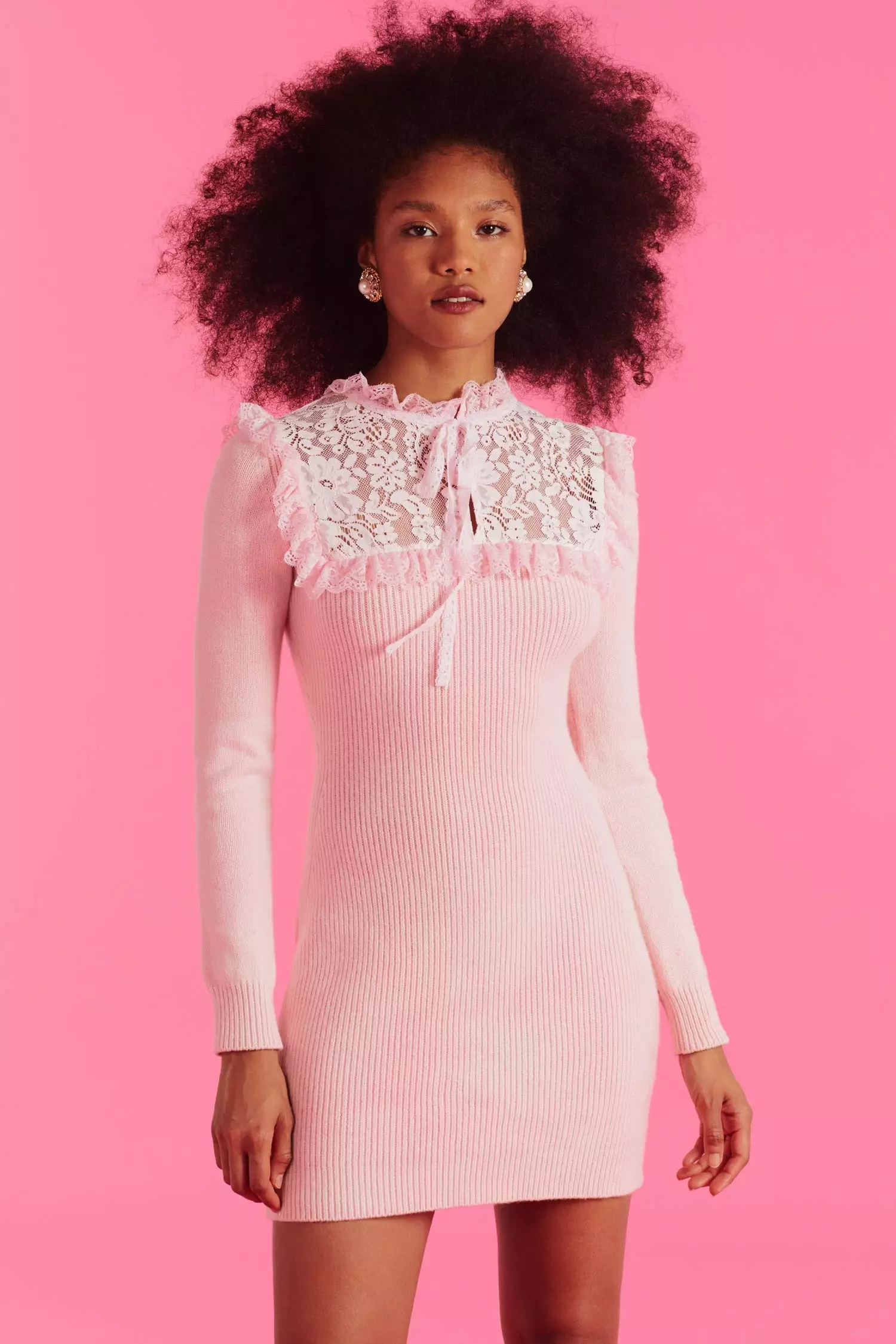 Cheers to our new Bellini Dress in a soft merino wool and cotton blend with custom floral lace details. This mini sweater dress has an elaborate yoke surrounding the neck, including lace ties, a keyhole and a tonal lace ruffle trim. The body is fitted with ribbing that’s mirrored at the cuffs of the slim long sleeves.