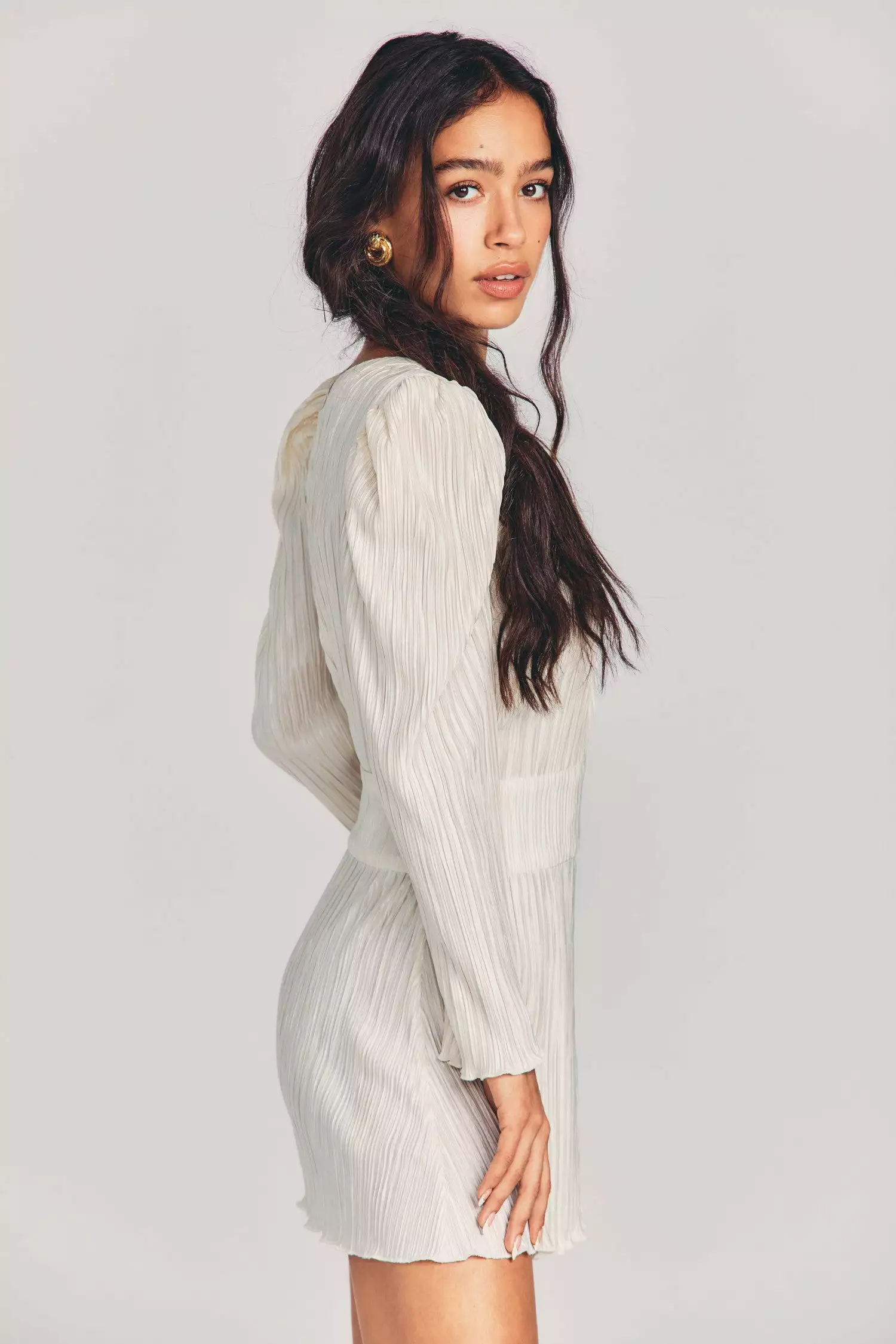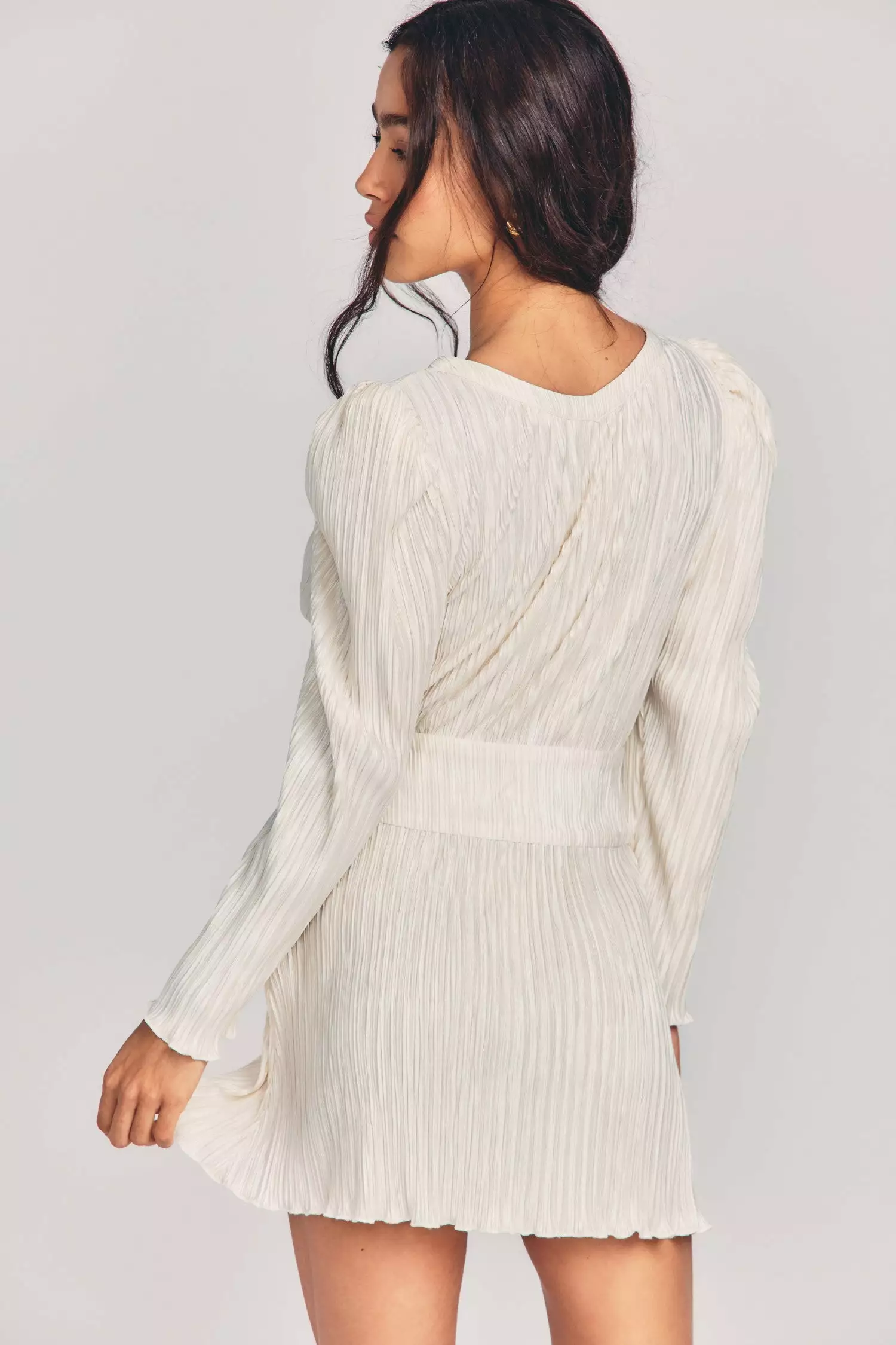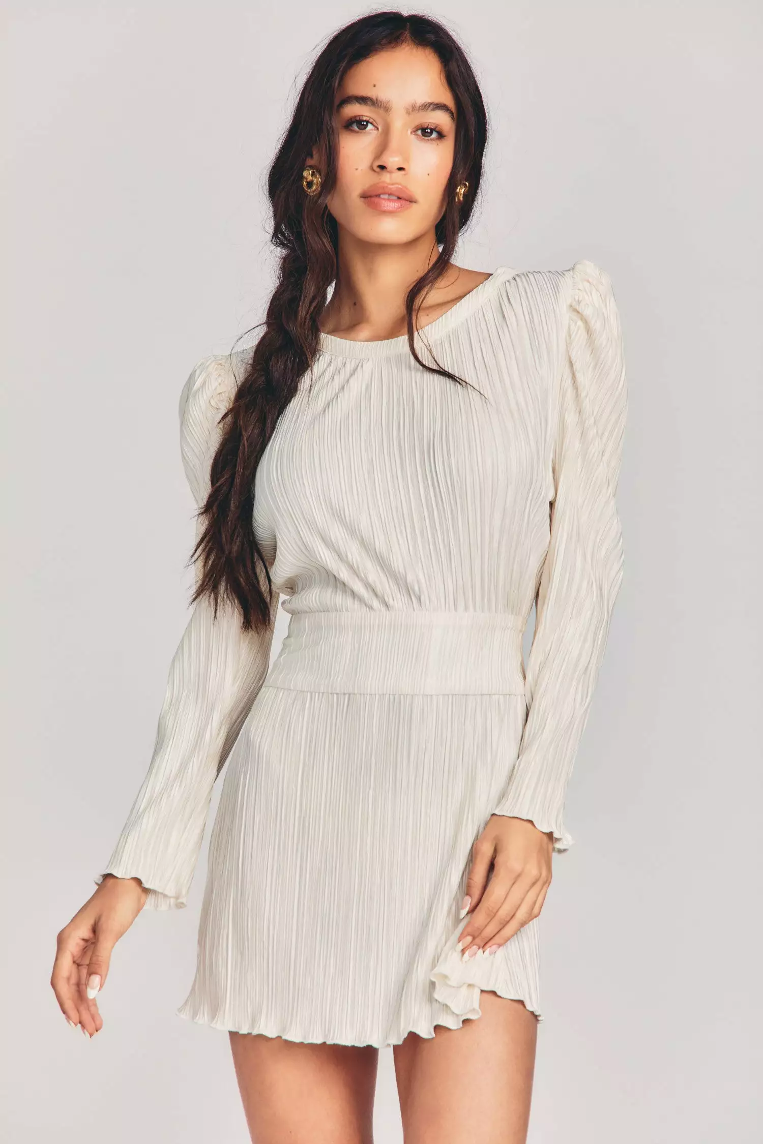 Our Carleen Dress is an instant classic in a new engineered pleated fabric with waved edges. This anywhere, anytime dress has a demure scoop neck, puffed sleeves that narrow to the wrist, a wide fixed waistband and an easy flared miniskirt. Accessorize it with our Lorna Barrette. Shown here in Cream.