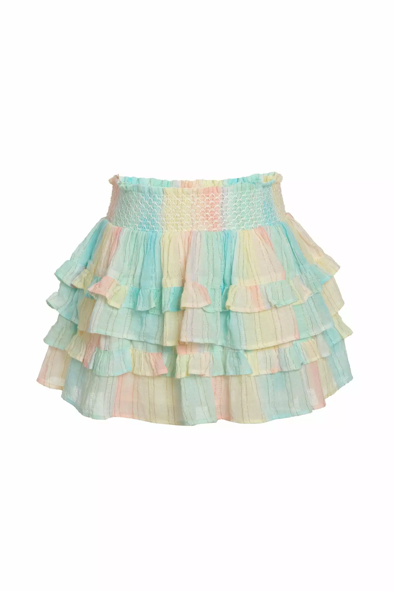 Our Billie Skirt is reimagined in taffeta with a signature holiday plaid print. Below a wide smocked waistband, the skirt falls to two shirred tiers with ruffle details. Pair it with our Mini Calix Tee.