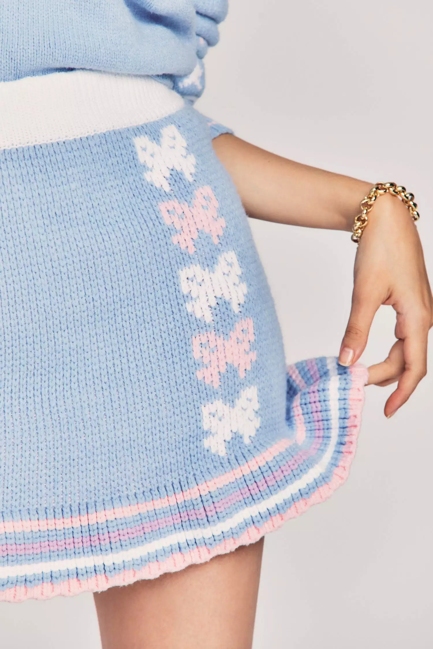 You’re tied up with a bow (or several) in our Hathaway Mini Skirt in a dense cotton blend with scalloped edges and a modern fairisle motif. This sweet sweater miniskirt has a ribbed waistband, a slim a-line cut and a small striped flounce at bottom. Wear it as a set with our Zaheer Pullover Sweater. Shown here in Blue Skies.