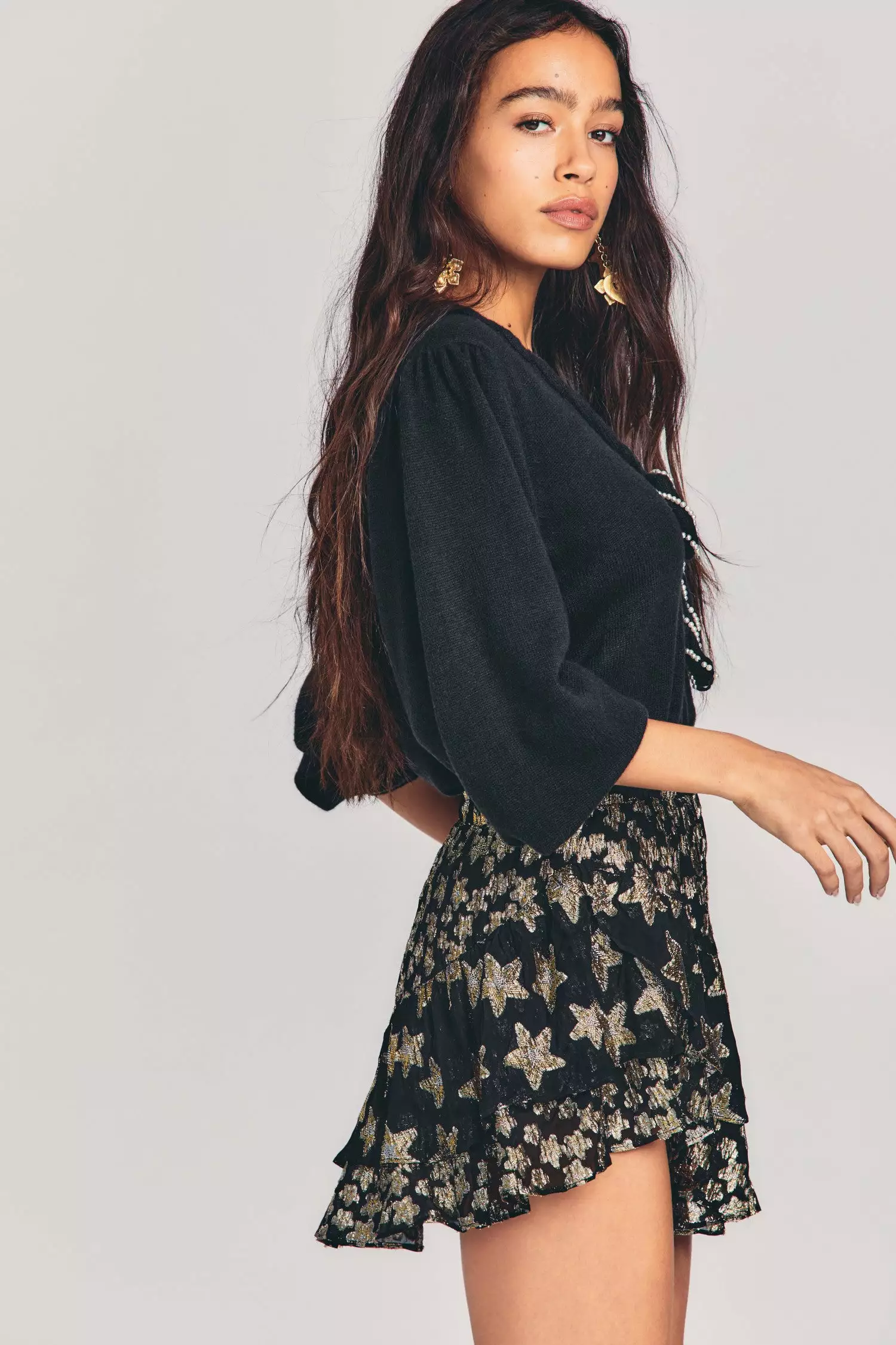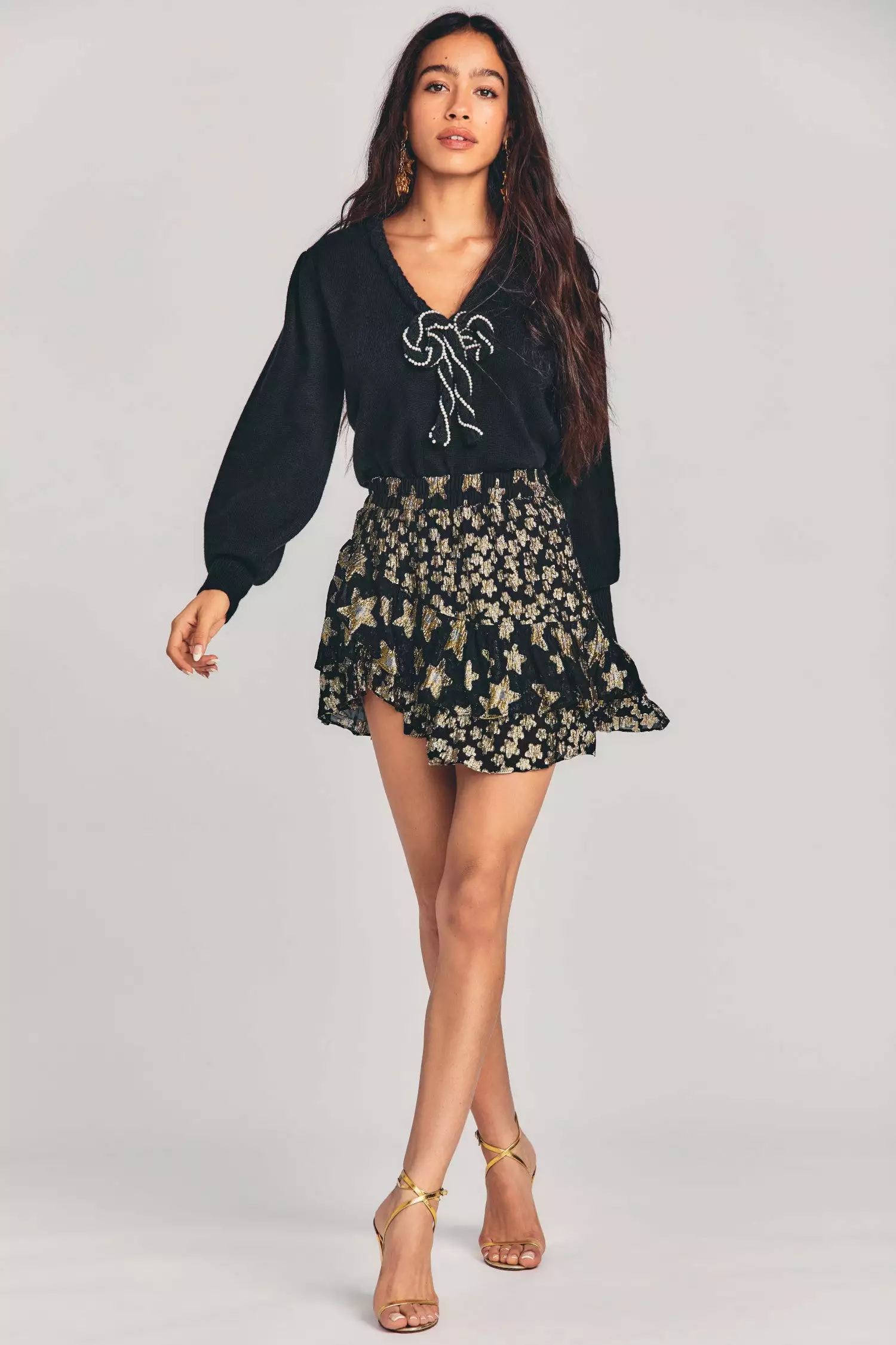 Our new Seniya Skirt shines in a custom pattern play print of multi-sized metallic lurex stars. This slip-on mini has a shirred elastic-encased waistband above an asymmetrical top panel, which widens diagonally down from wearer’s right hip, and flares to two shirred flounces. Pair it with our Leonora Pullover. Shown here in Black.