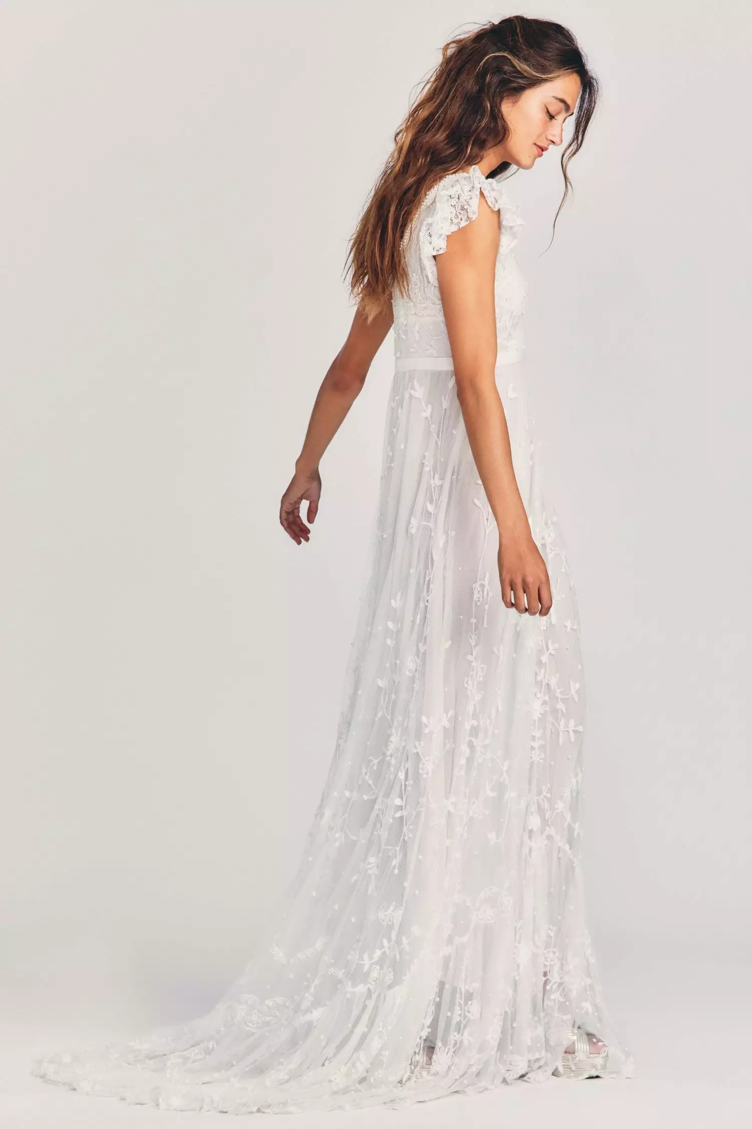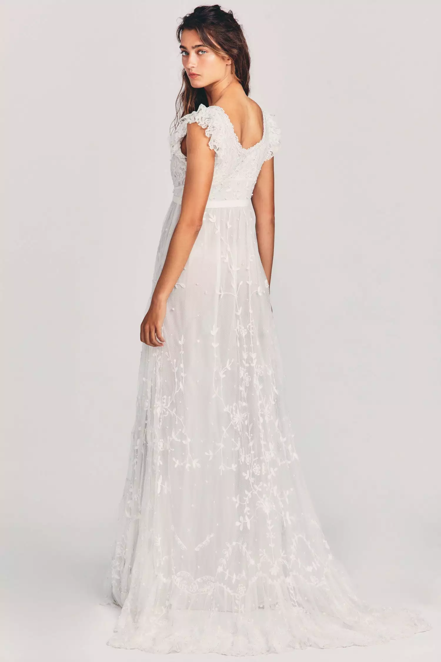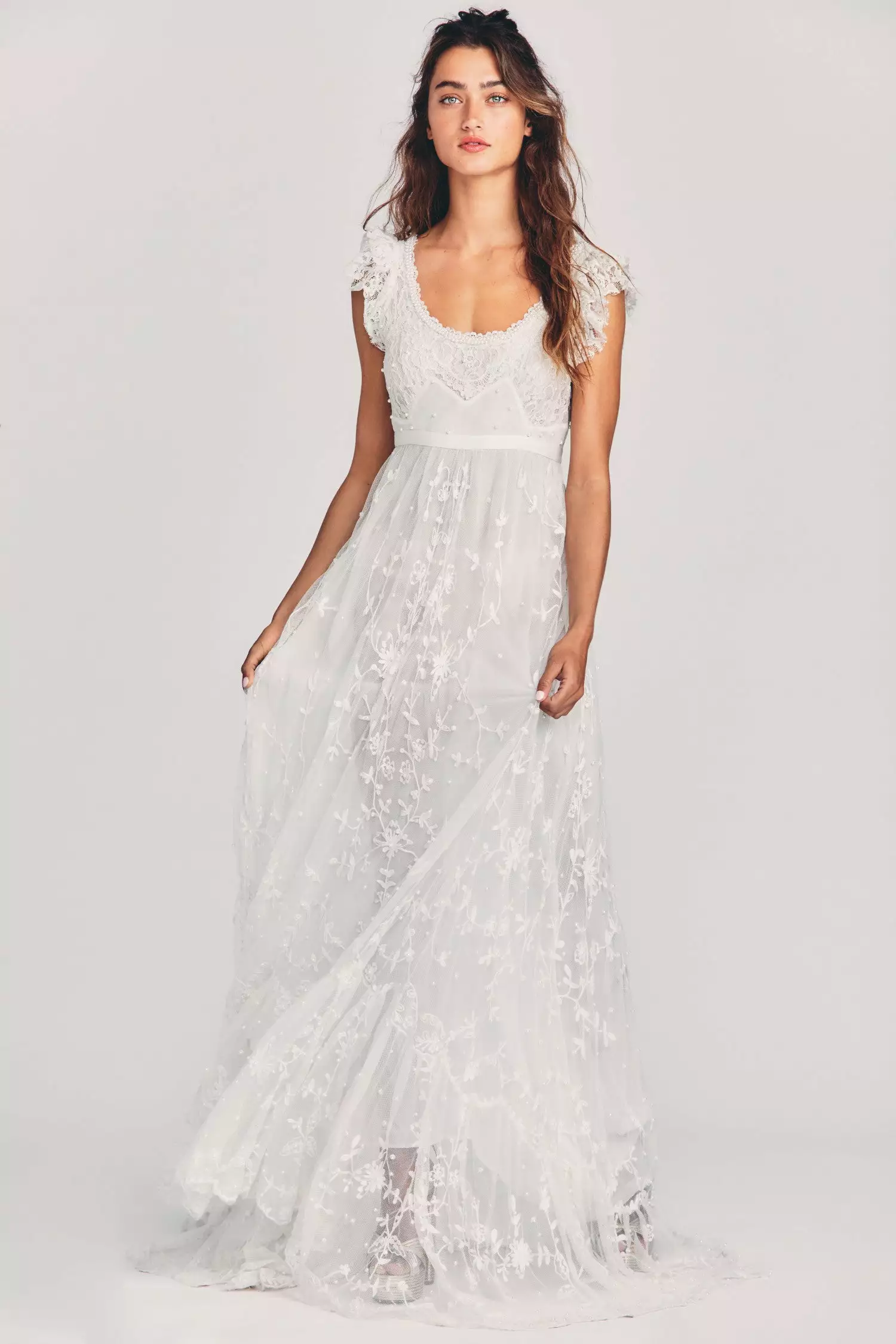 Here comes the Sho Dress, an intricate fantasy in sweeping lightweight mesh with hand-beaded pearls, wildflower embroidery and custom floral lace. This flowing, artisan, Bridgerton-inspired wedding gown features a pearl-trimmed scoop neck, lace flutter sleeves and an elaborate yoke above an empire waistband in grosgrain ribbon. The shirred skirt drapes to a flounce and a long train at back. Accessorize it with our LSF x Alison Lou Jelly Hoops. Shown here in White.