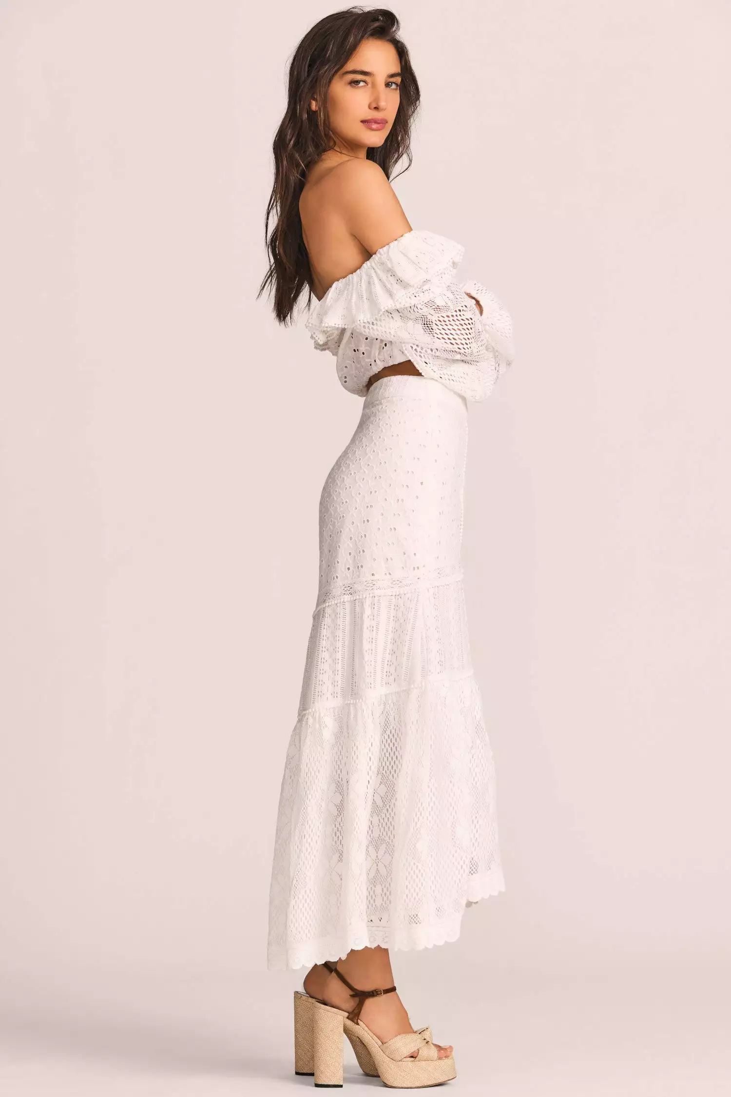 A favorite this season, our Sisto Skirt debuts in a mix of all-over custom lace and eyelet fabrics with lace and bobble trim. This flowing skirt has a fixed waist, a slim fit, pompoms down the princess seams and a high-low flare at bottom, longer at back. Wear it as a set with our matching Dorabella Crop Top. Shown here in True White.