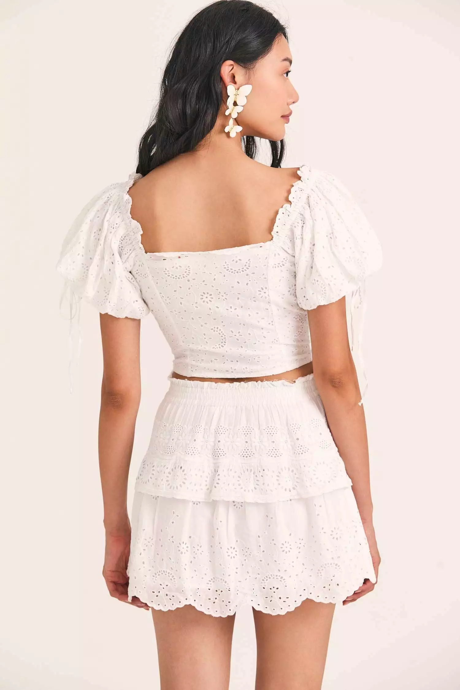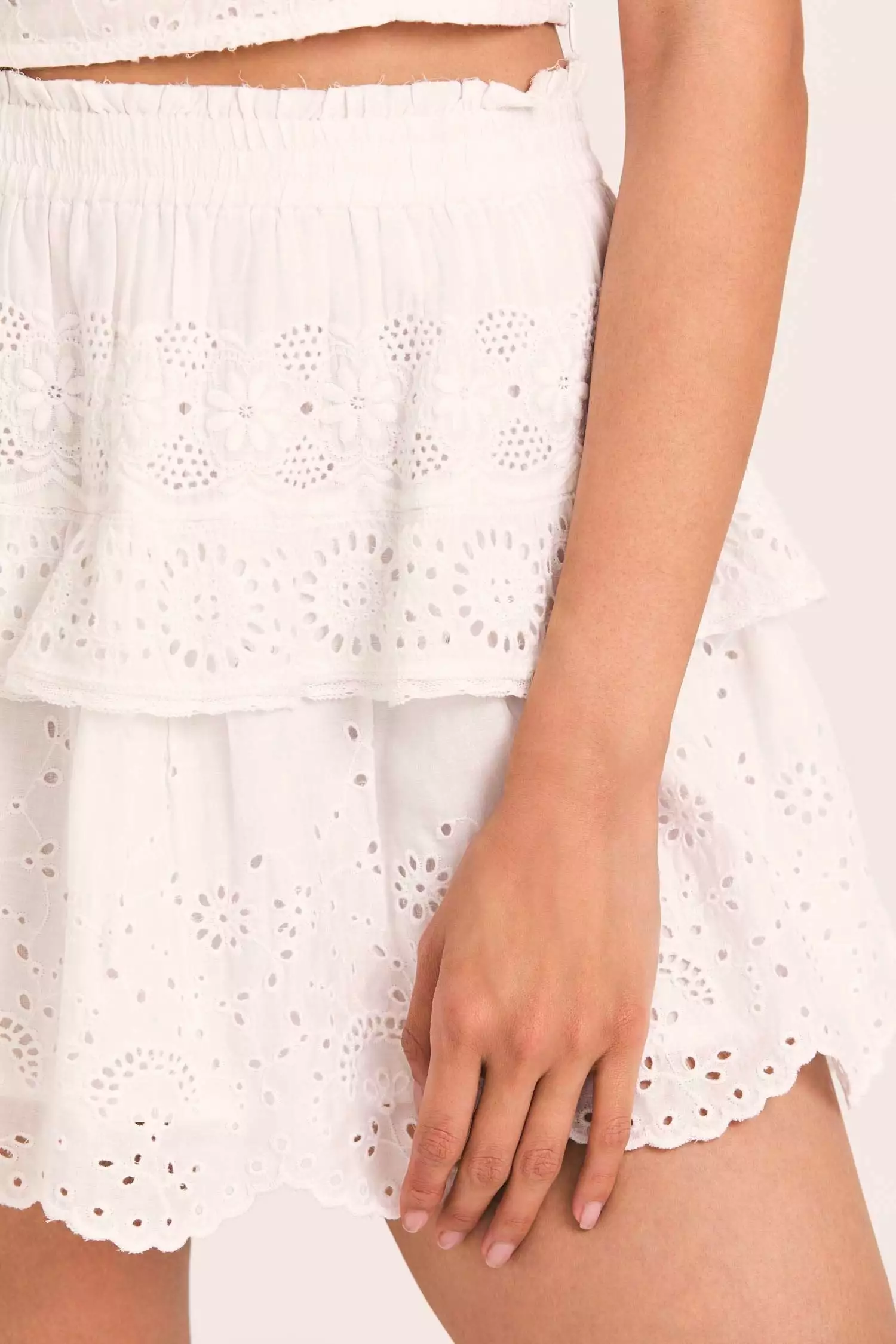 Our Charmaine Skirt is day-to-night in a new soft fabric with an intricate mix of contrast floral eyelet embroidery. This easy miniskirt has an elastic waistband, a short lace-trimmed flounce midway down and a scalloped bottom hem. Pair it with our Breccan Tank.