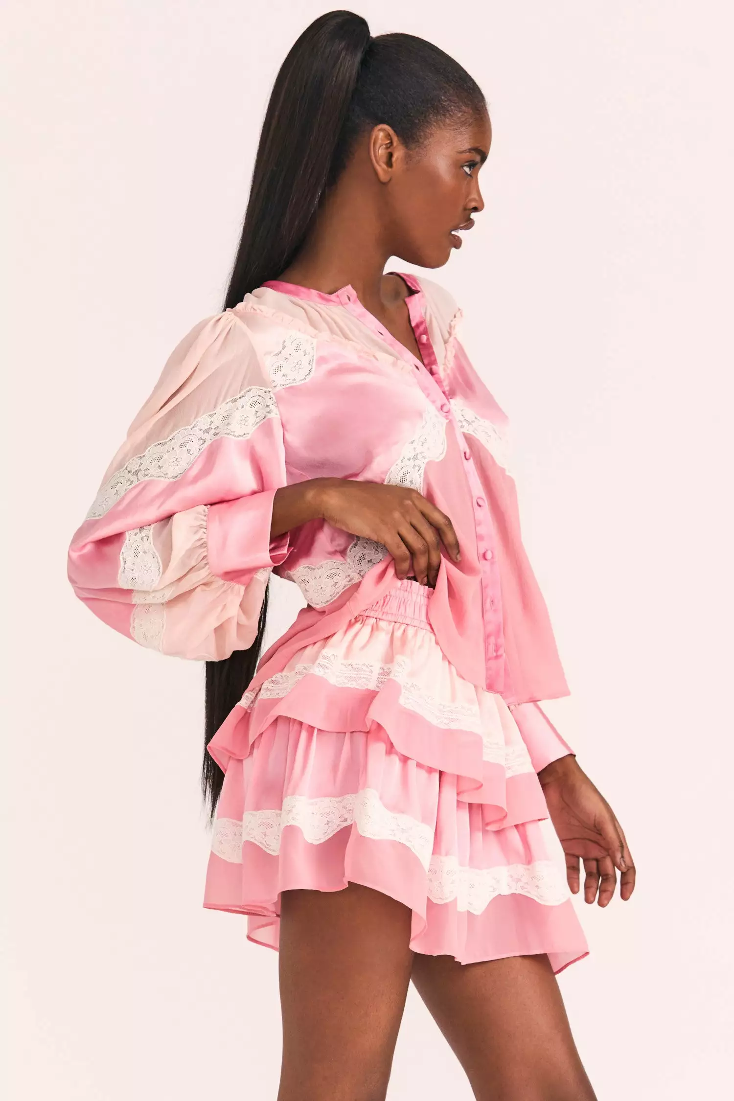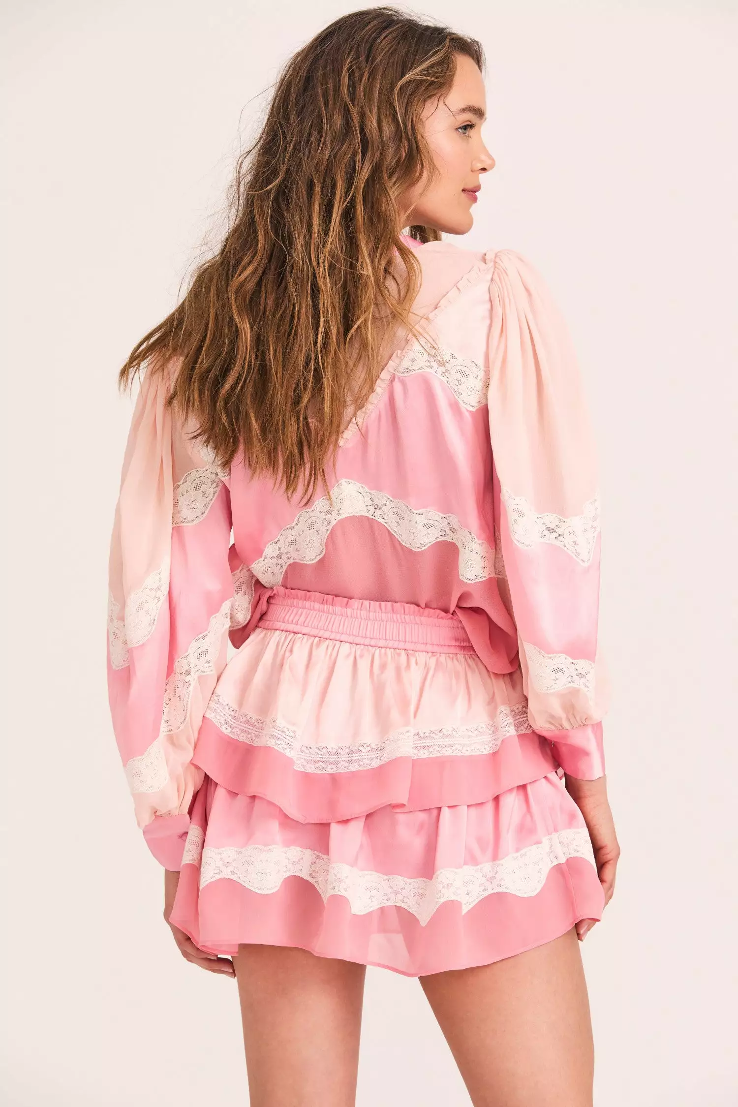 Oh, Fia, you’re so fine! Our new silky Fia Skirt arrives in three color-blocked shades of pink with custom lace panels. Below an encased elastic waistband, the skirt is shirred to a v-shaped flounce, then flares below to a full asymmetrical sweep with a scallop-edged lace detail. Wear it as a set with our Zavia Blouse. Shown here in Pastel Pink Colorblock.