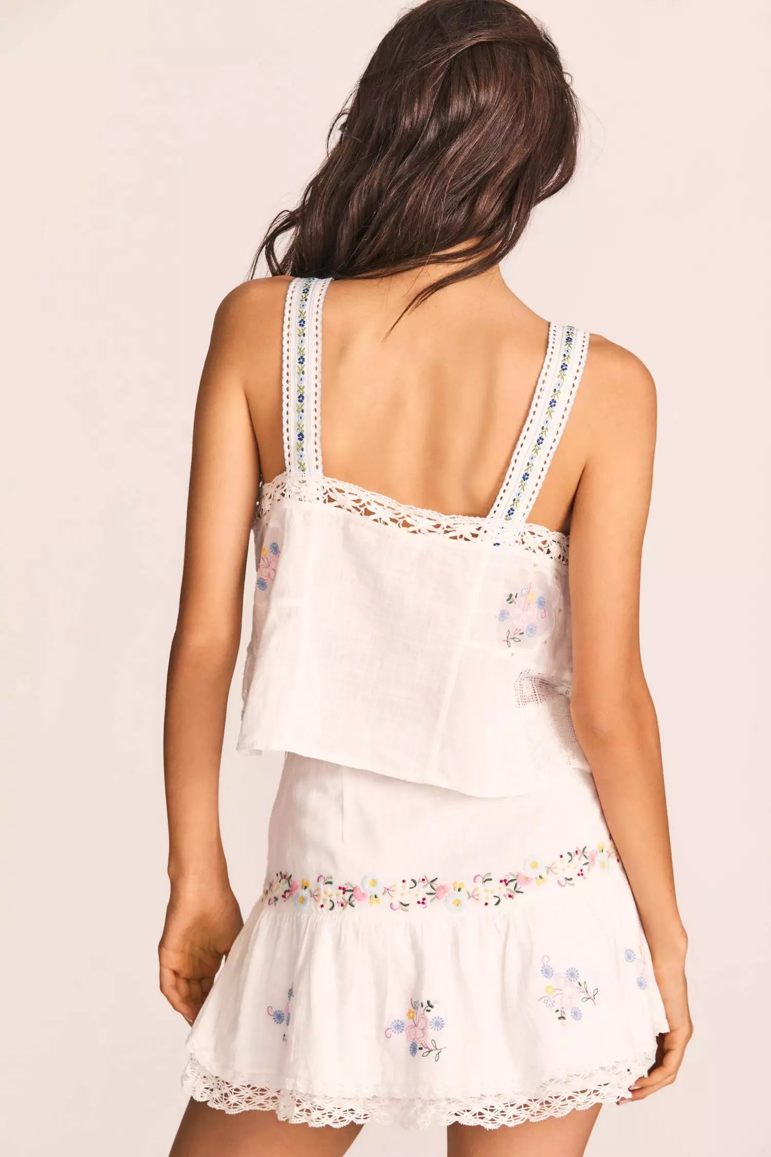 Inspired by vintage textile techniques, our Sobia Tank is airy in 100% cotton with custom laces and multicolored hand-embroidery. This relaxed top has wide straps, a lace-trimmed top with a satin ribbon bow, functional mother-of-pearl buttons down center front and a shaped lace hem. Wear it as a set with our Rhodes Mini Skirt. Shown here in Antique White.