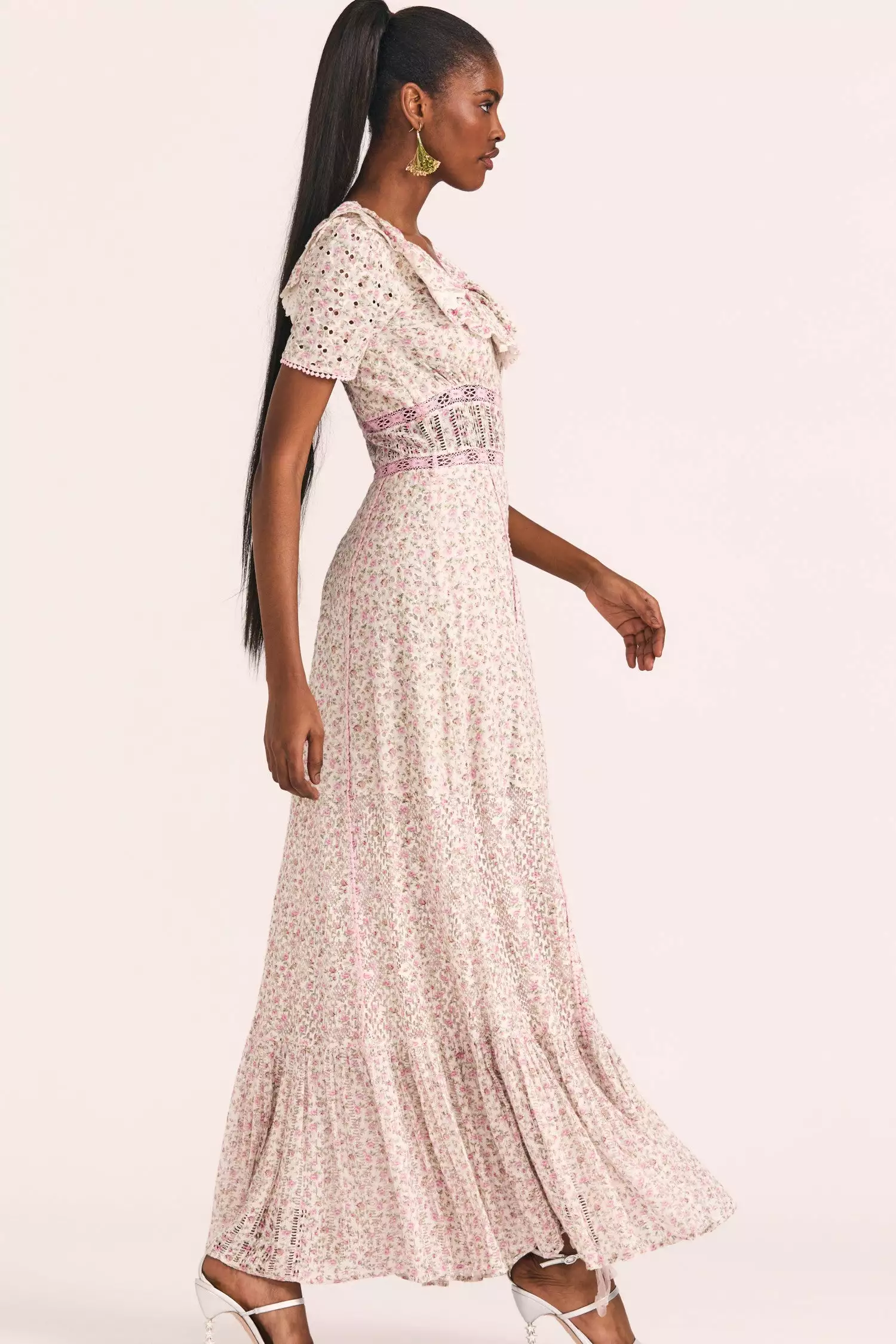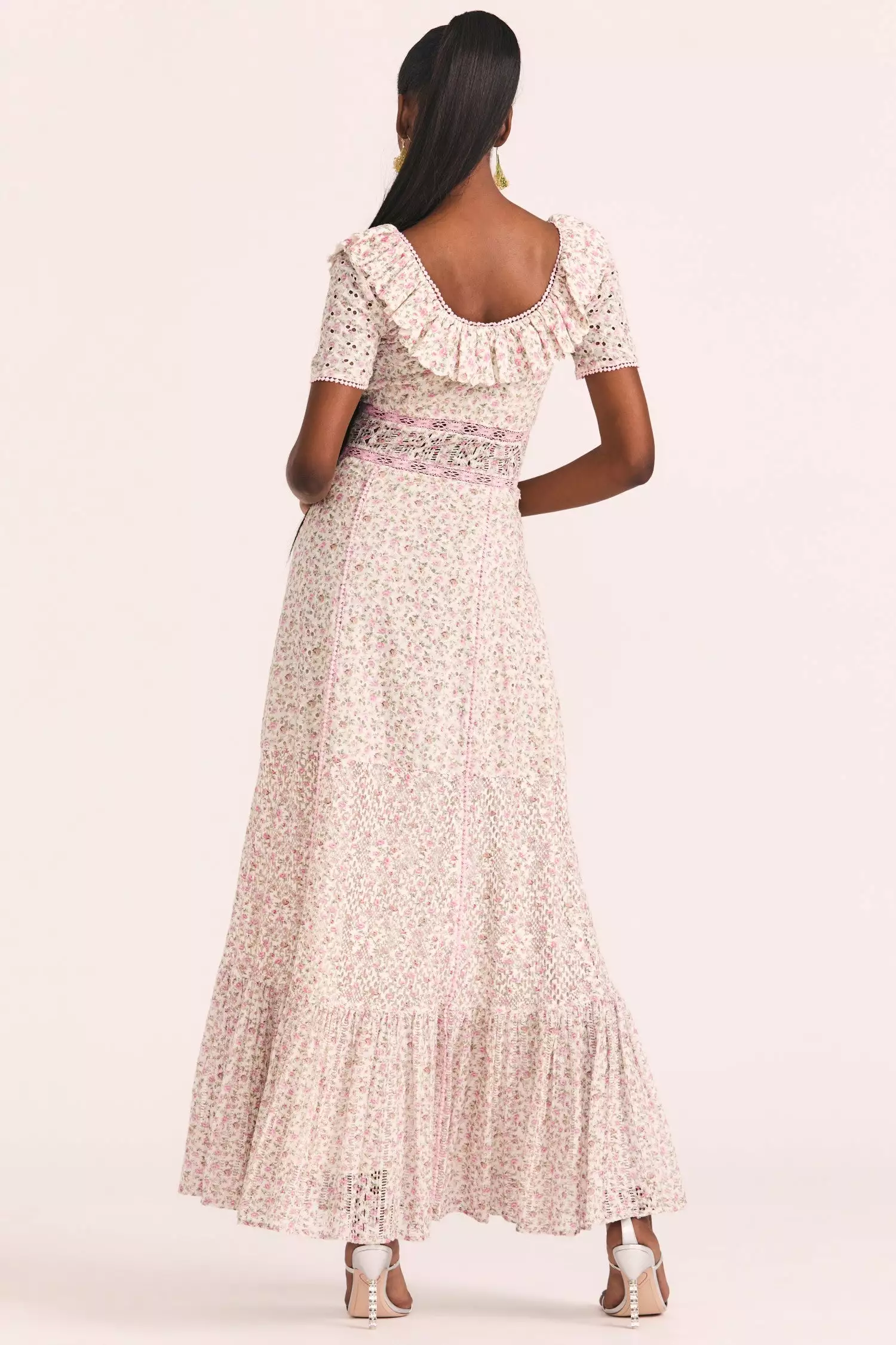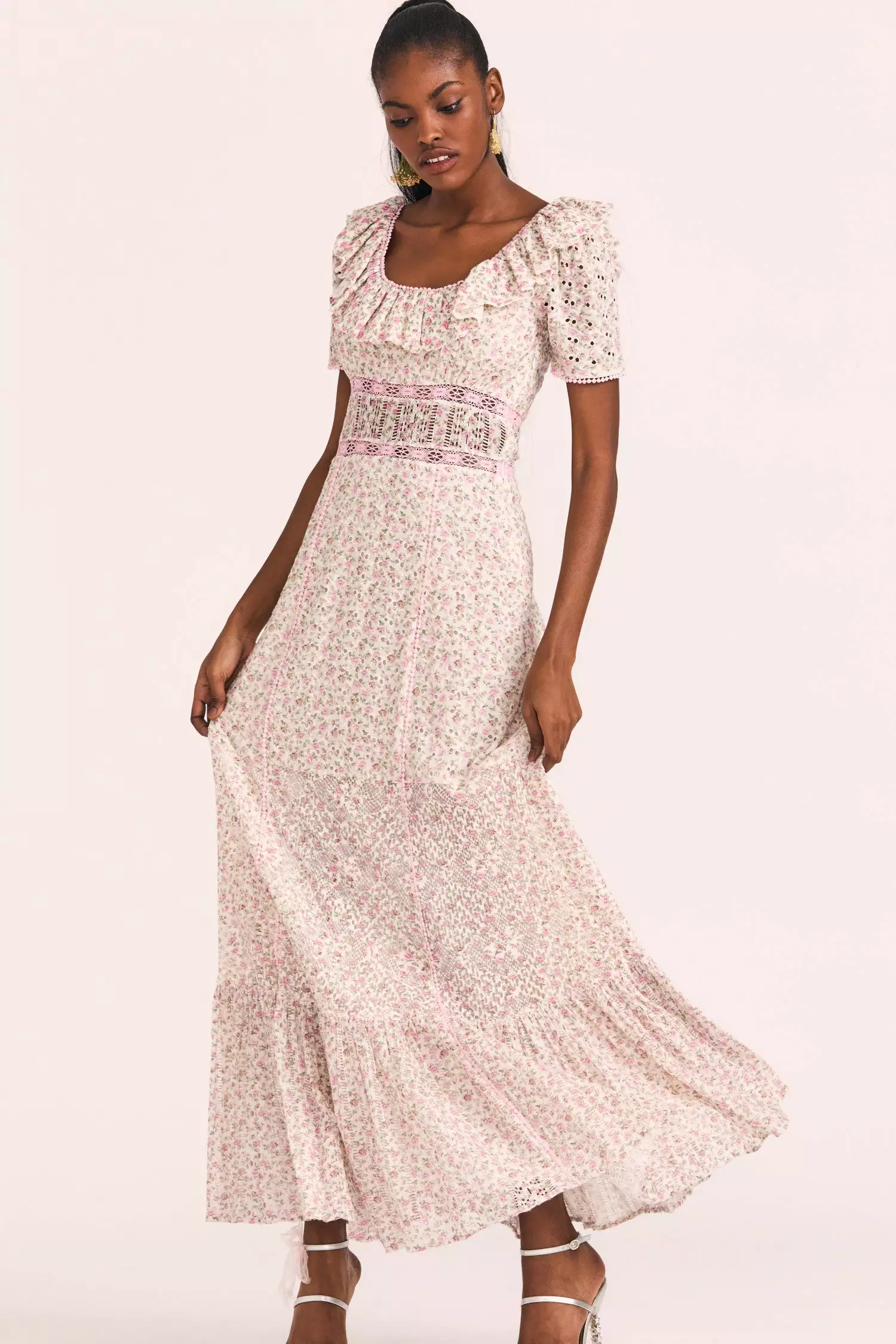 All eyes on our Stassie Dress, debuting in a mix of custom lace and eyelet cotton fabrics with a ditsy rosebud print and bobble trim. This maxi-length dress is a sure favorite with its ruffle-trimmed scoop neck, short sleeves and shirred bust above a sheer lace waistband. With pompoms down the princess seams, the skirt flows to a shirred flounce at bottom. Accessorize it with our LSF x Lele Sadoughi Pearl Headband. Shown here in Petunia Pink.