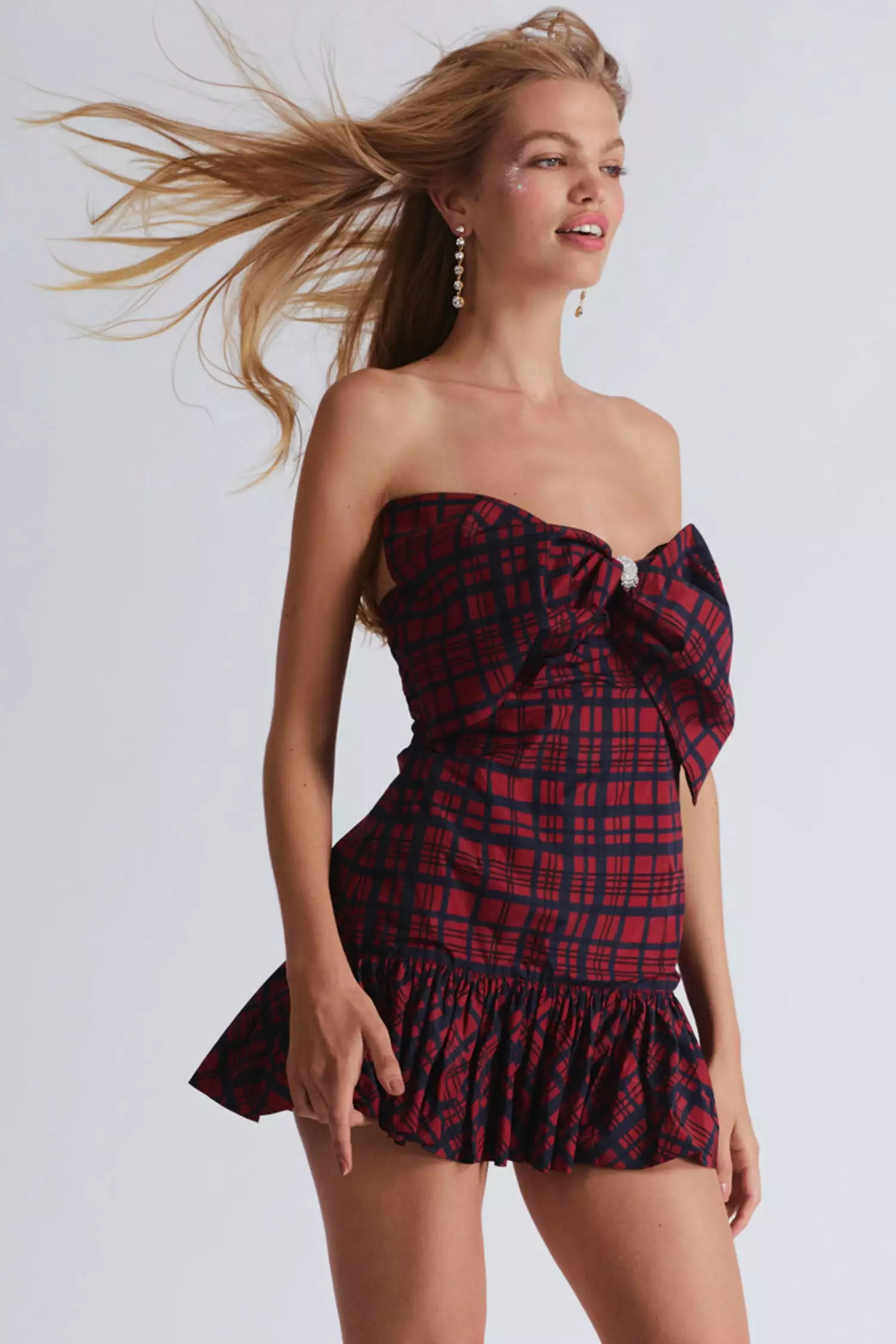 Our Tilson Dress brings the cheer in taffeta with a holiday-inspired custom plaid print. This strapless minidress features a fold over panel at top that wraps around to an oversized bow at front, adorned with a fixed rhinestone pin. The bodice has a slim fit to a dropped waist, which flares to a shirred miniskirt. Shown here in Moody Ruby.