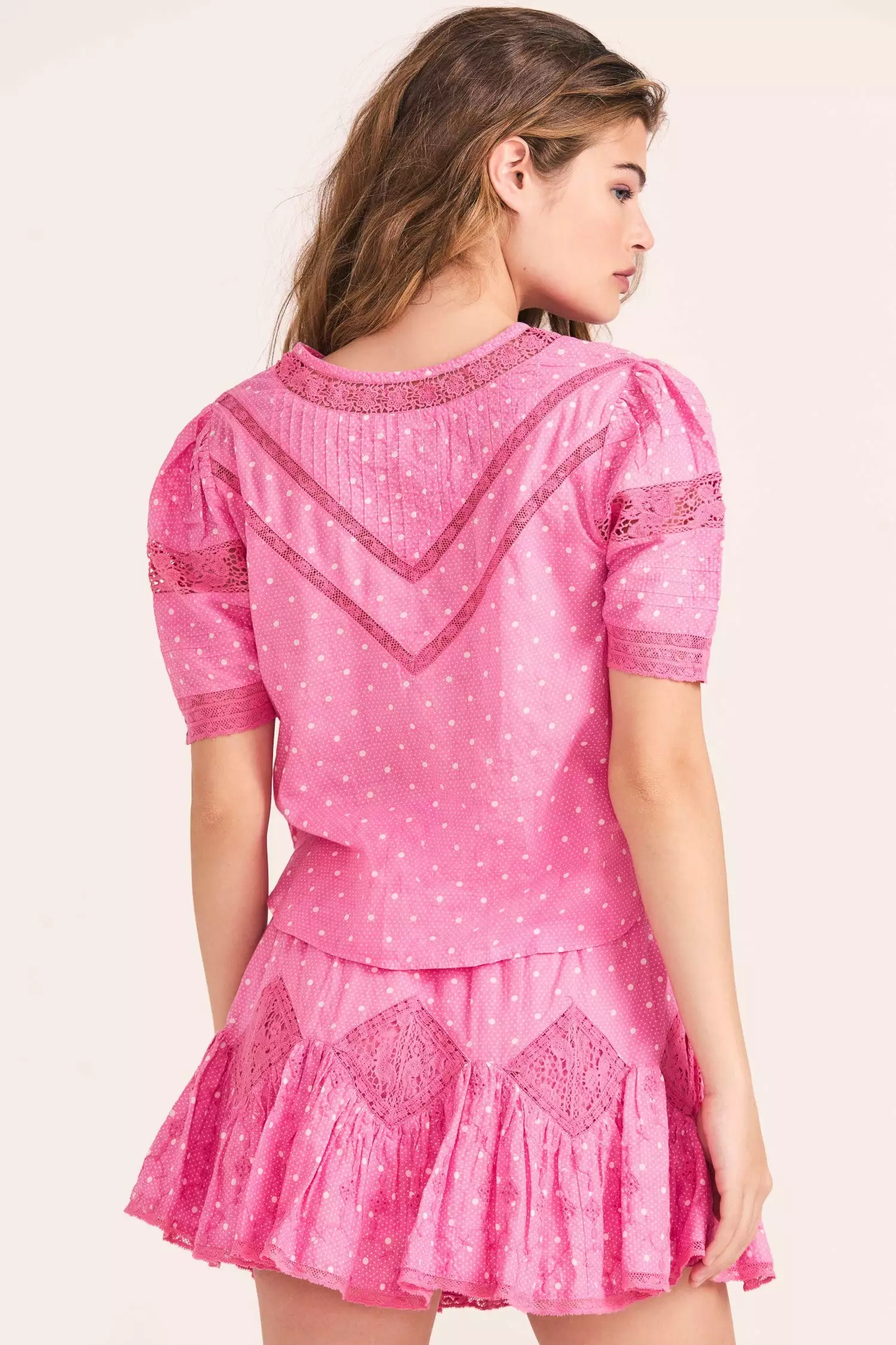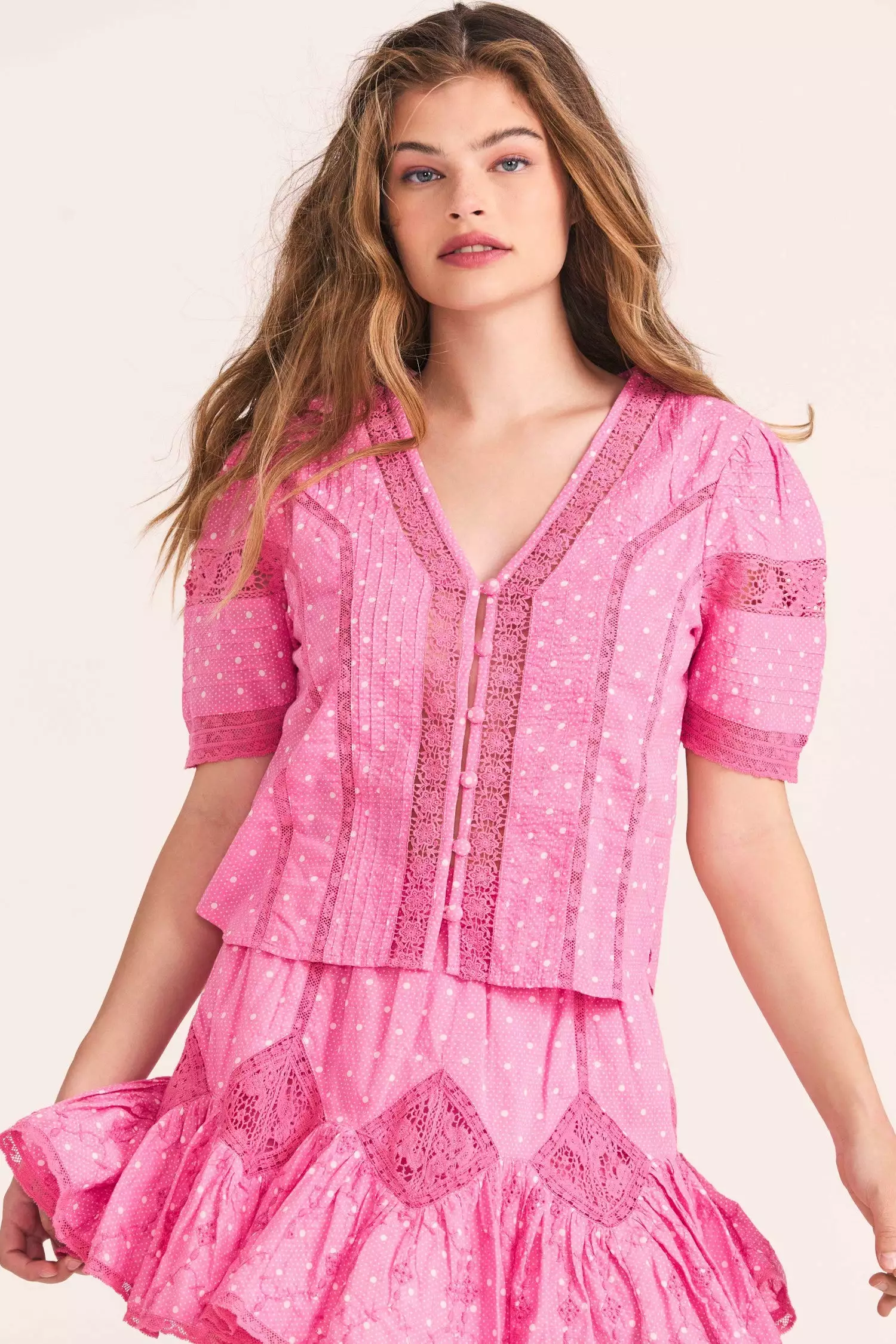 Our new Gavilan Top is here in 100% cotton voile with scaled polkadots, pintucking and a mix of custom embroidered and crocheted laces. This intricate blouse has a v-neck, buttons and loops down center front (framed by vertical inset lace panels), shirred elbow sleeves and small slits at the bottom side seams. Wear it as a set with our Adia Mini Skirt.