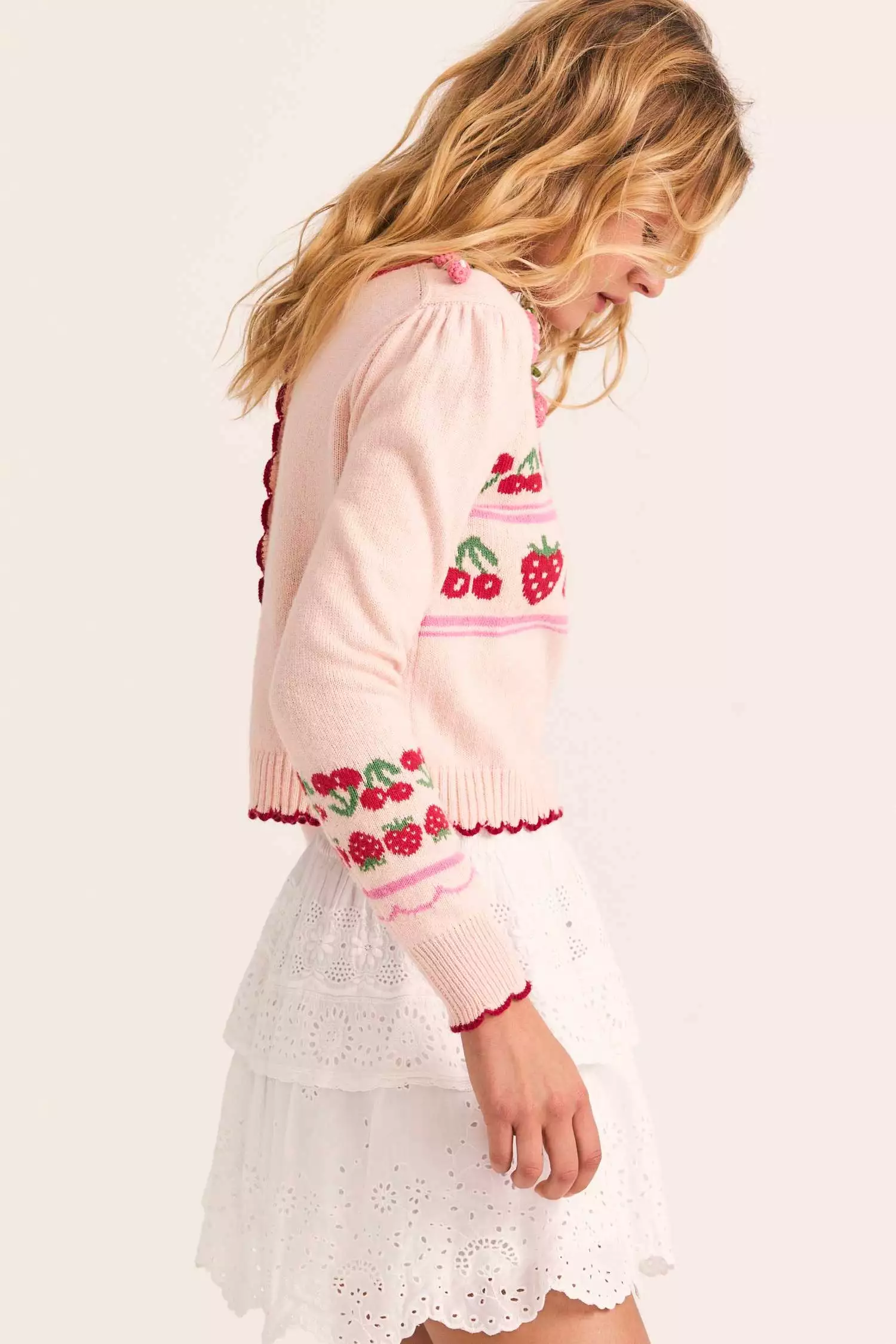Our Renton Pullover is sweet as can be in a cotton-wool blend with a strawberry and cherry intarsia motif and hand-crocheted top-applied strawberries. This shrunken sweater has a subtle ribbed scoop neck, a ribbed cuff at sleeve opening and a ribbed bottom border with contrast scalloping. Strawberry buttons descend at center back. Pair it with our Ruffle Mini Skirt. Shown here in Pearl Blush.