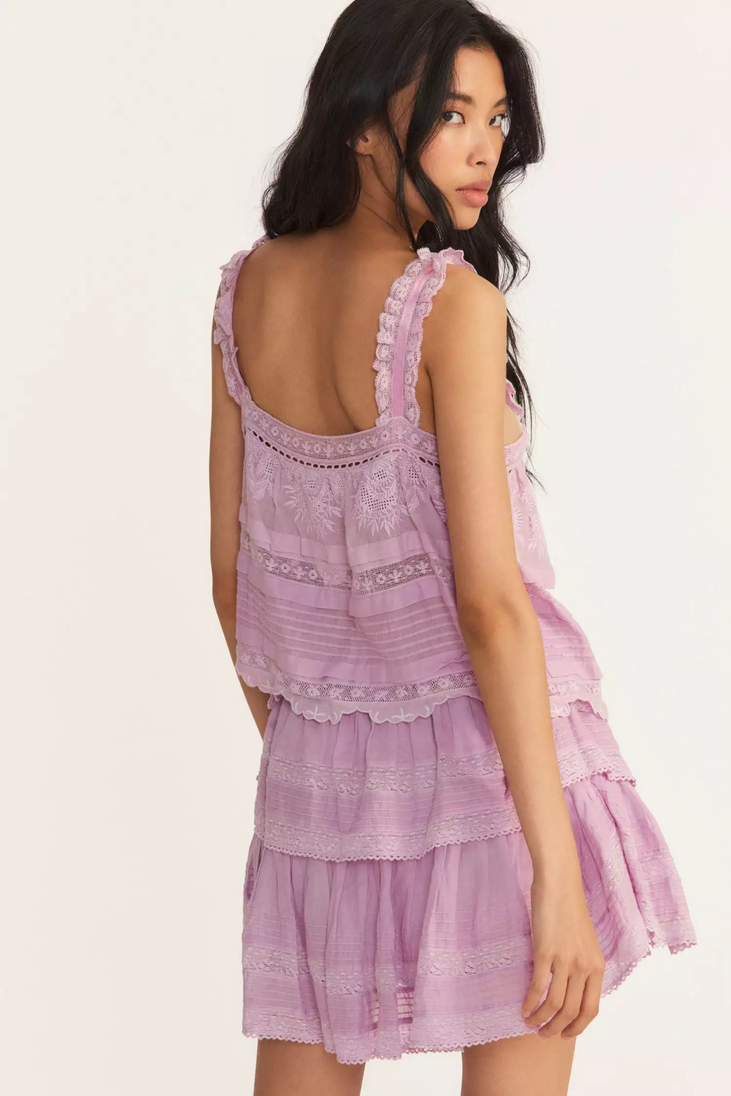 Our Sully Top is back with lofty embroidery, sheer inset floral lace panels and pintucking. The straps of this hand-dyed cotton tank blouse are constructed with satin ribbons, bordered by scalloped lace. Functional pearlescent buttons line the center front of the roomy bodice. The bottom features a scalloped trim, finished with broderie anglaise embroidery. Wear it as a pair with our Ruffle Mini Skirt. Shown here in Island Pink Hand Dye.