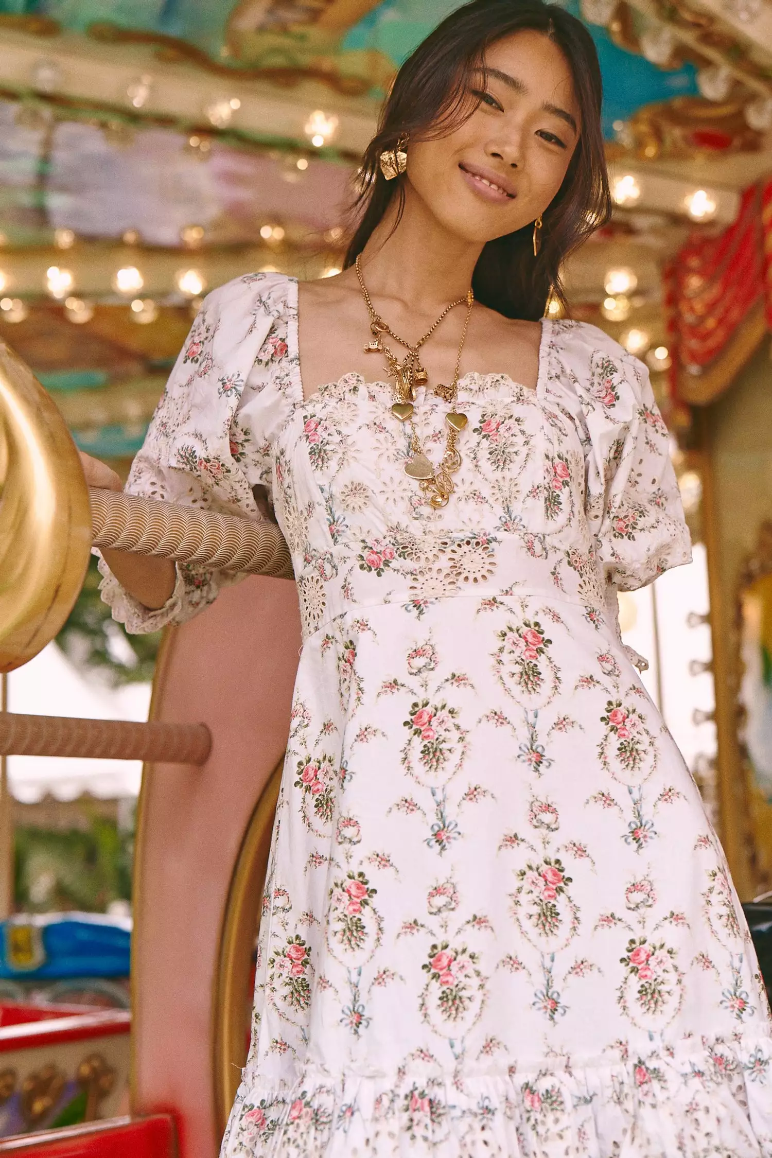 Our Toulon Dress arrives in cotton with schiffli eyelet embroidery, scalloped trim and a French textile-inspired floral of the season. This flowing frock has an elastic encased neckline, worn on- or off-the-shoulder, and a ruffle-trimmed layered bust. Blouson sleeves finish with tall smocked cuffs. Below a fixed waistband, the skirt falls straight and then to tiers. Shown here in Vanilla Kisses.
