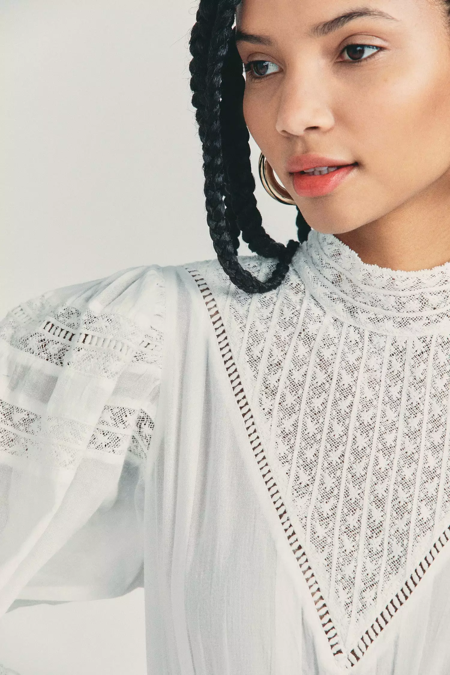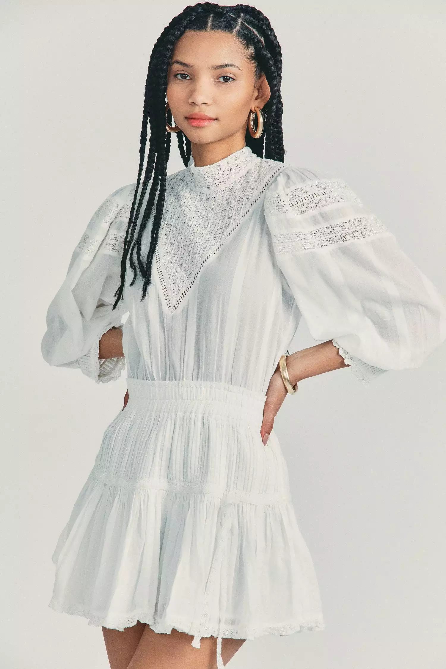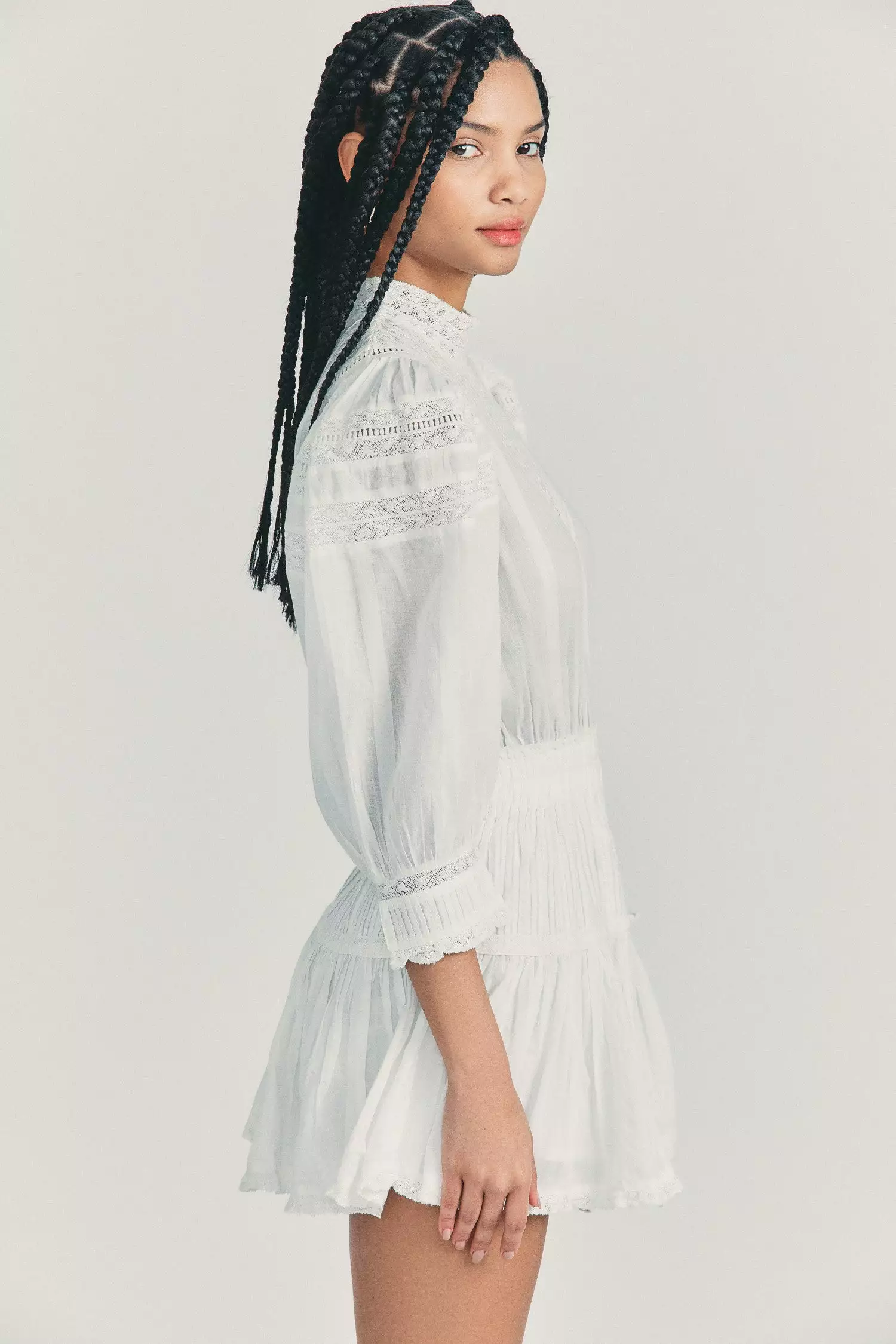 Our Victorian-inspired Viola Dress arrives in custom dobby cotton with inset floral lace and lofty wildflower embroidery. This relaxed frock has a high collar and an inset triangular lace yoke above an elastic waist. A hidden placket with center buttons lines the back. Shirred elbow-length puffed sleeves are finished with a pintucked cuff, mirrored by pintucking at the top panel of the miniskirt. Shown here in Antique White.