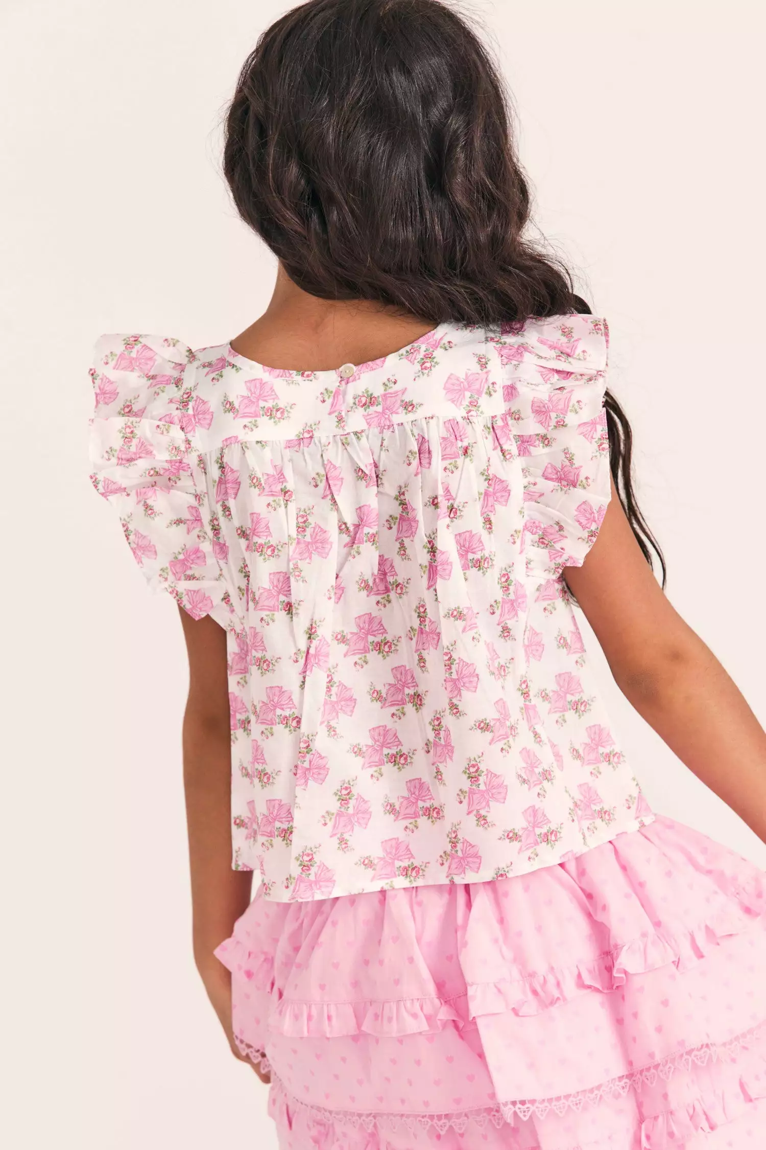 Our Fancy Flutter Top for girls makes a sweet statement with a pink bow and rosebud print. This short relaxed fit top has a victorian-inspired high neck with a lace adorned chiffon. Ruffles at the princess seams form flutter sleeves. Pair it with our Rosy Ruffle Mini Skirt. Show here in Pink Mint.
