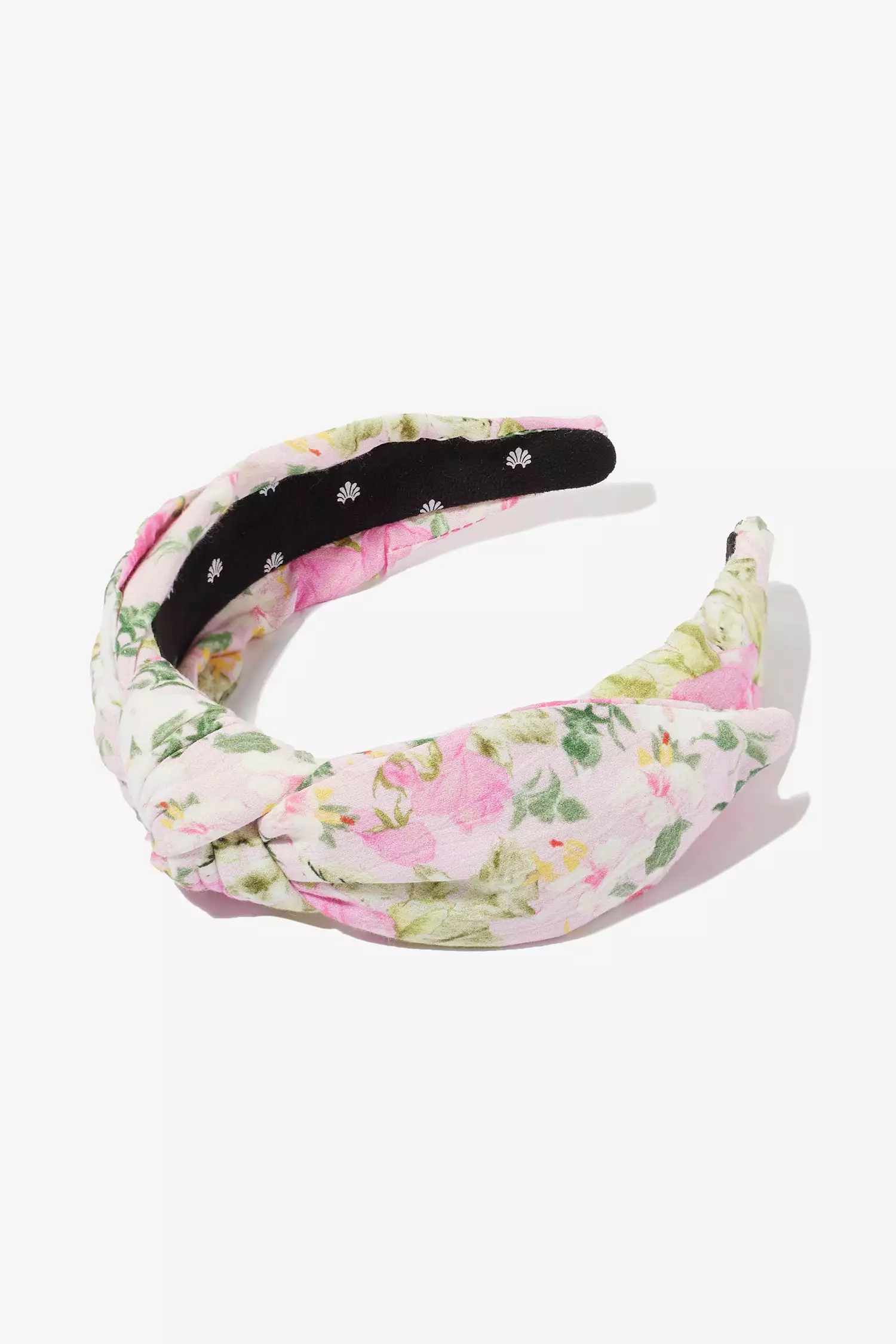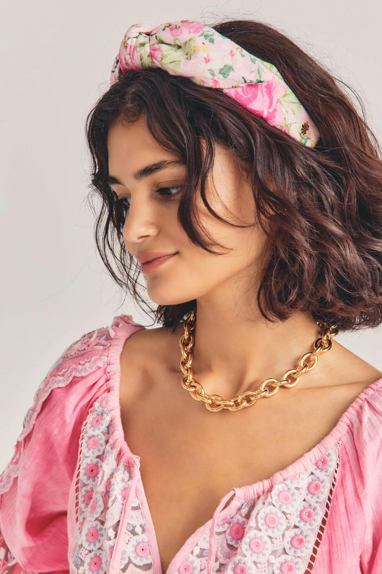 This season, our LoveShackFancy x Lele Sadoughi Knotted Headband returns in updated textiles. On this wide headband, material is hand-knotted over a 1″ tall comfort fit base with a 1 1/2″ knot and 2 1/4″ width. Arrives in a LoveShackFancy print dust bag. The Crystal Knotted Headband is the perfect accessory to theΓ₯ΓNovalie Mini Dress. Shown here in Magenta Flower Fields.