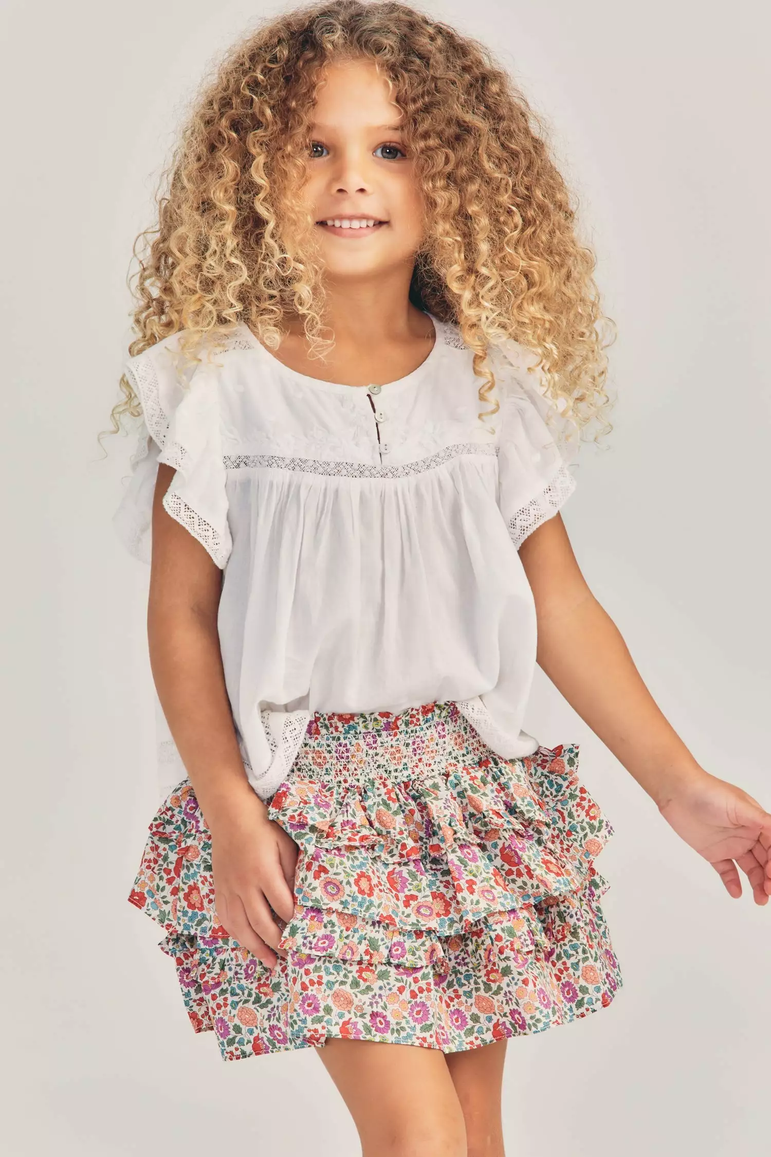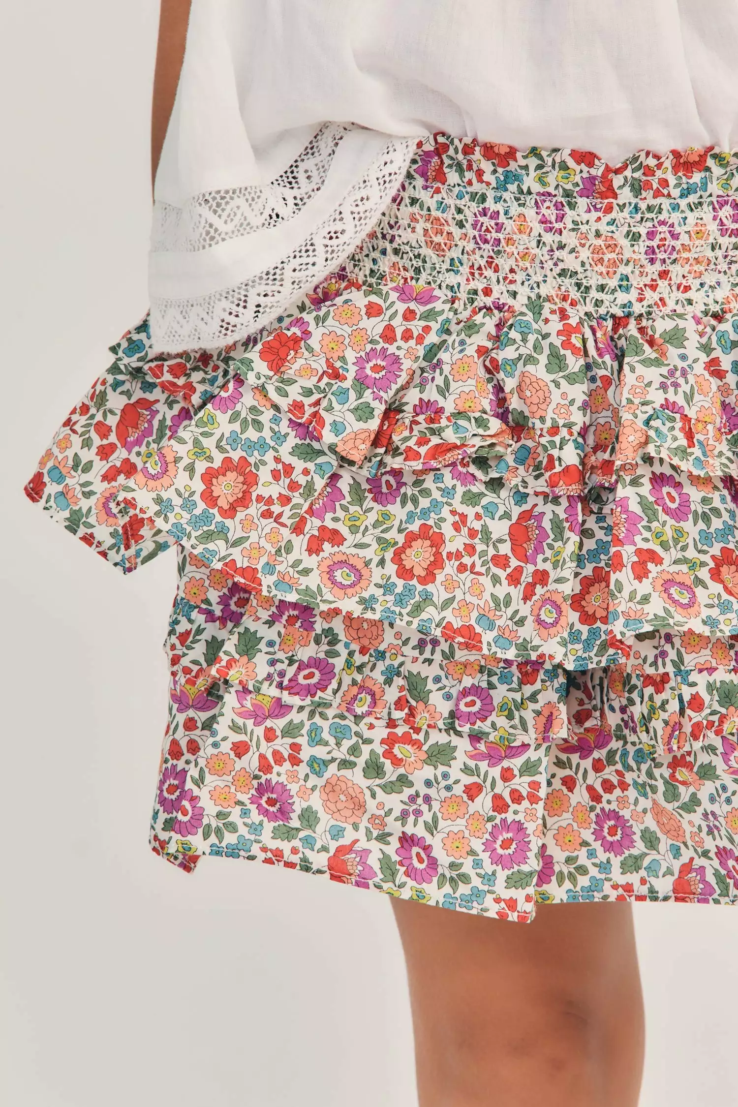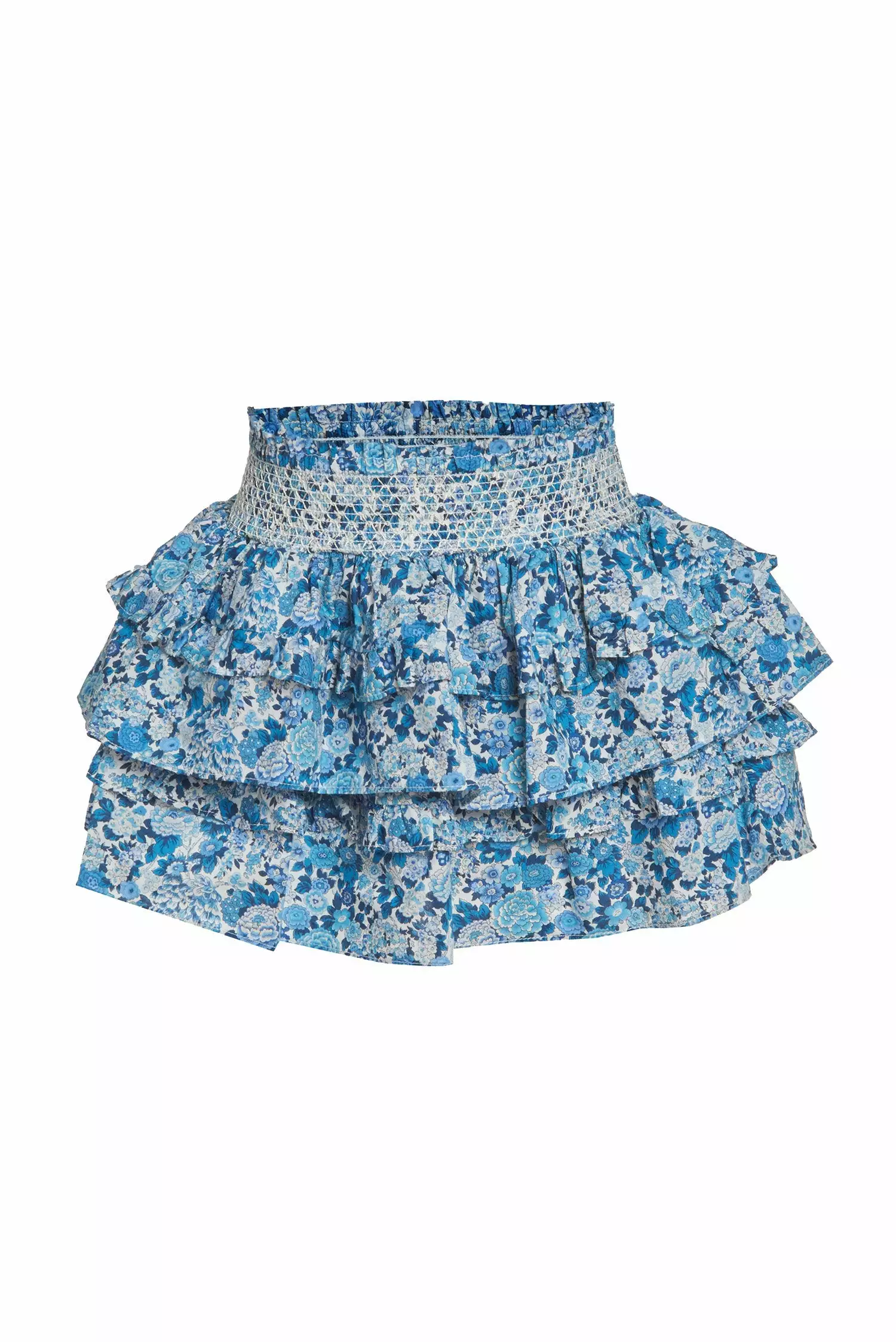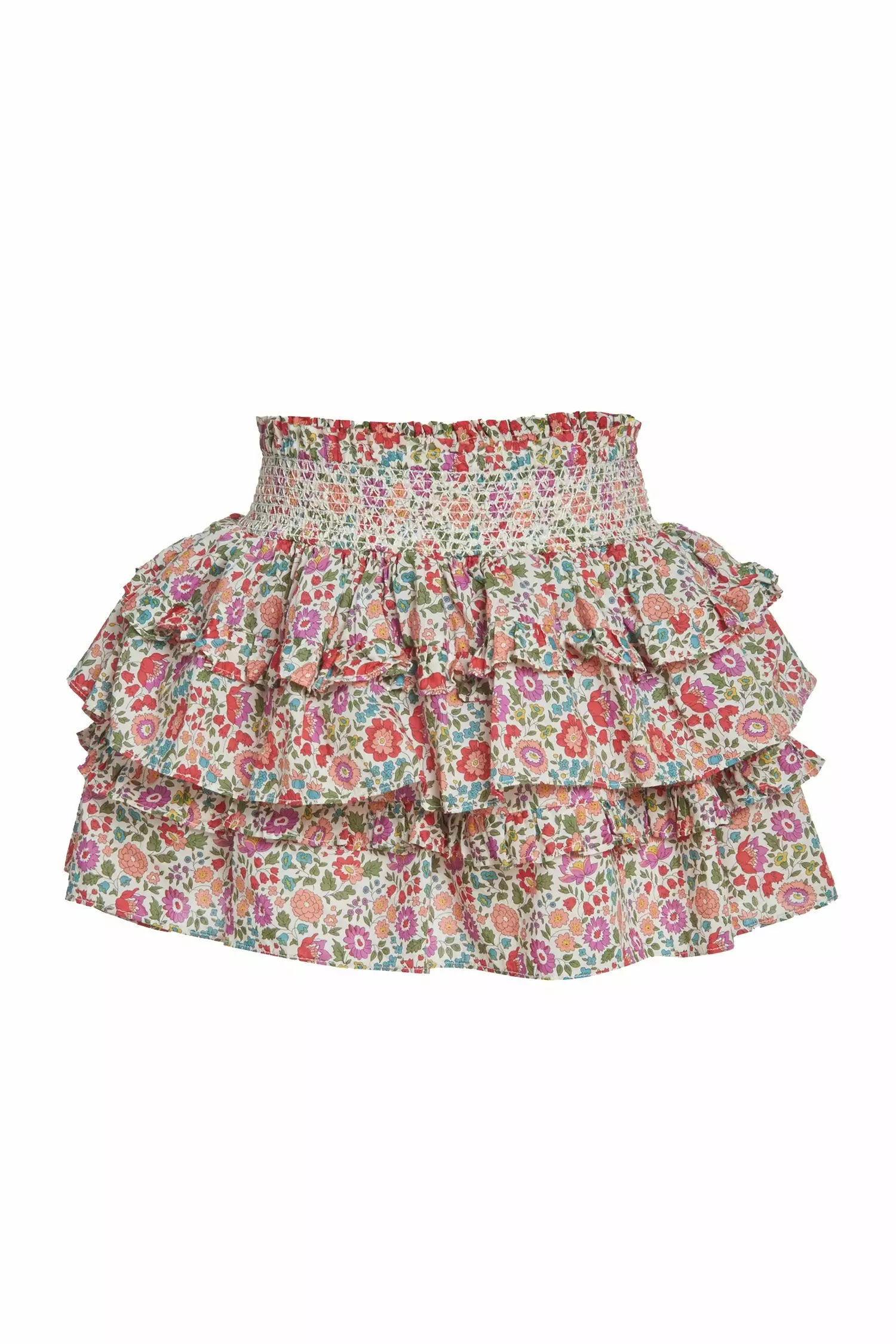 Our Billie Skirt is reimagined in cotton with this season’s liberty print. Below a wide smocked waistband, the skirt falls to two shirred tiers with ruffle details.
