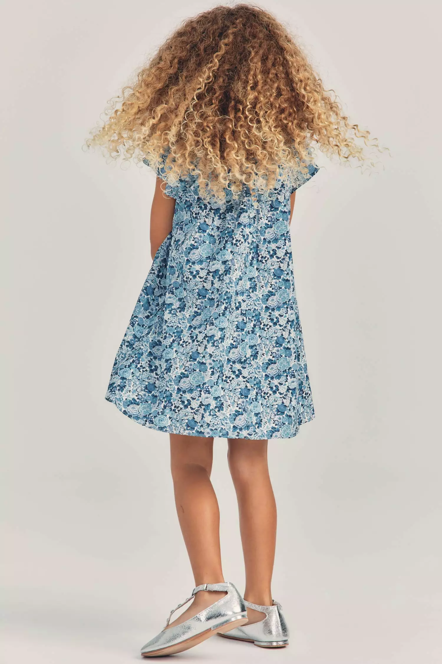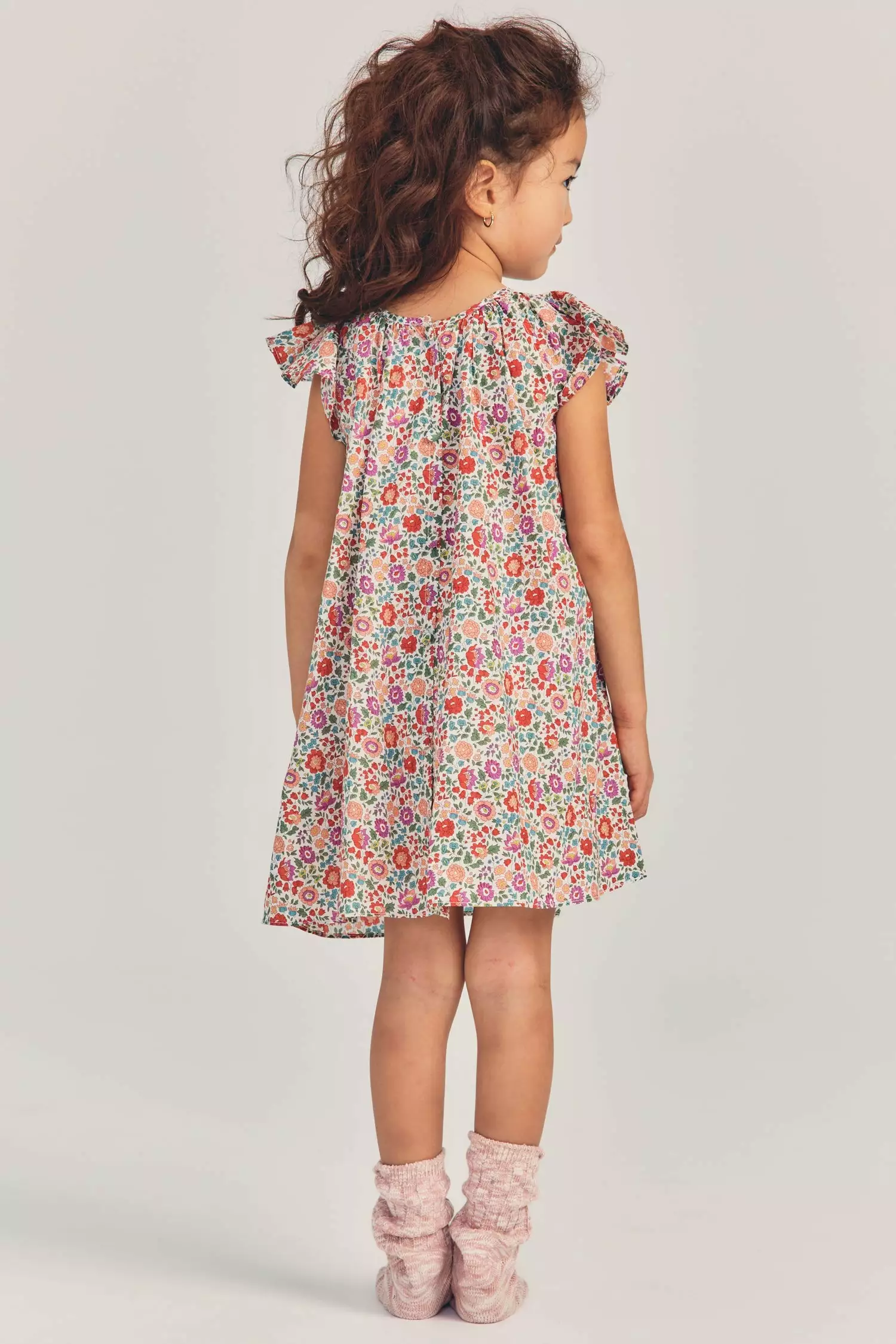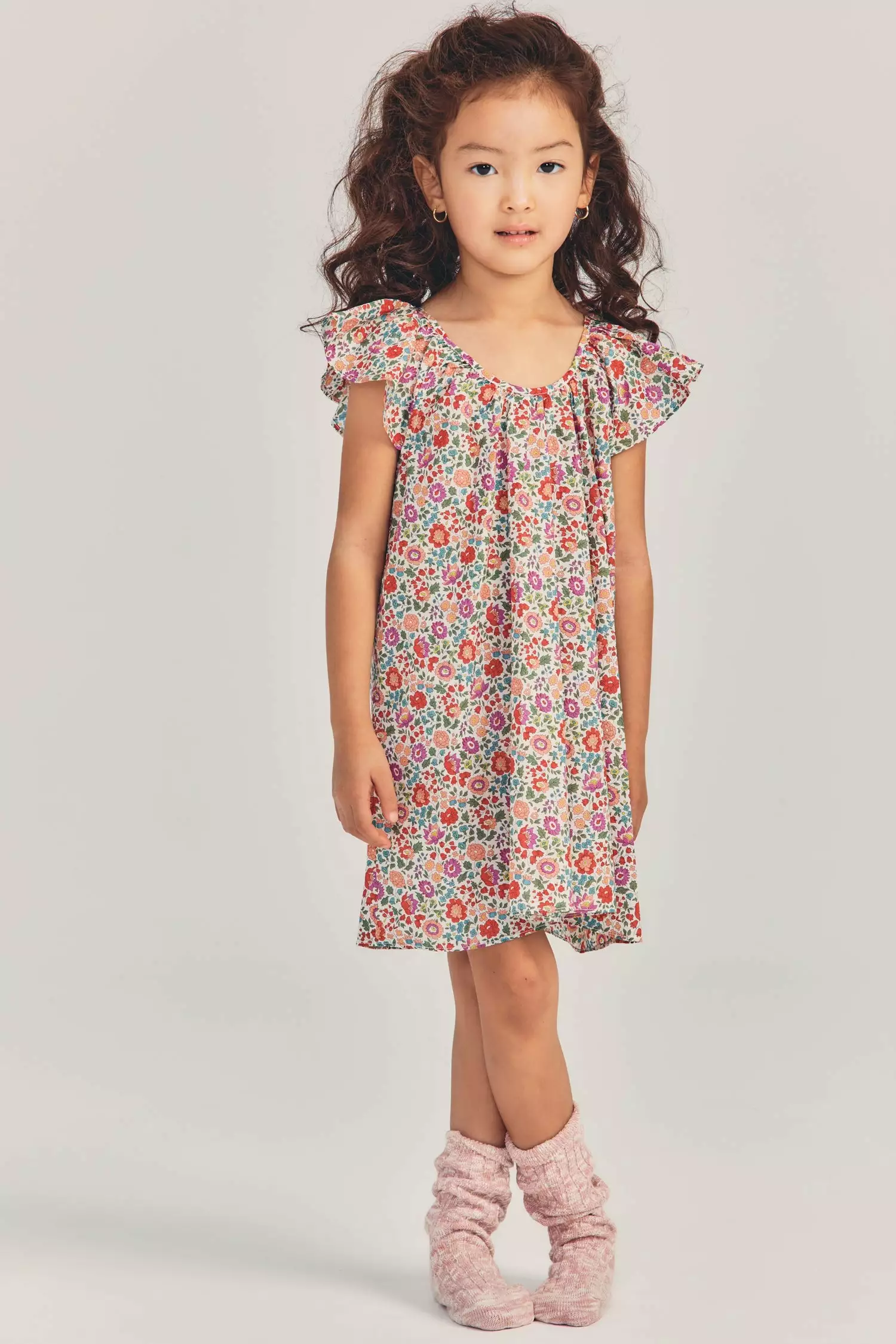 Skip along in our signature Lou Dress, reimagined in 100% cotton. A simple shirred circle neck is framed by flutter sleeves. The roomy bodice falls to a sheath silhouette, stopping above the knee.