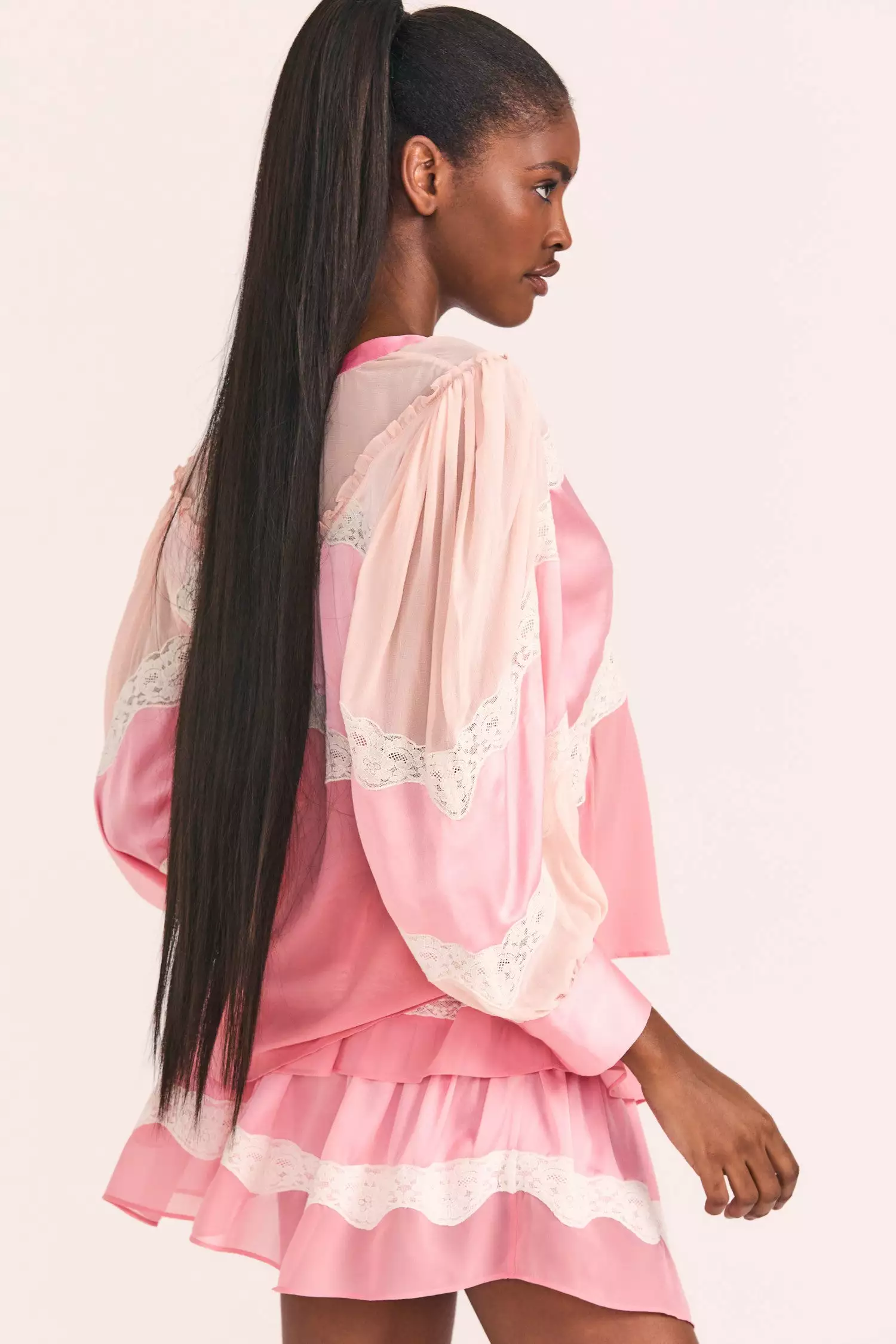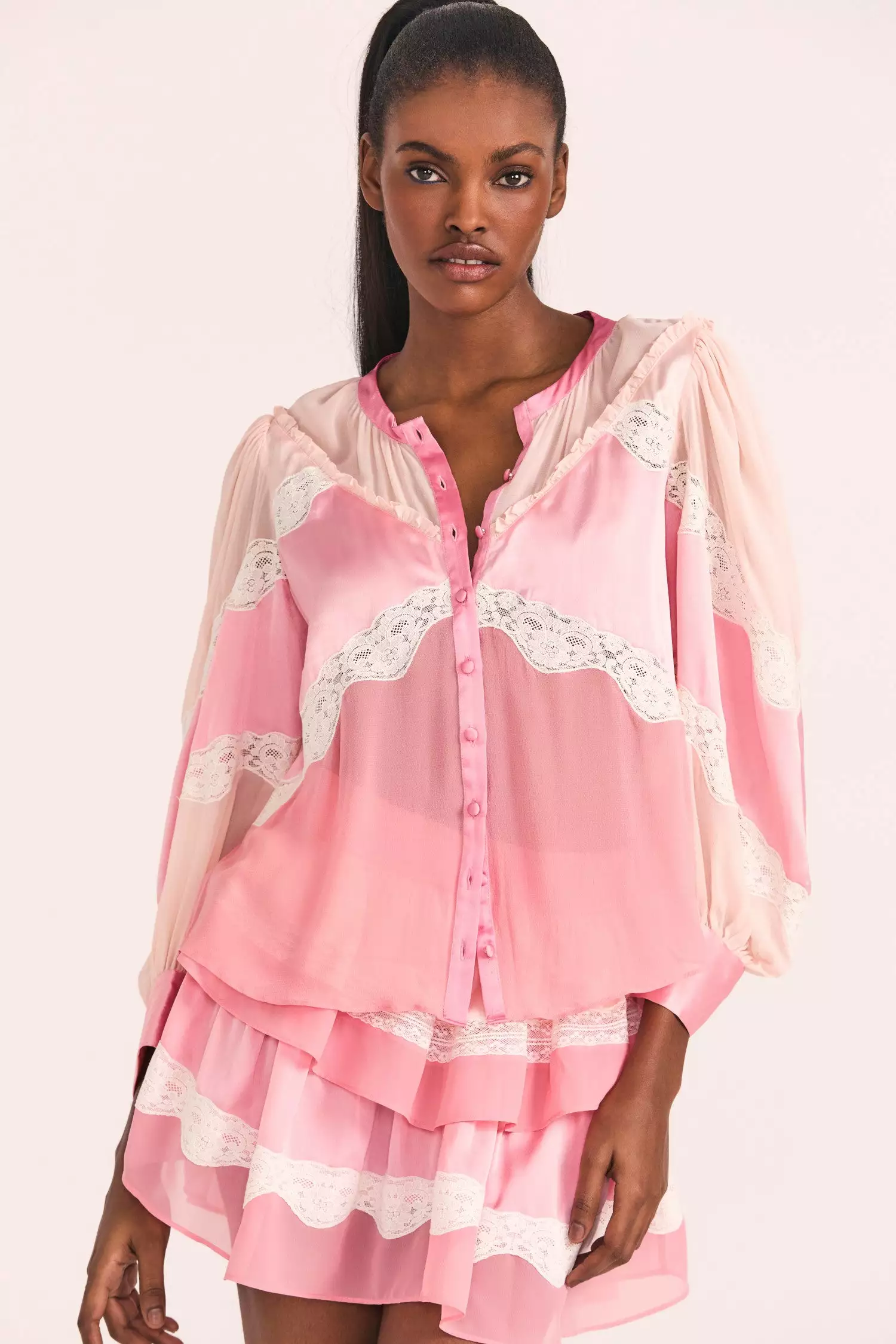Our new Zavia Blouse is pretty in pink with color-blocked shades bordered by custom floral lace panels. This boudoir-style button-down has a circle neck, center front buttons, a ruffle detail angling down from the shoulders and generous blouson sleeves with functional cuffs at opening. Wear it as a set with our Fia Mini Skirt. Shown here in Pastel Pink Colorblock.