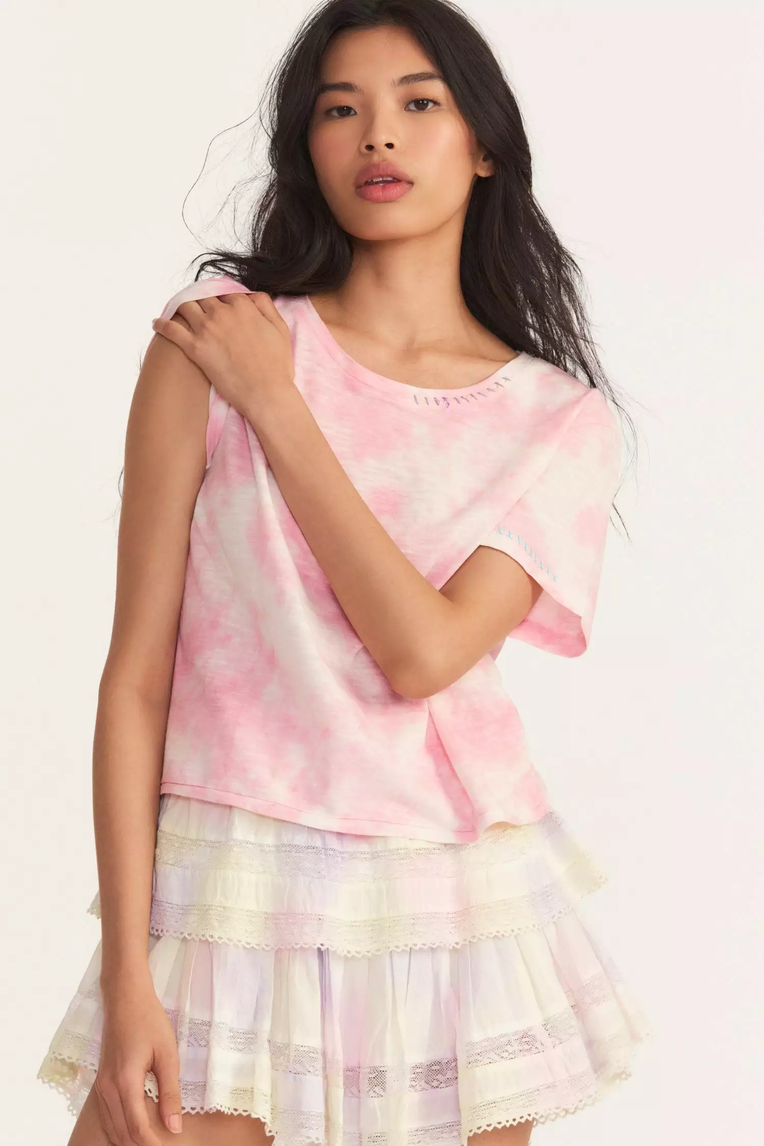 Our Calix Tee returns, your favorite t-shirt is back in 100% pink hand tie-dyed cotton with distressed edges. This easy top has a loved look with its classic scooped crewneck, short sleeves and relaxed fit. Wear it with our Ruffle Mini Skirt. Shown here in Millennial Pink Hand Dye.