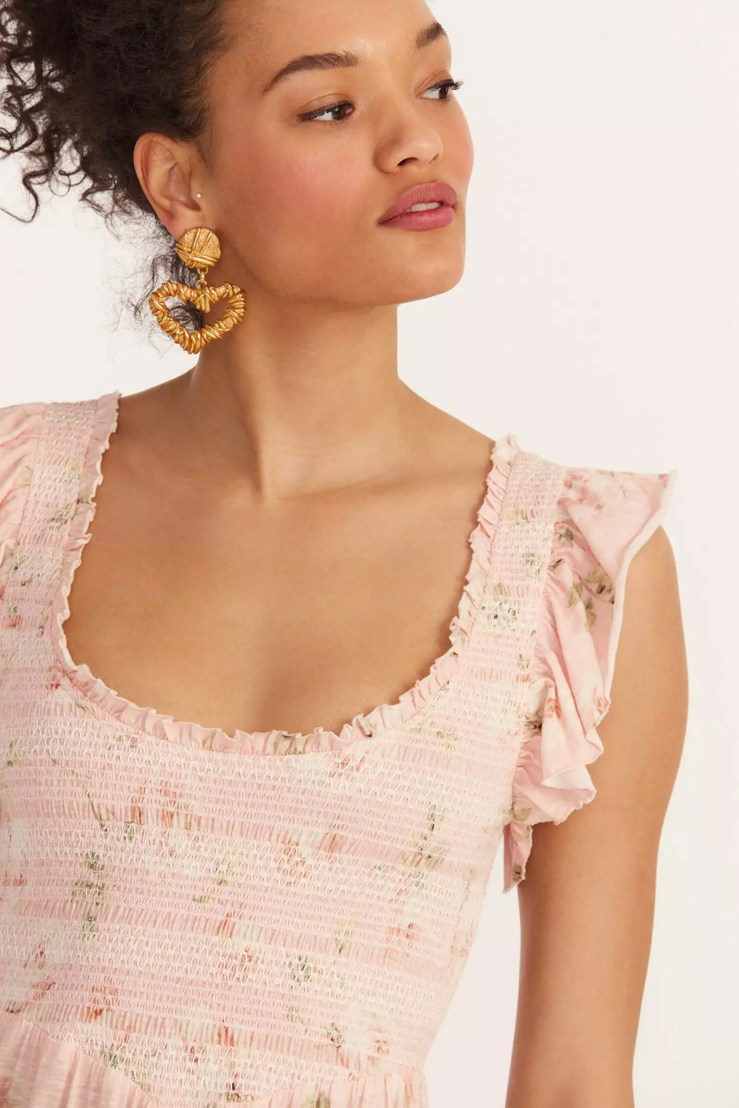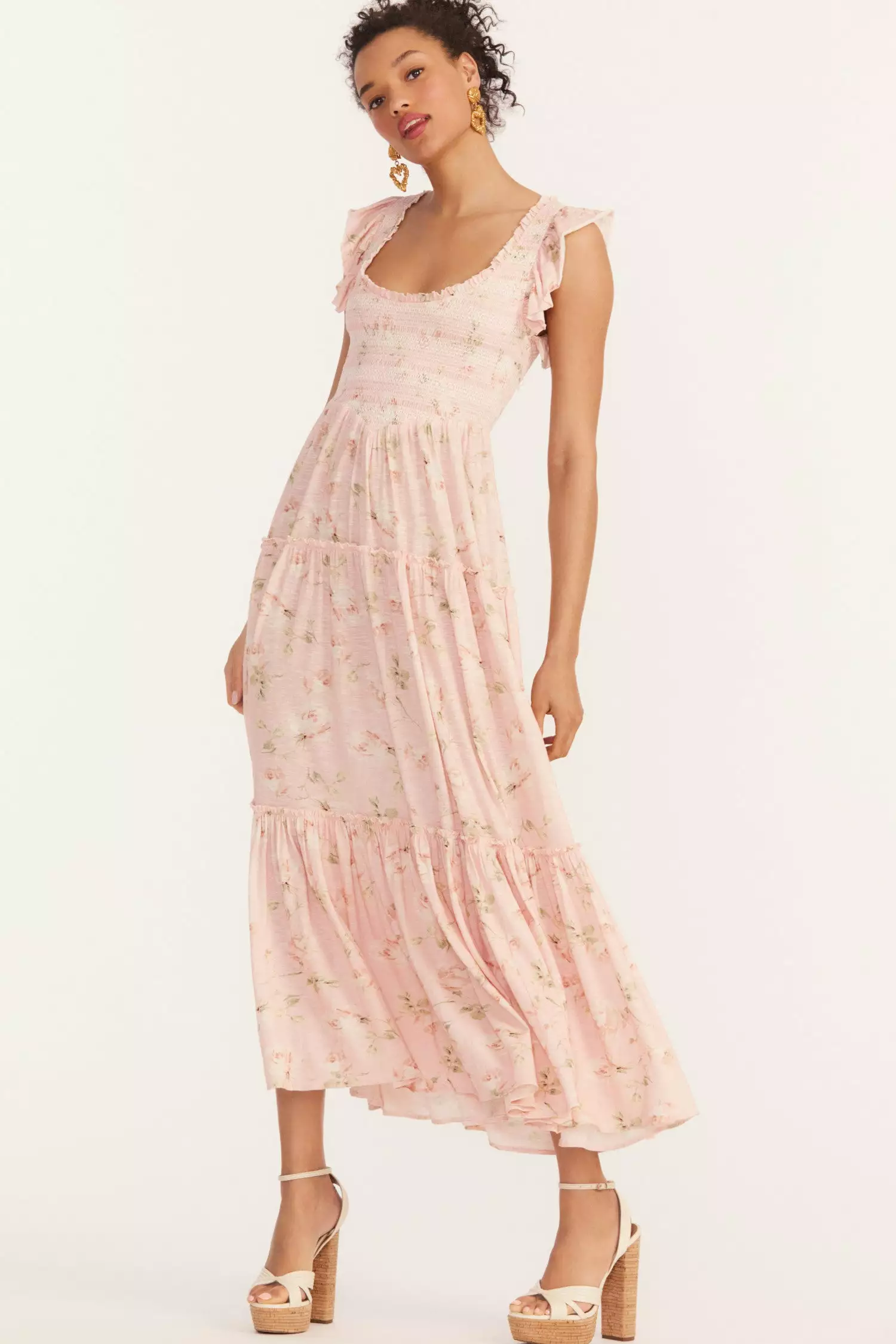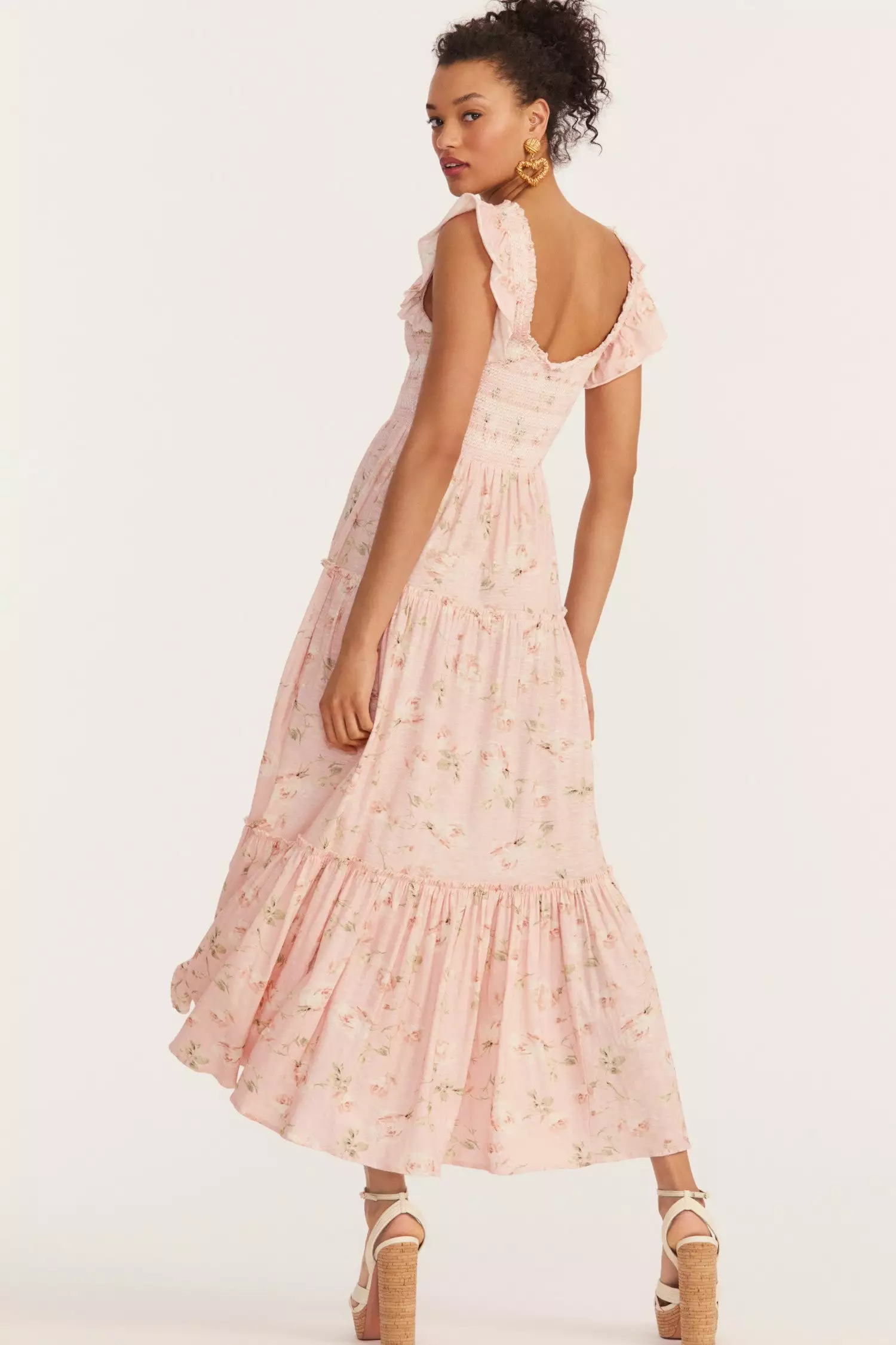 Falling in love with our new Chessie Maxi Dress in our new victorian rose, hero print of the summer. This daytime frock has a smock bodice with a scoop neck and ruffled-adorned straps. The three-tiered skirt falls into a full sweep with ruffles. Shown here in Ballet Pink.