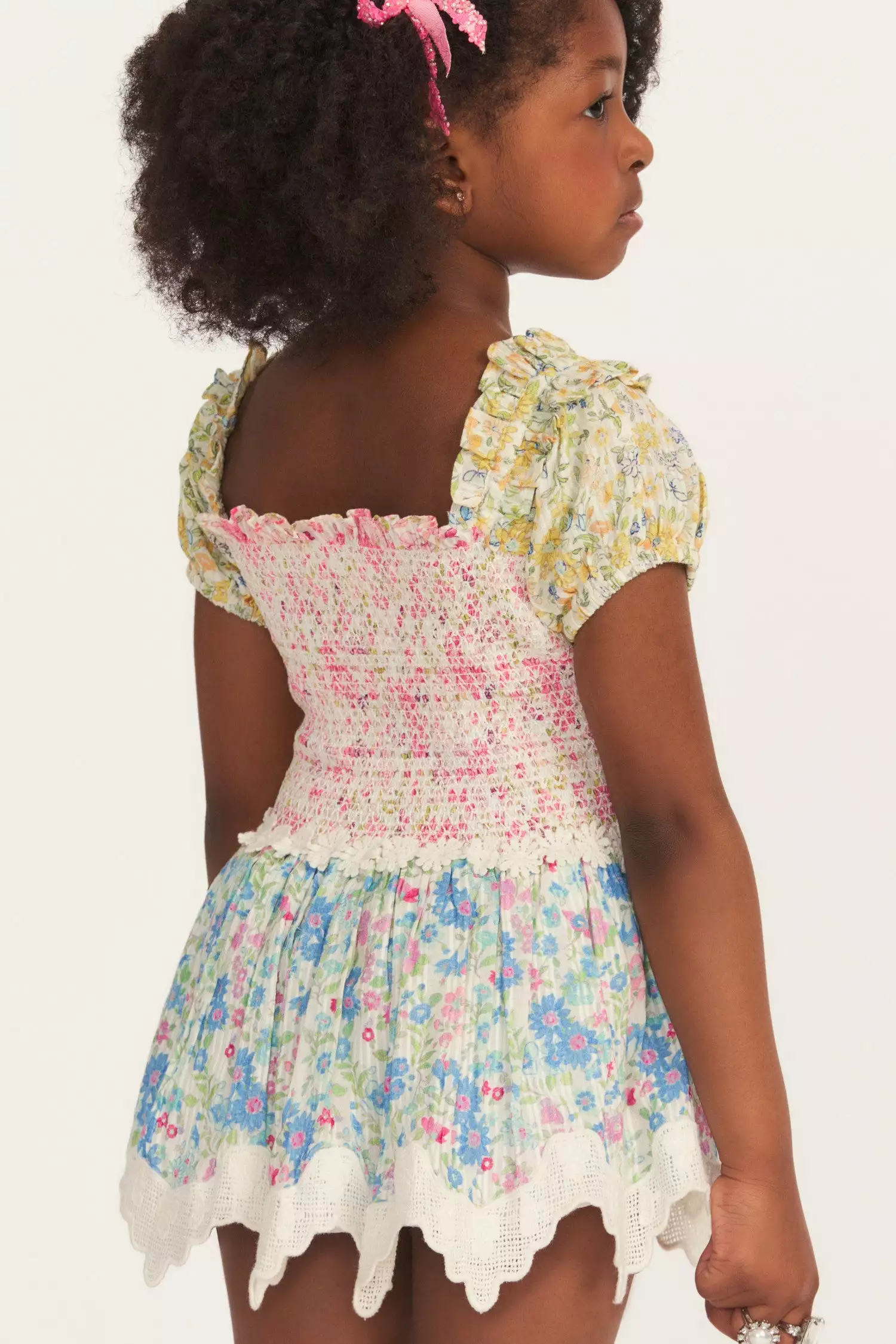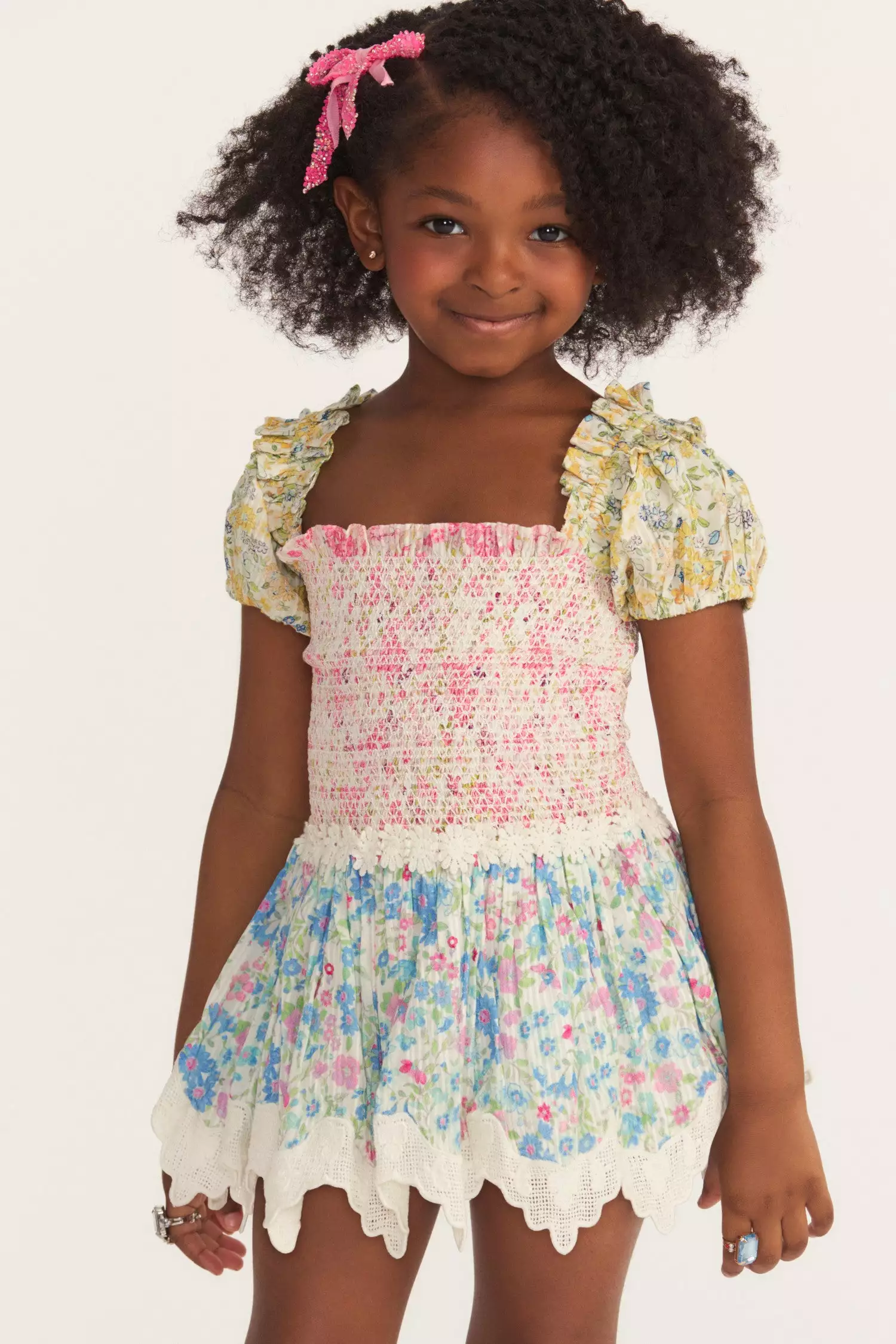 Blossom into summer in our new Mazina Dress with a multi-colored daisy print. This easy frock has a square neckline framed by double puff sleeves, a smocked top, a daisy-adorned waistband and a shirred flounce skirt. Shown here in Fruity Punch Colorblock.
