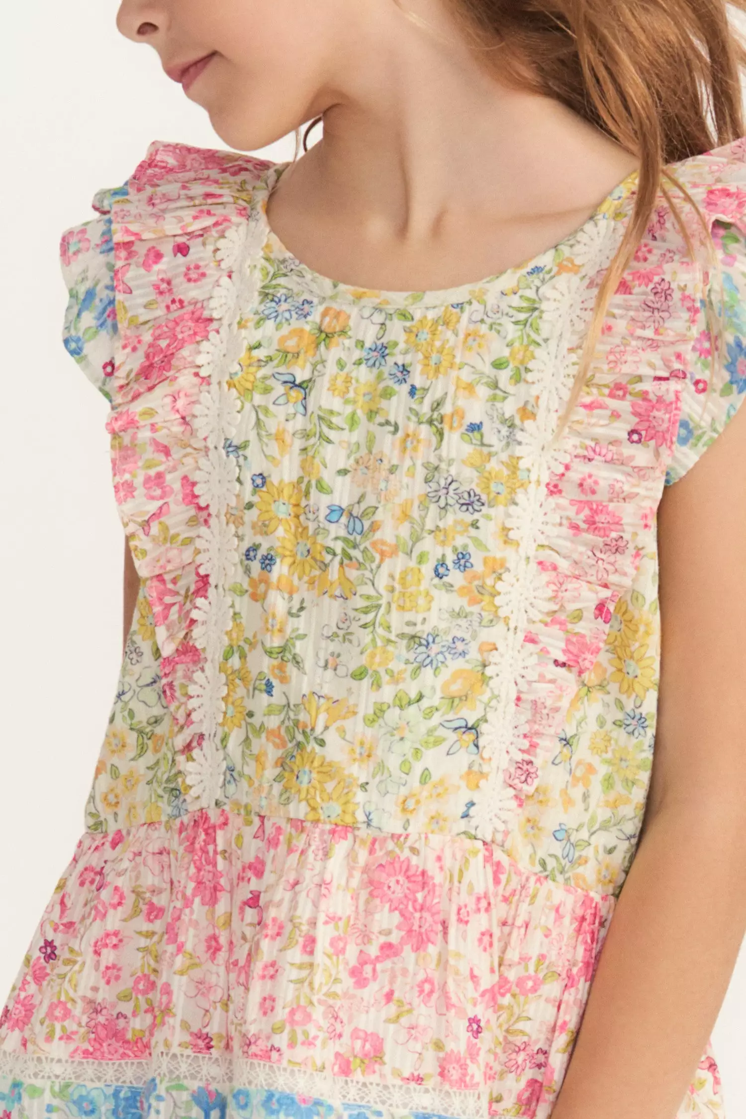 Our Sylvie Dress returns in an outgoing havana colorblock printed cotton. Two-tiered ruffles line the princess seams, creating flutter sleeves. This loose fit frock has a drop waist, which lets out to a gathered skirt with inset lace details. Shown here in Fruity Punch Colorblock.