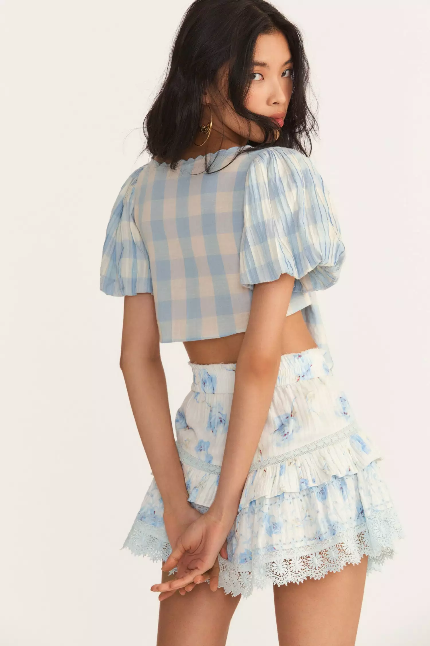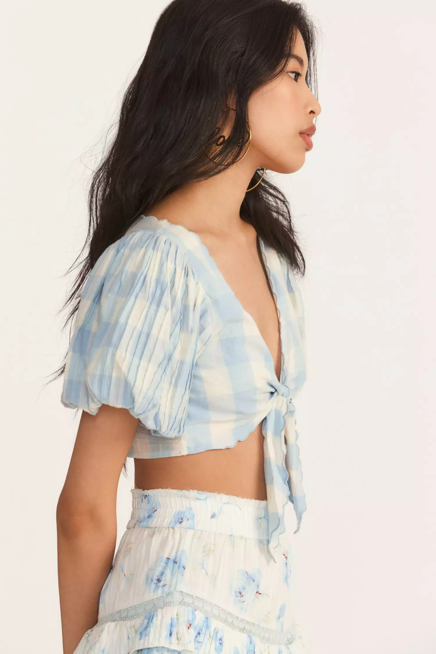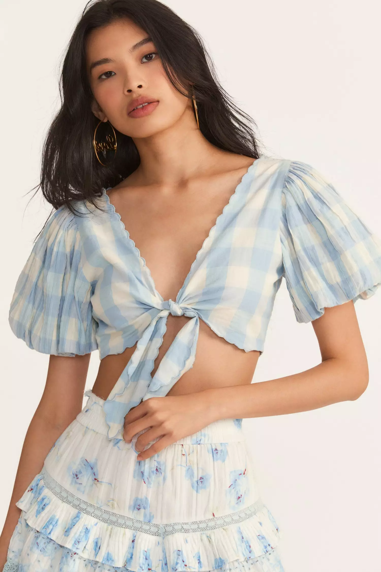 Heating up for our Hanover Crop Top in 100% cotton with our picnicesque Lido Check print. This fun crop features scalloping at the hem and neck, a functional tie at front, airy exaggerated sleeves with tucking and elastic opening. This top comes lined at the front and unlined at the back.Β Pair with our Ruffle Mini SkirtΒ or Bellarose Maxi Skirt. Shown here in Blue Patriot.