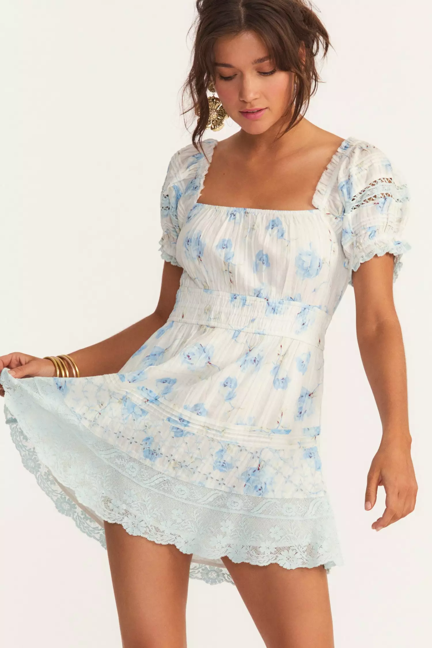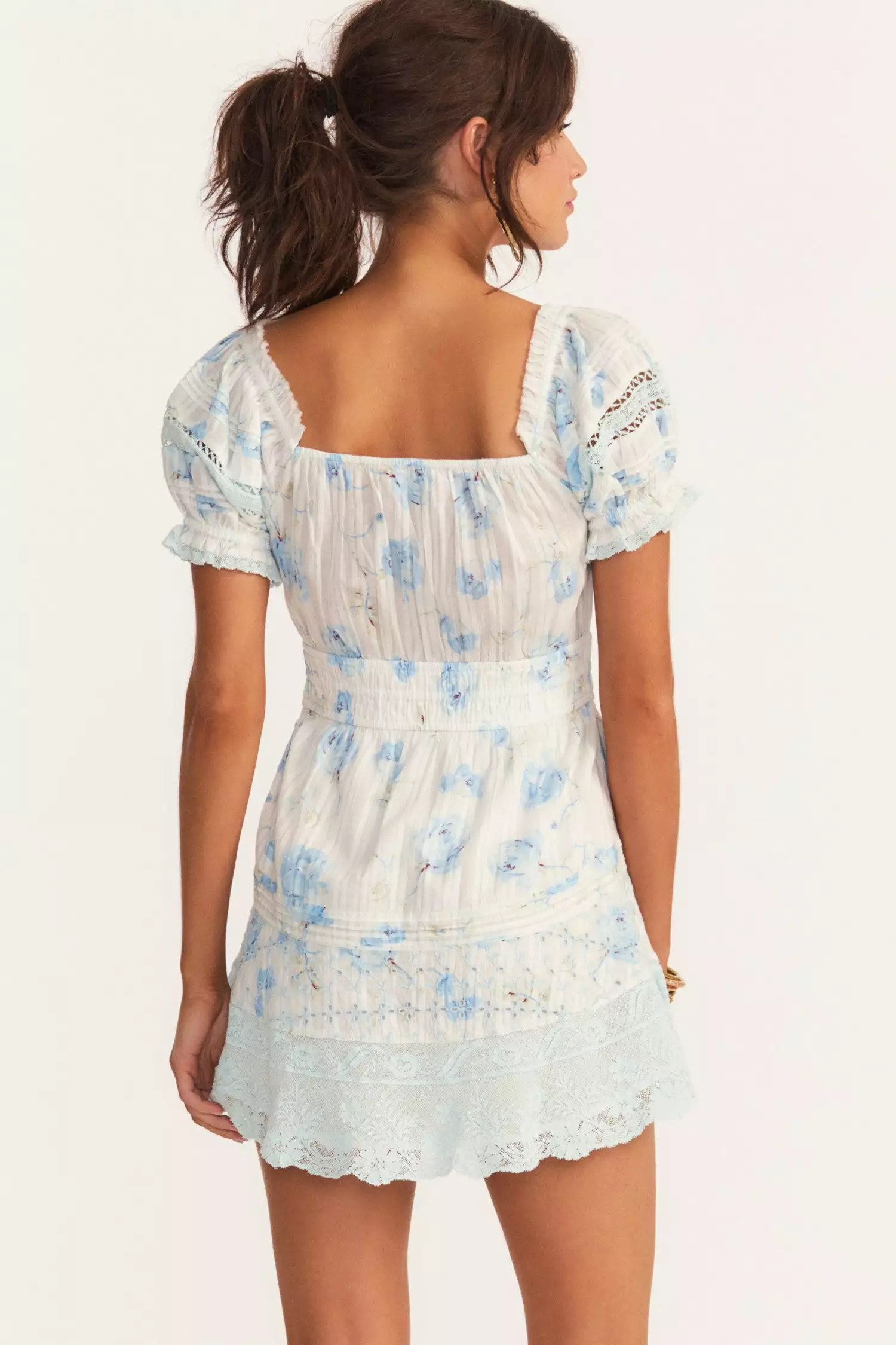 All the afternoon delight in our Lilium Dress in 100% cotton with our rowboat hero print. A hero Victorian, this mini dress features encased elastic tunnel at the waist and the shoulders for an on or off the shoulder detail. Custom, schiffli embroidery and wide laces adorn the dress with side seam pockets. Shown here in the Santa Rosa River.