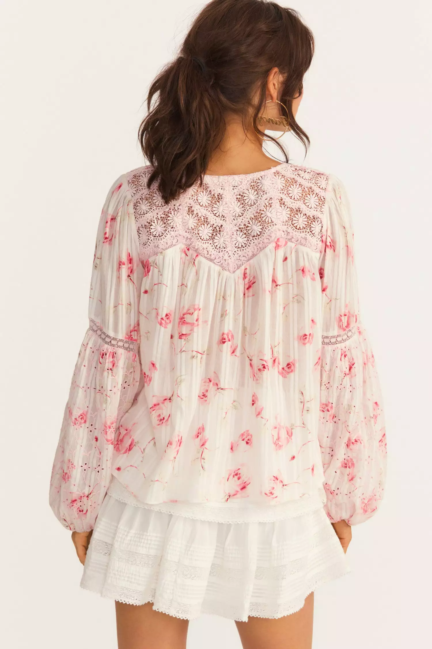 The Lillith Blouse stuns with a full sweep and elongated, mature shape in our cotton dobby, hero rowboat print. This dreamy top features custom embroidery on the sleeves along with an elastic opening on both. Wear it with our Ruffle Mini Skirt. Shown here in Cherry Soda.