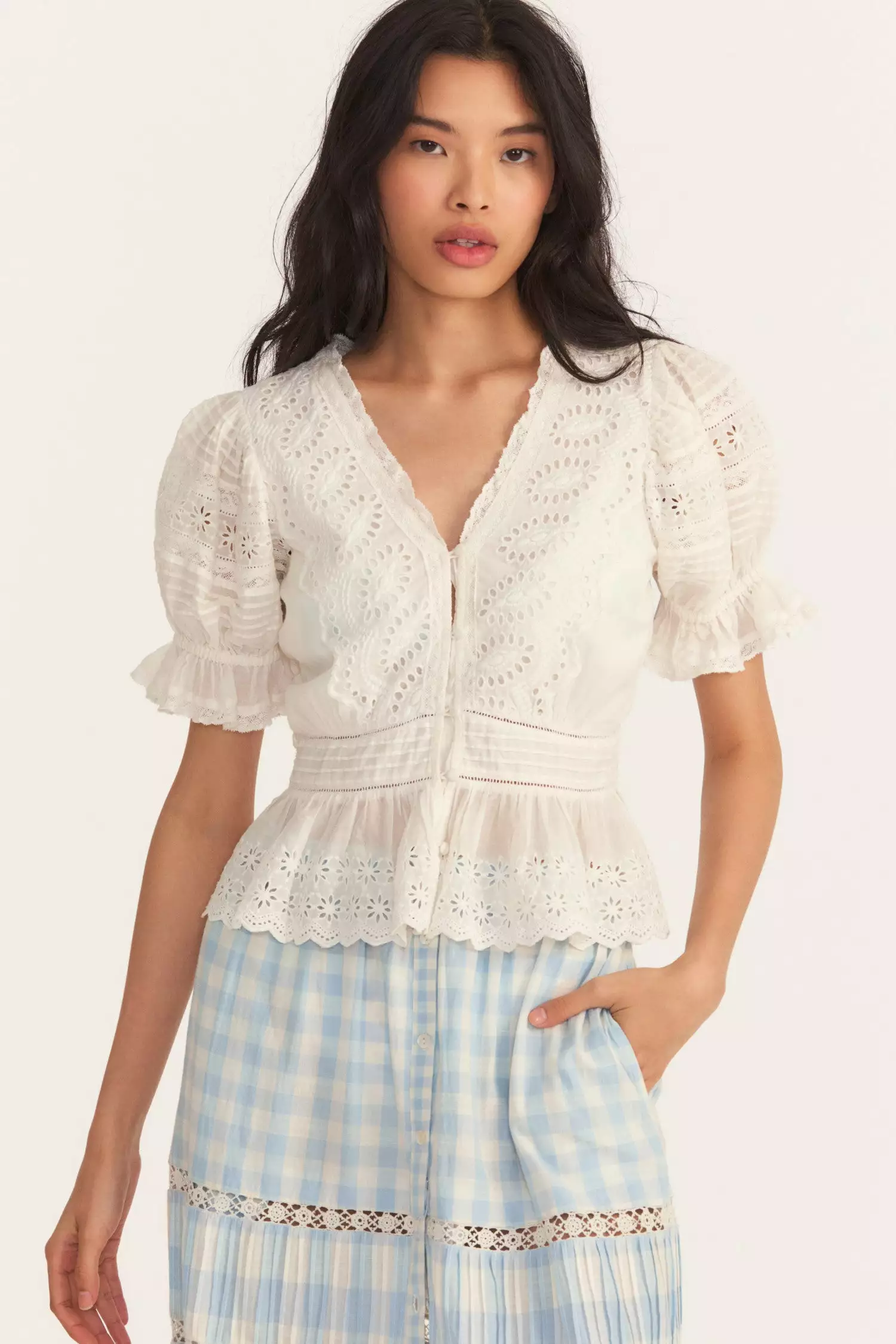 The Annalee Top stuns in 100% cotton. This blouse features an intricate, schiffly eyelet detail with custom lace tucking. Short, blossomed sleeves add a touch of delight with a buttoned bodice to the bottom of the top. Pair with our Jimena Skirt. Shown here in Ivory.