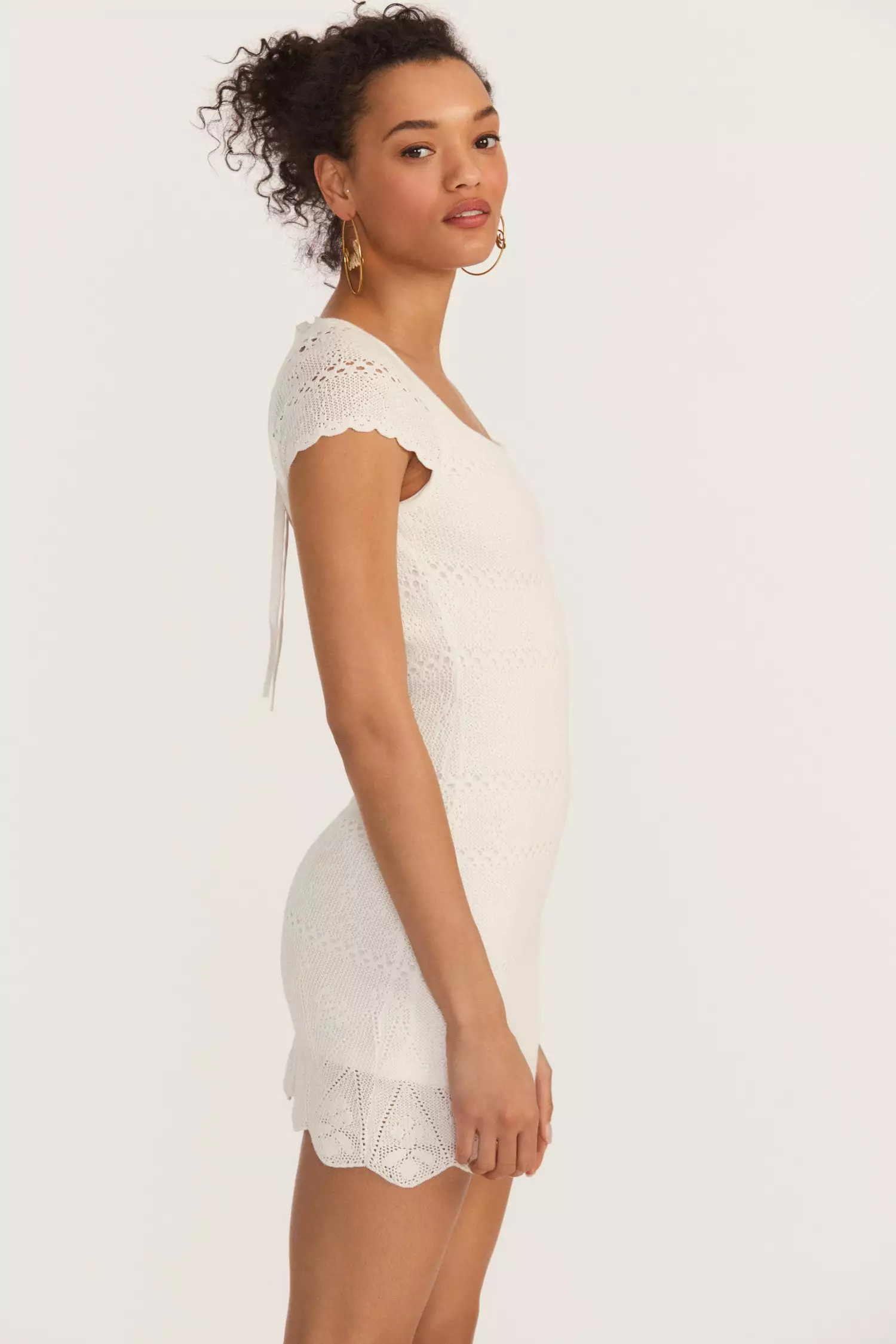 Loveley always in our Elvirie Mini Dress. This vintage-lace inspired mini dress features abstract, floral pointelle detailing, playful zig-zag stitch, cap sleeves and fastens in the back with a tie around the upper neck.Β