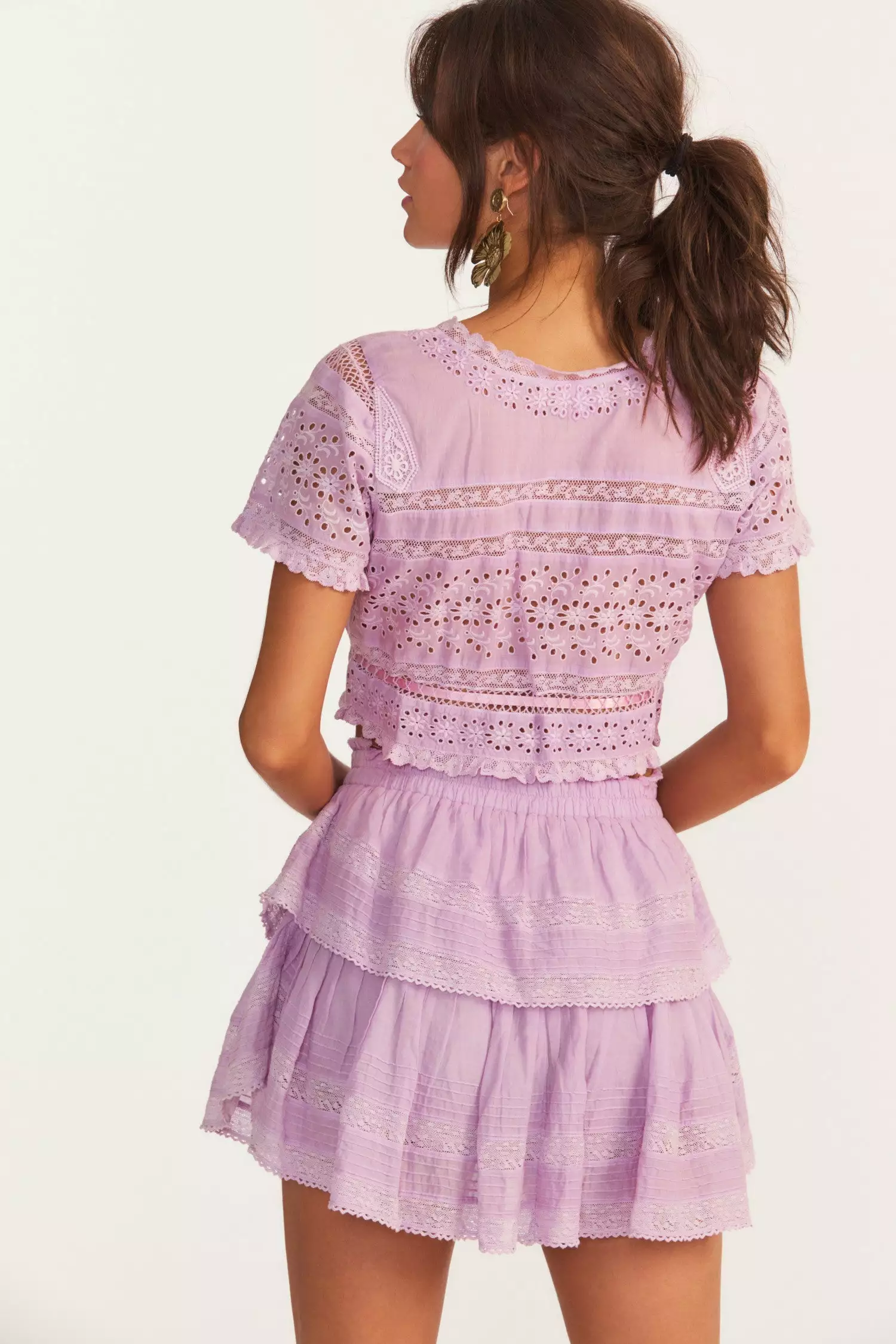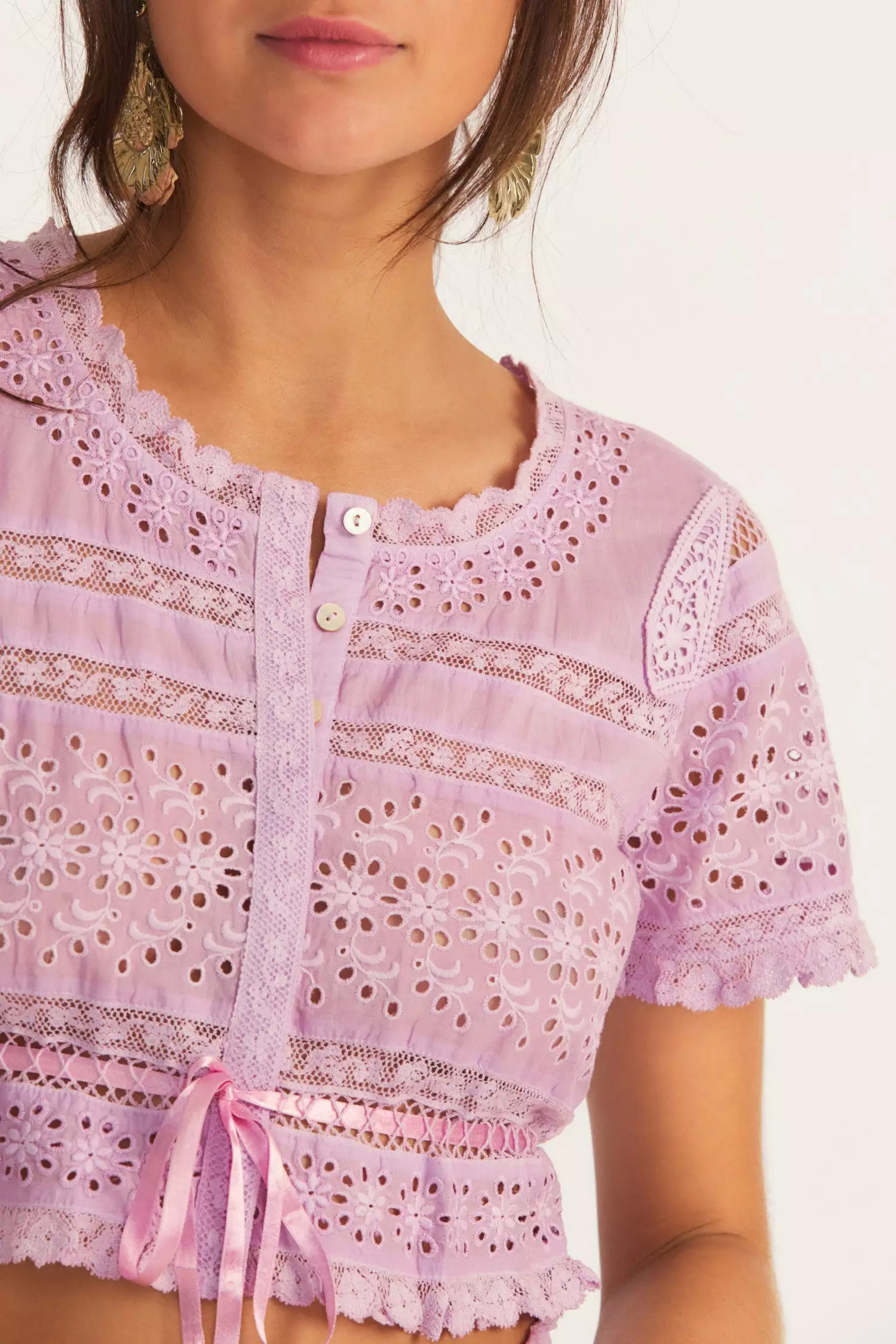 New this season, our Farley Crop Top arrives in 100% cotton with custom inset laces. This pretty top has a square neckline with functional buttons, a satin ribbon tie, sweet short sleeves with lace trim and shaped lace cropped hem. Wear it with our Ruffle Mini Skirt. Shown here in Wisteria.