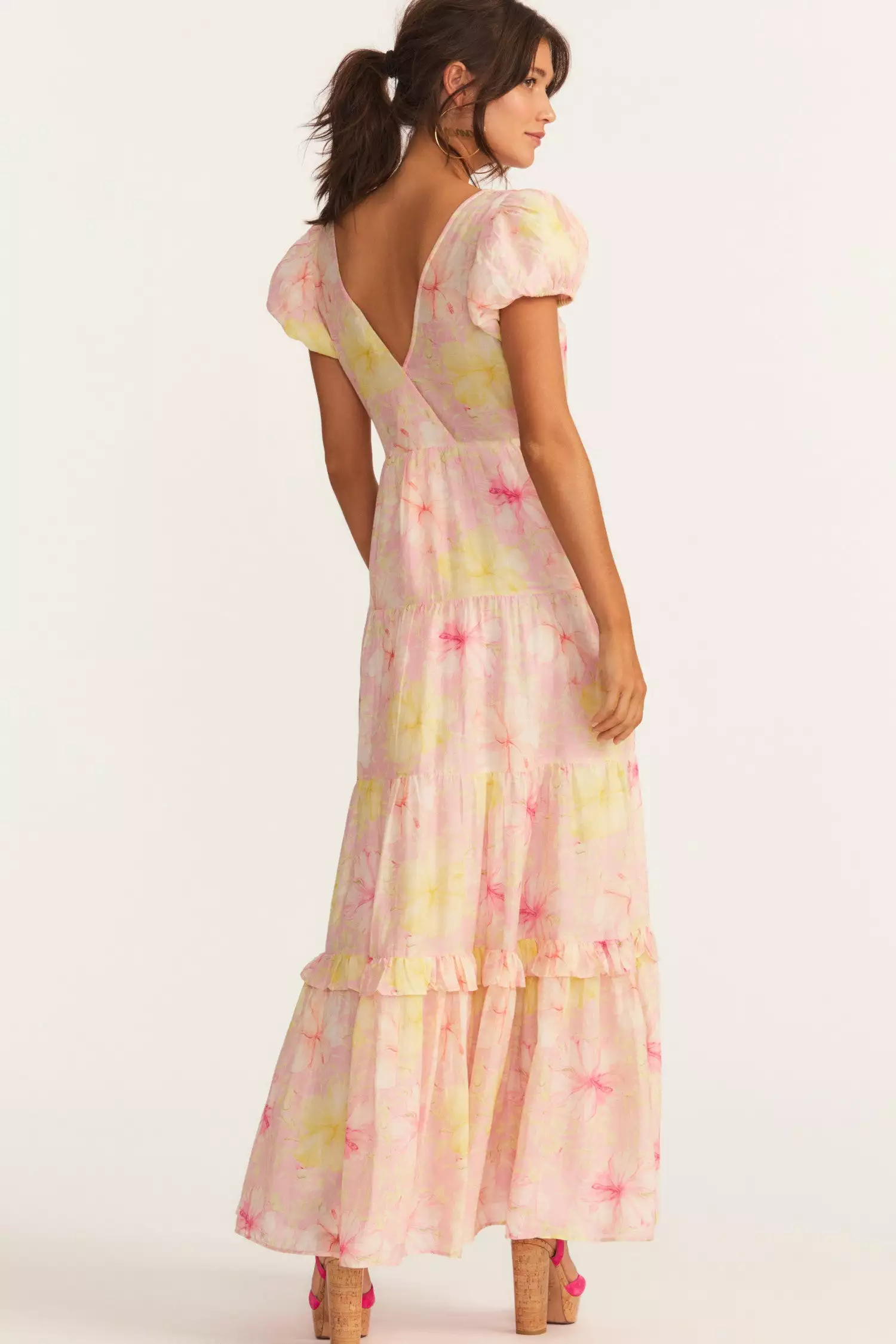 The Karalie Dress smiles in a cotton silk fabric with a hand-painted hibiscus floral print. This maxi has a scoop neck with a deep open back with a v-surplice, exaggerated short sleeves and a fixed waist. Pretty seam details adorned throughout the skirt with pockets and sherring flowing to a ruffle hem. The front bodice is lined while the back is unlined. Shown here in Light Berry Tea.