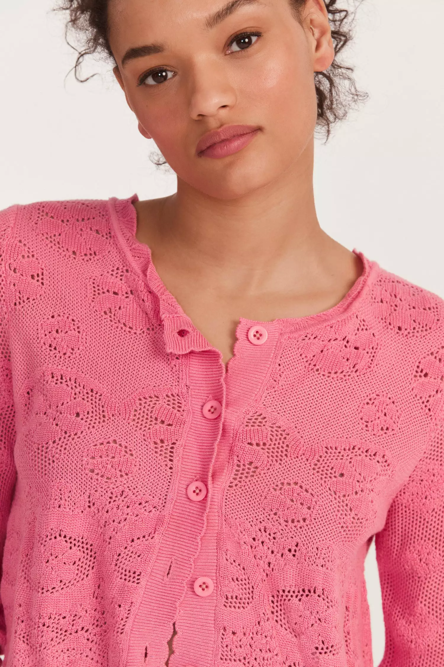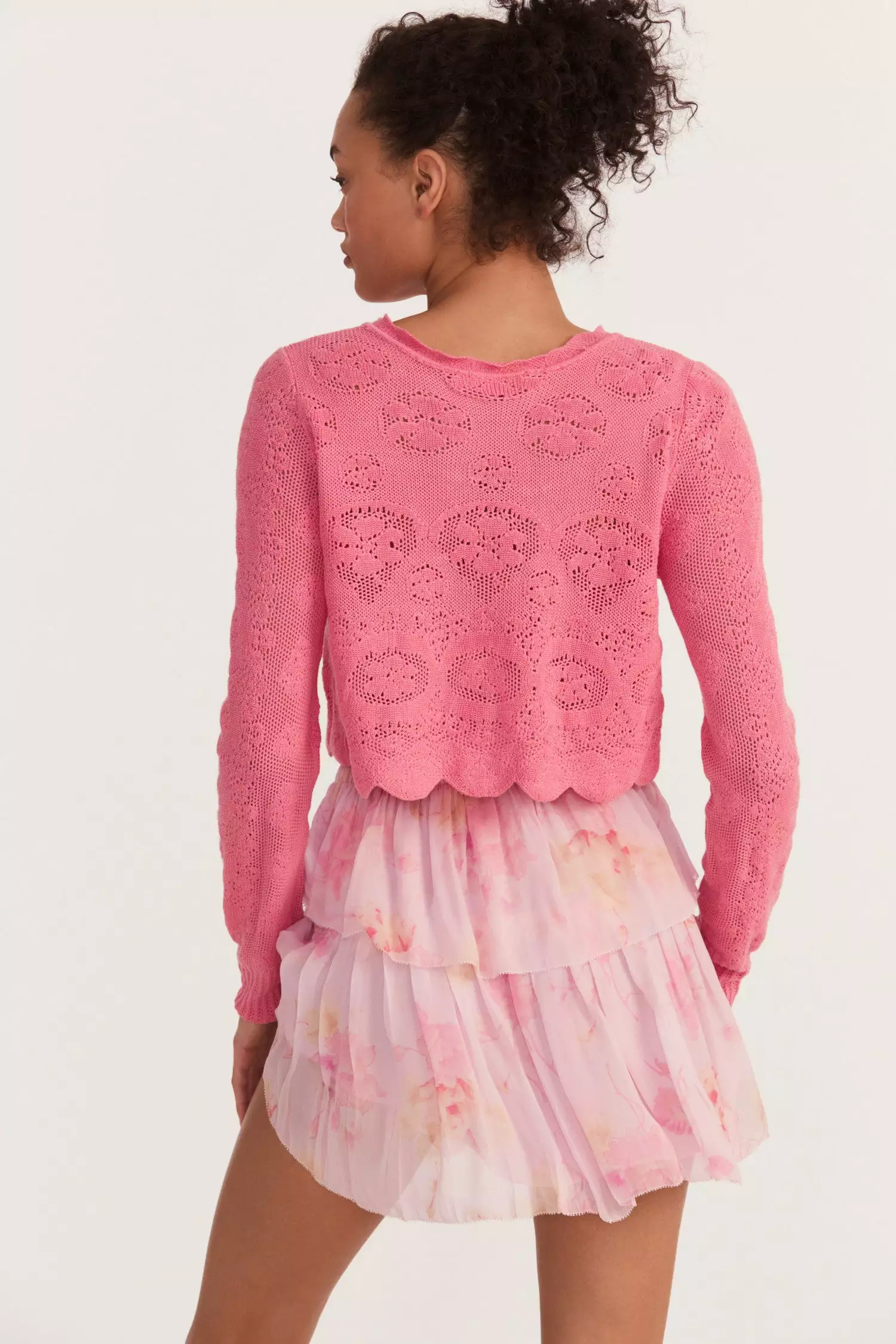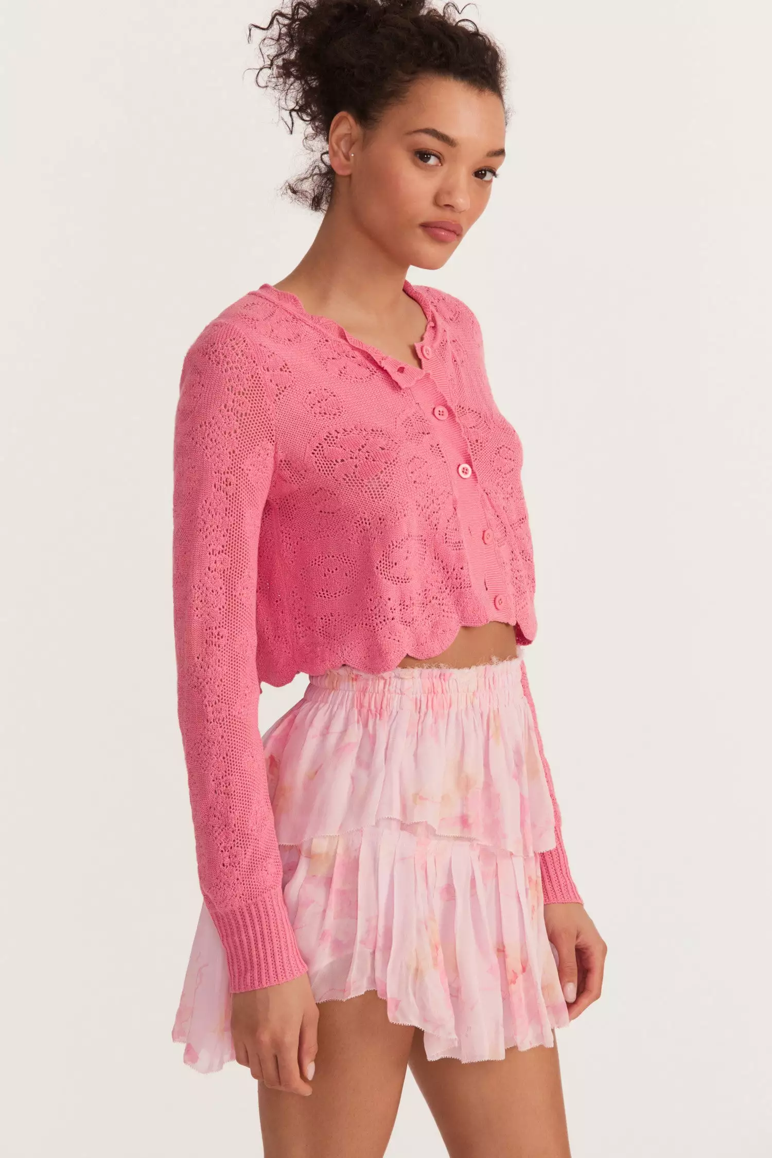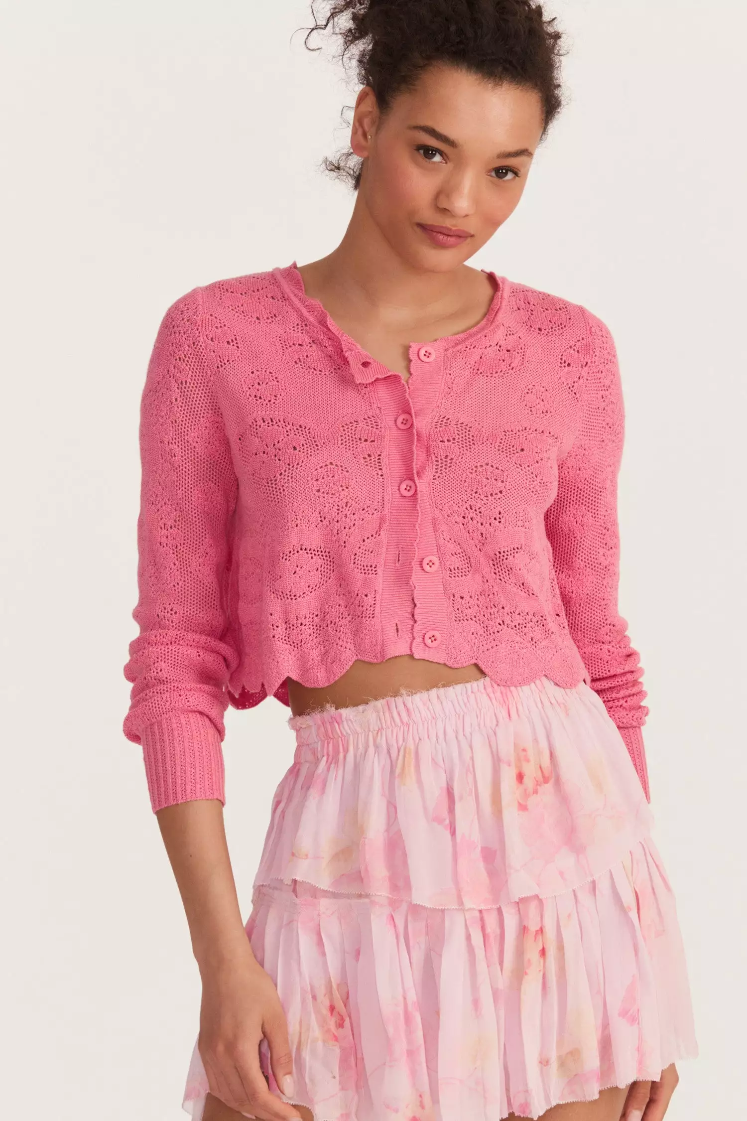 Our lightweight and cozy Muriel Crop Cardigan is an abstract floral pointelle, inspired by vintage lace. This seasonal staple features a soft, scalloping detail around the neckline for an open and airy element. Style it with our Quill Midi Skirt.