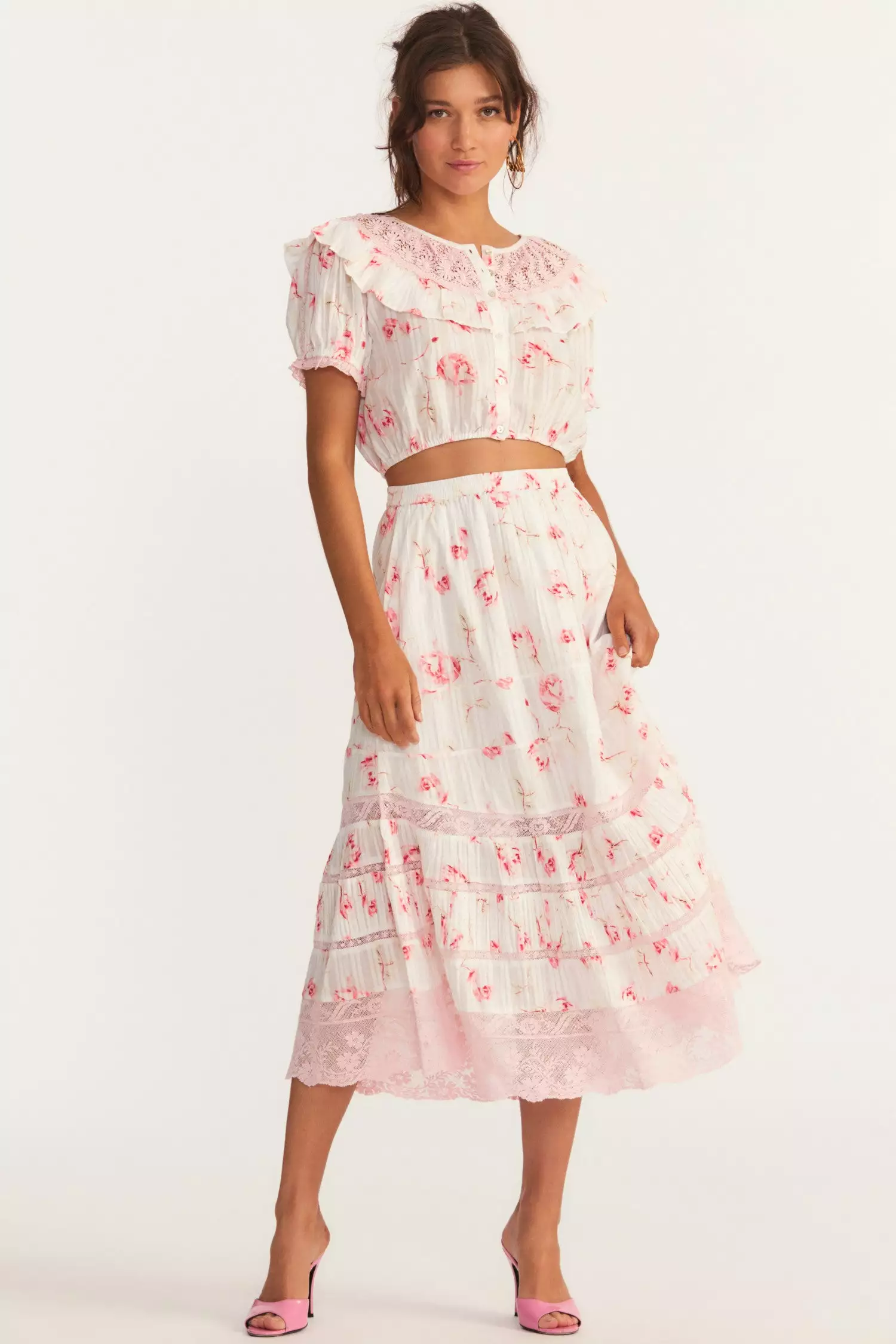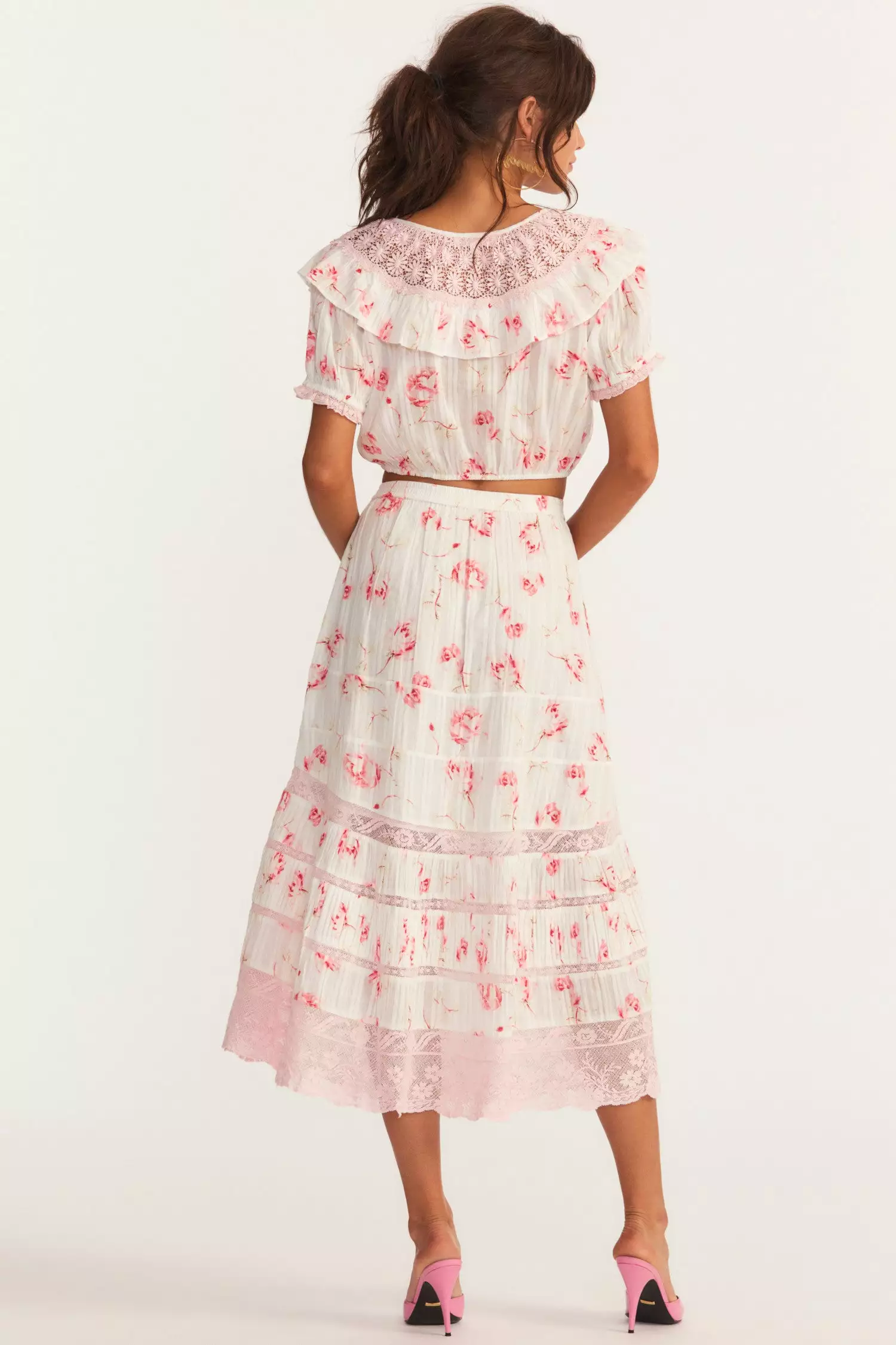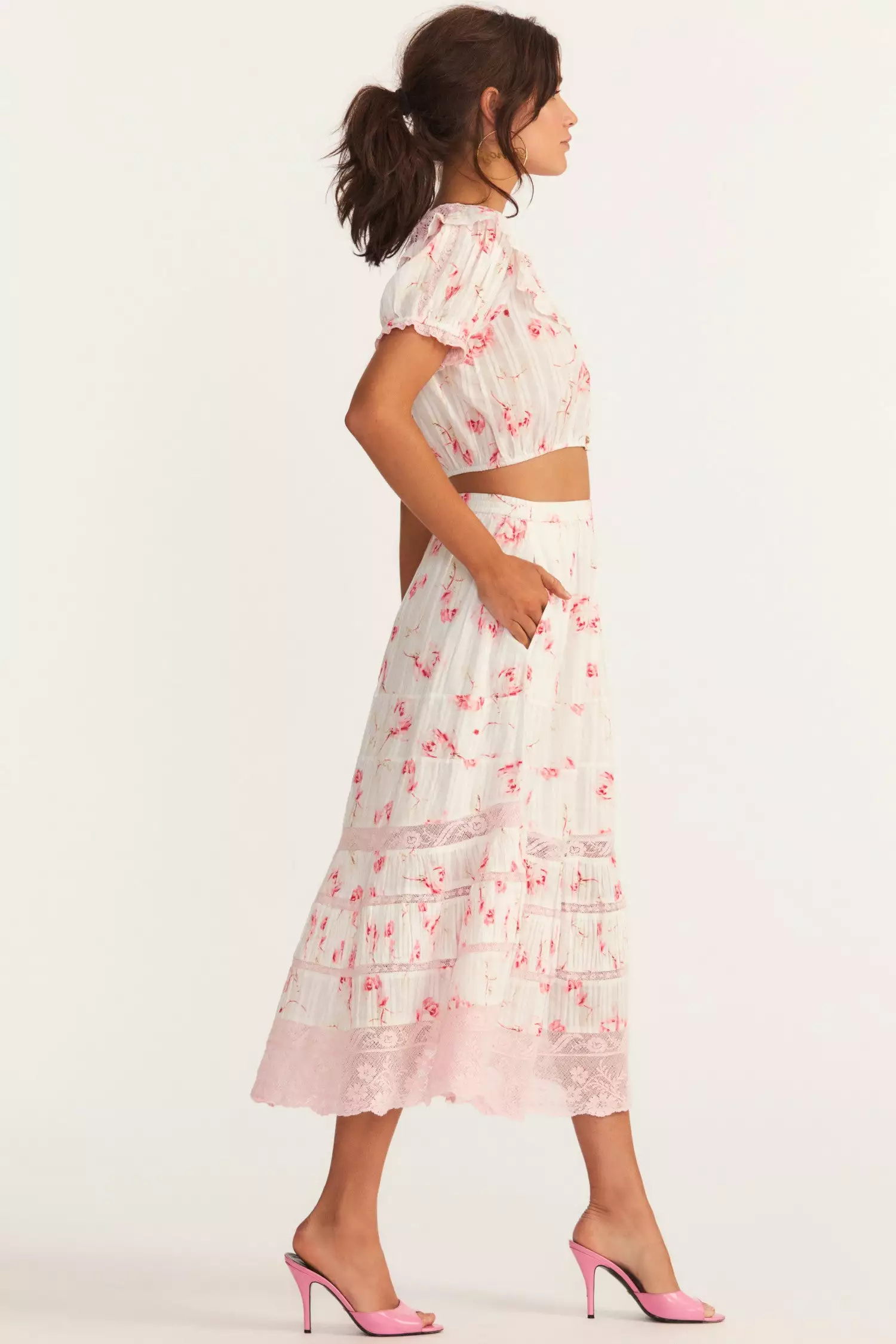 Introducing our darling Quill Skirt in cotton dabby with our hero rowboat print. This midi skirt shines with intricate custom lace detailing and features functional pockets at the front. Wear it as a set with our Elania Crop Top. Shown here in Cherry Soda.